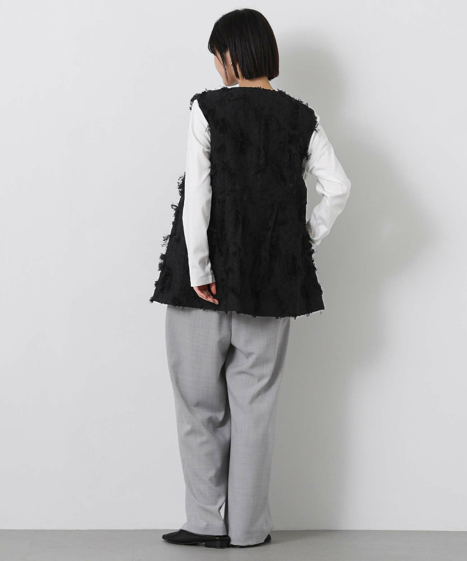 首元はノーカラーにすることで、インナーと合わせやすいデザイン。