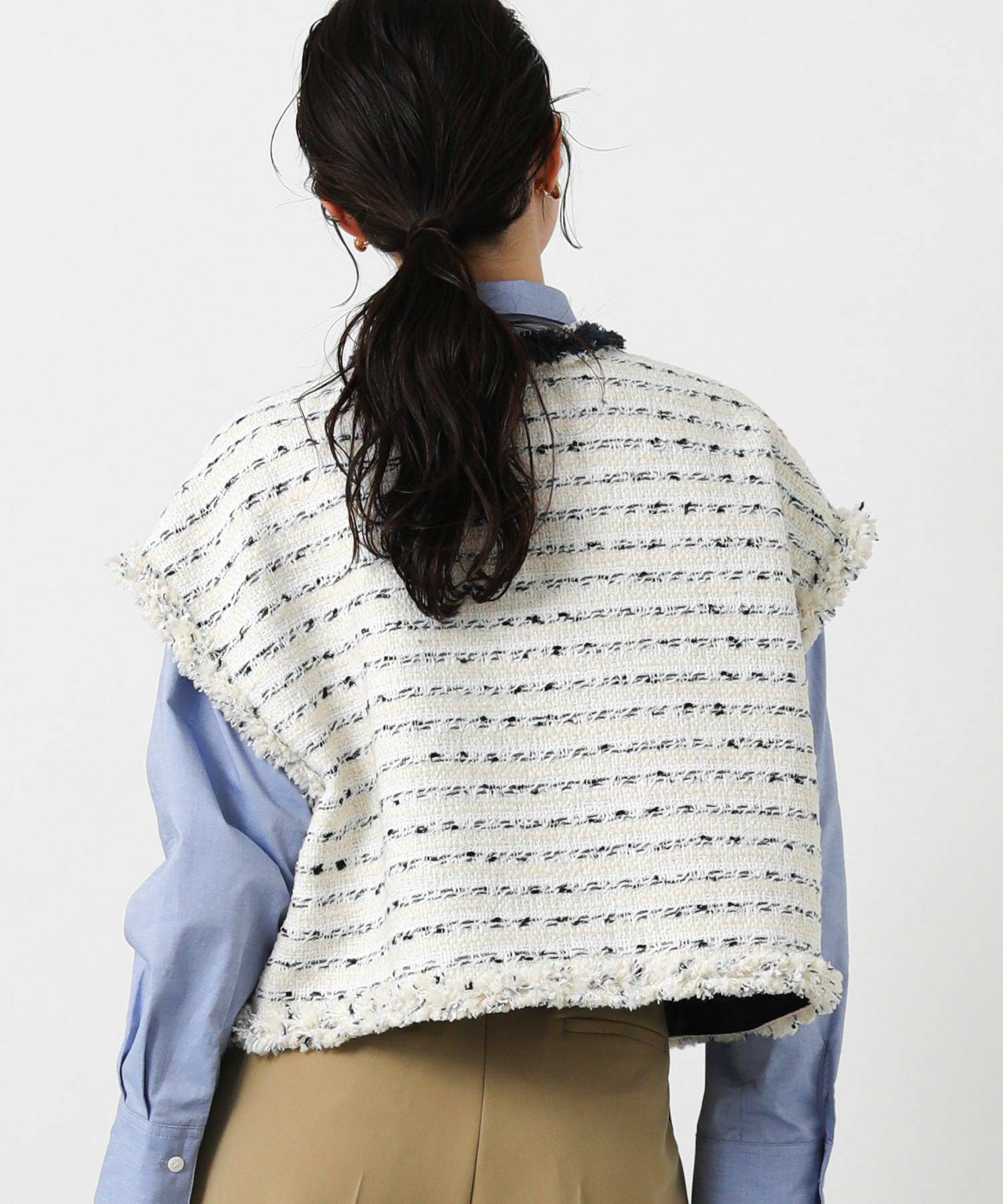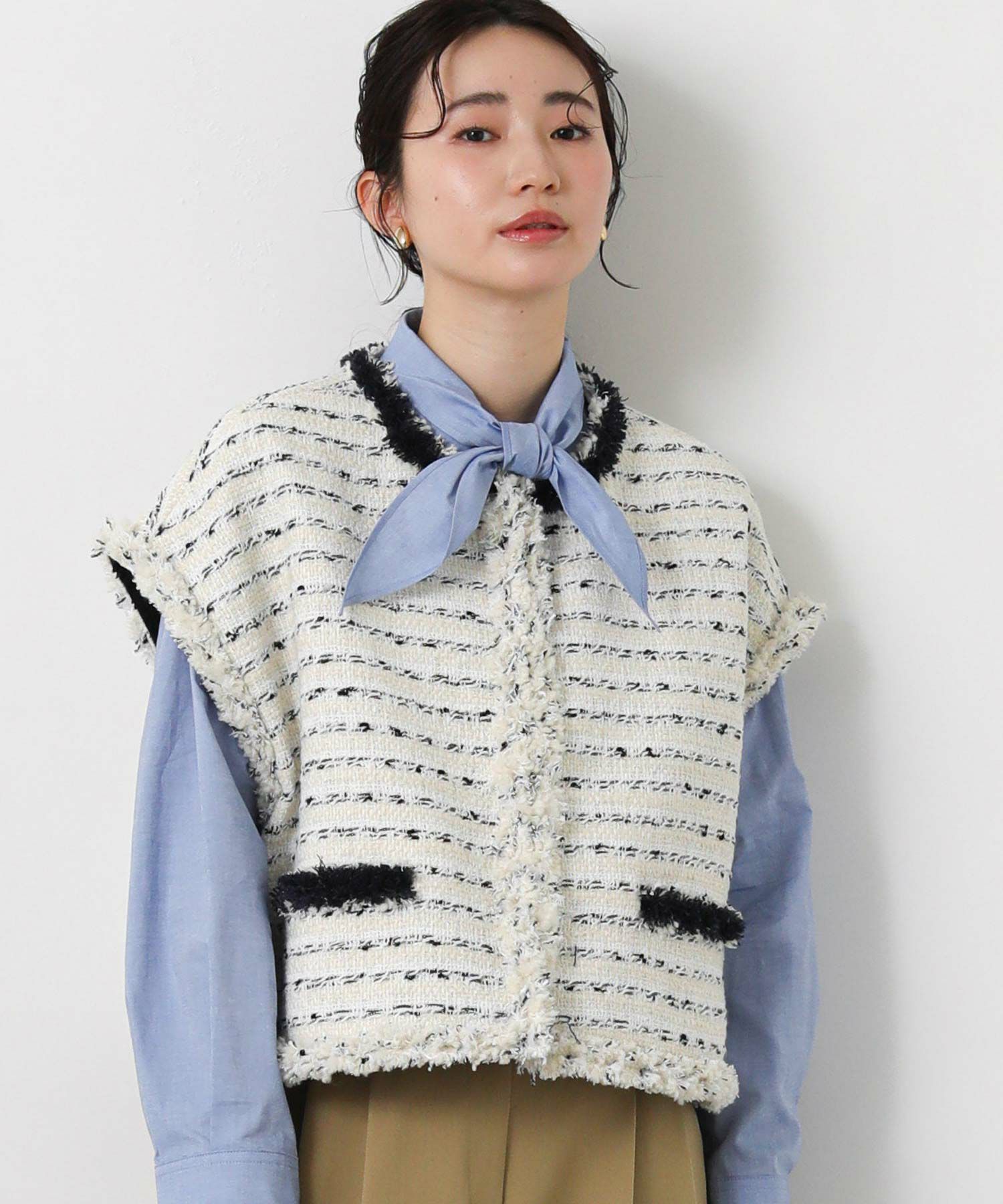 季節を繋ぐアウターとして定番となったジレを、コンパクトなサイジングで新鮮なバランスに仕上げました。
