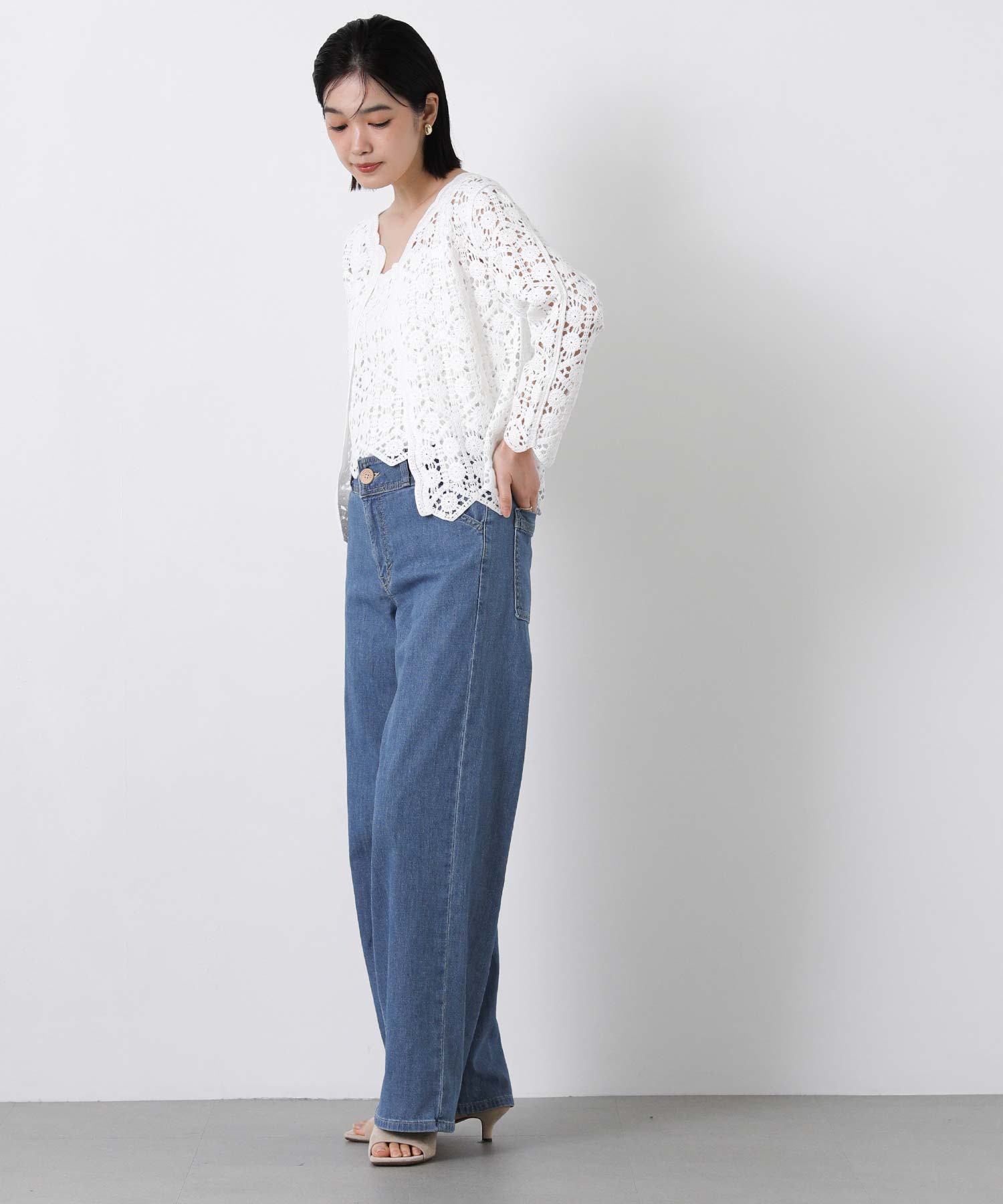 幾何学柄のレースが甘くなりすぎないバランスで、カジュアルなアイテムとのミックススタイルがオススメ。