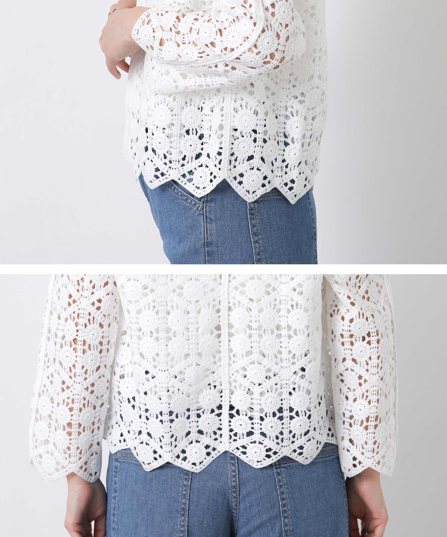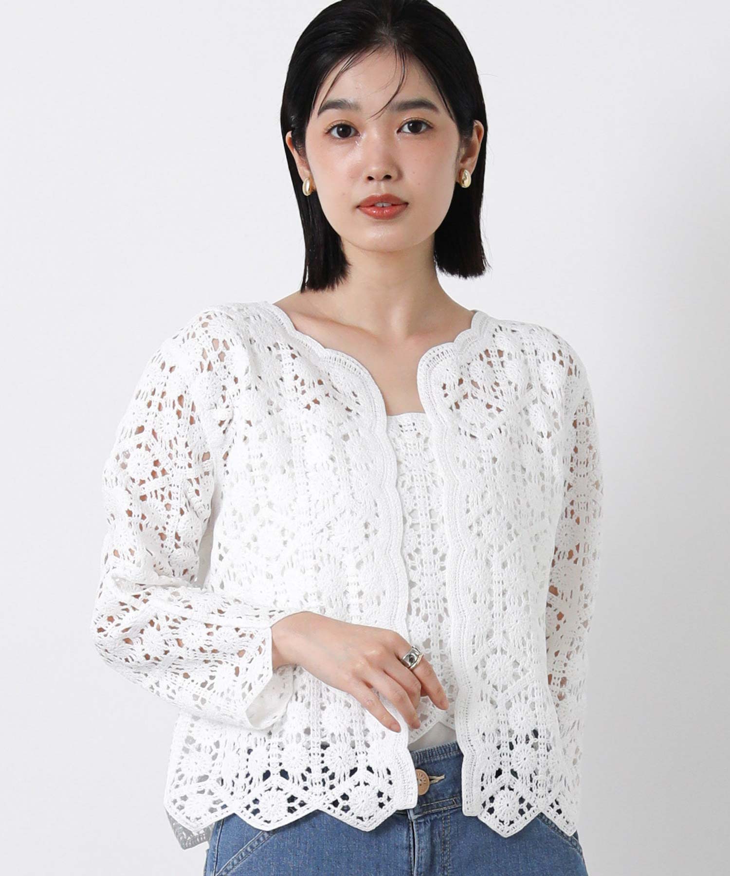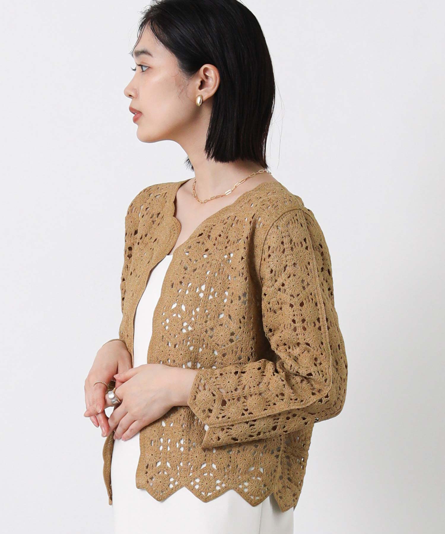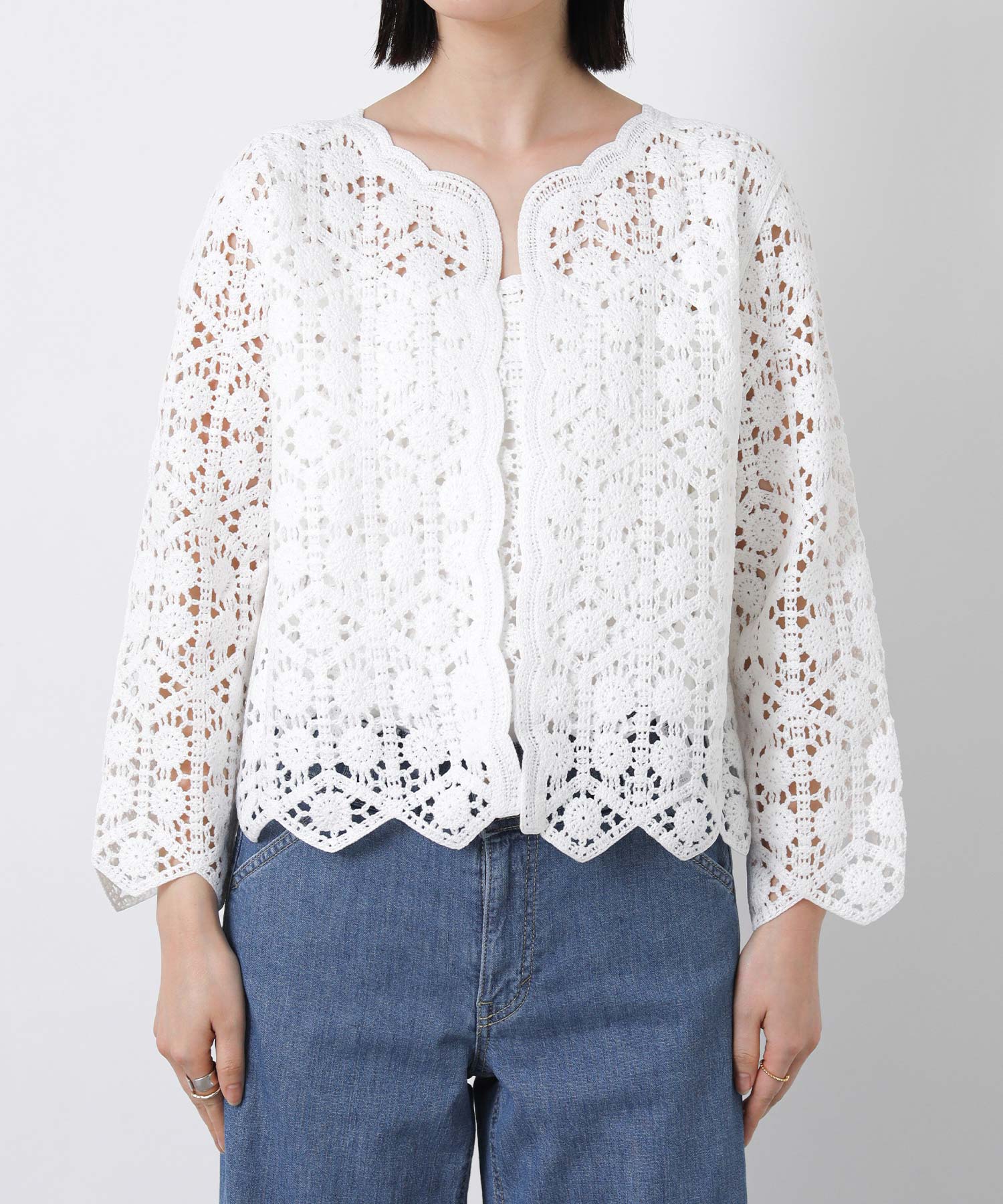 グレディオリジナルの透け感のある柄編みが着映えるレースジャケット。