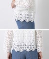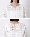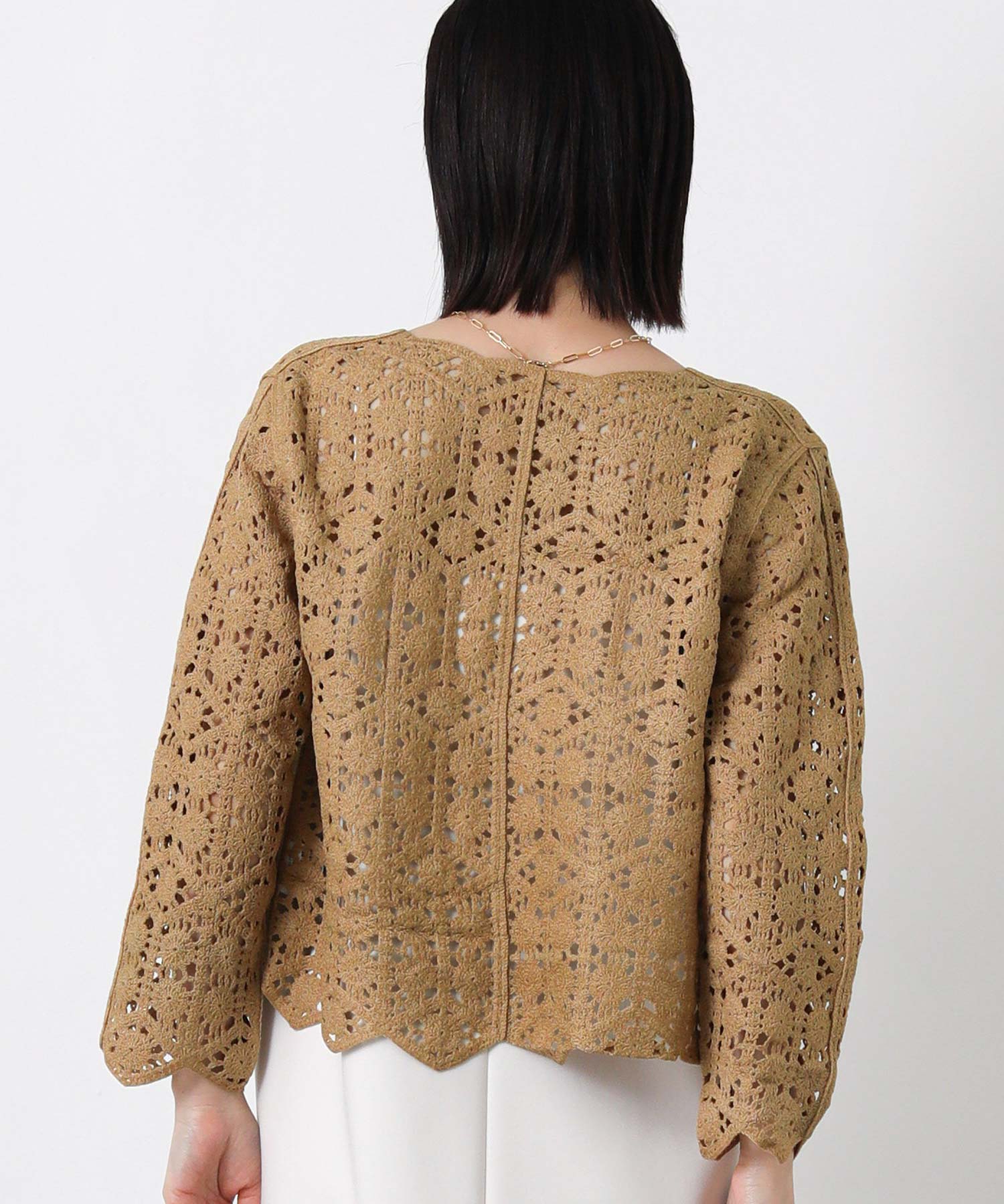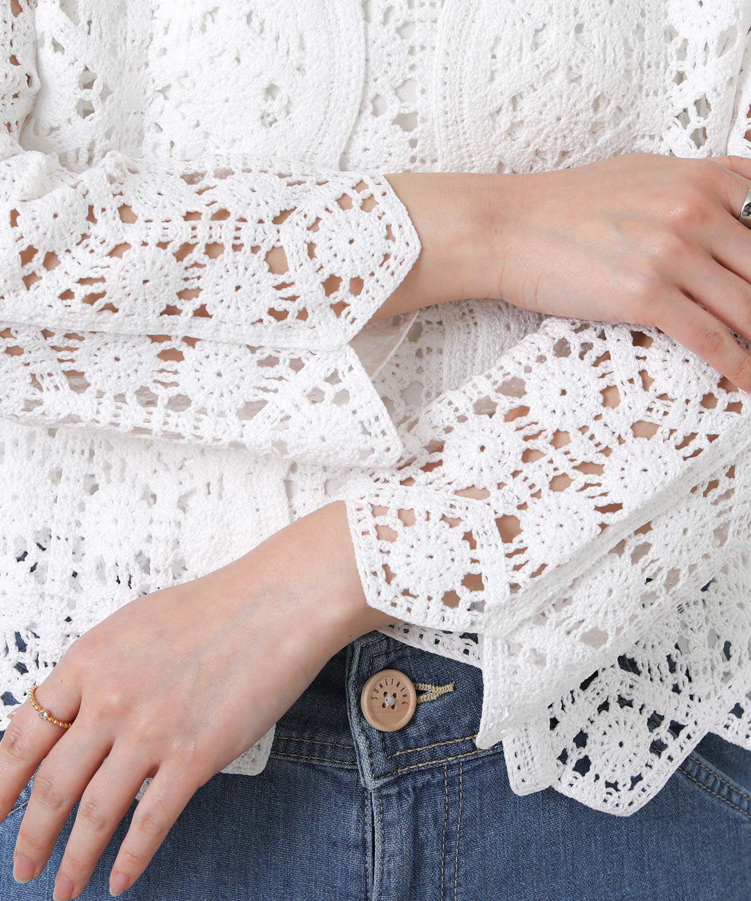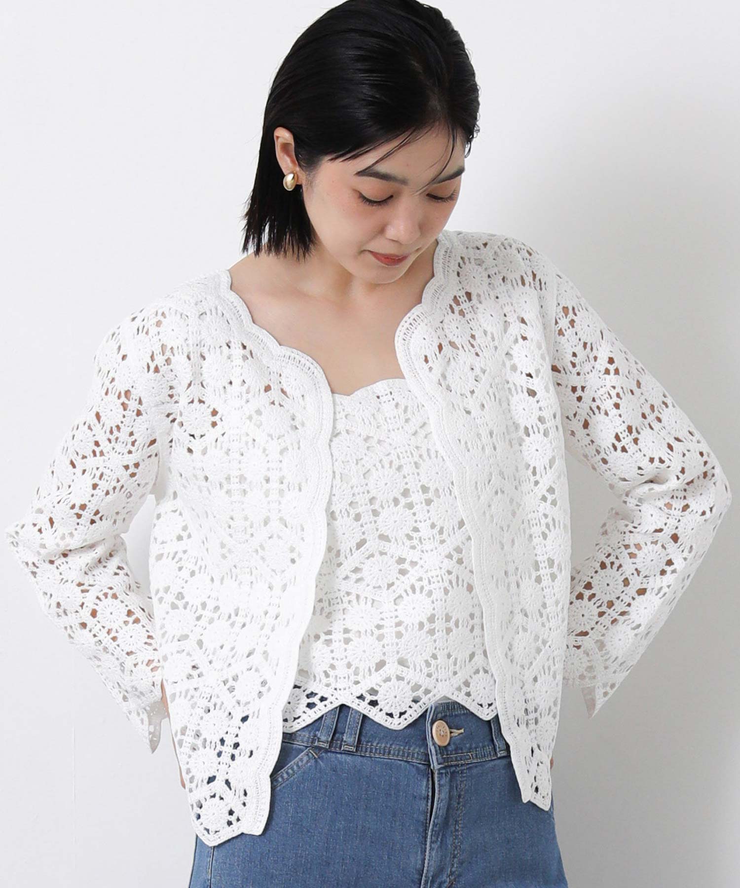 グレディオリジナルの透け感のある柄編みが着映えるレースジャケット。