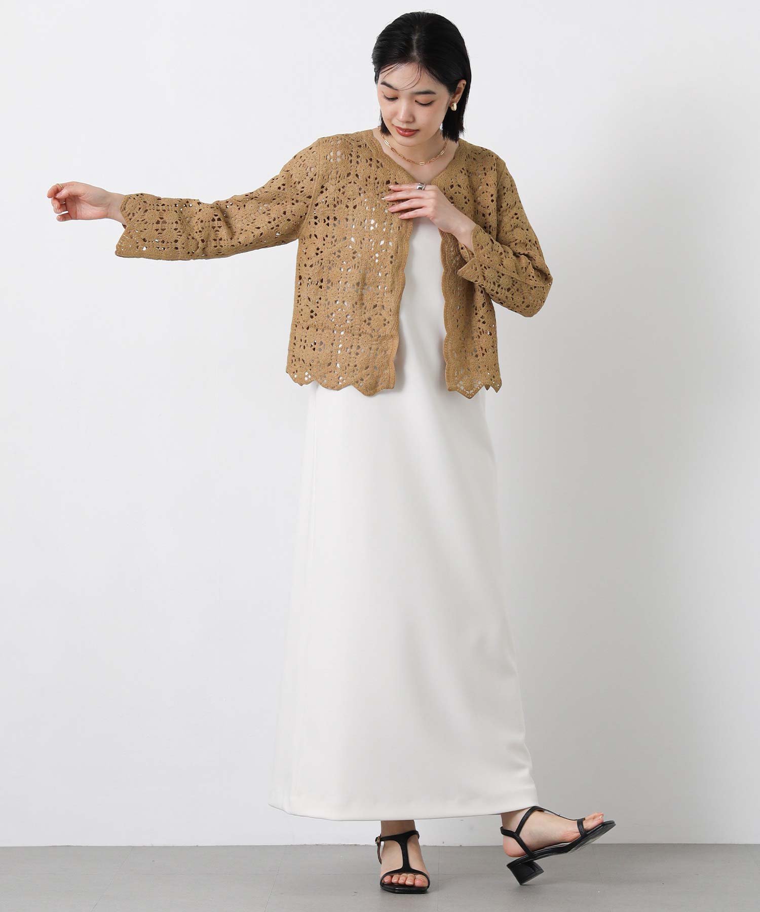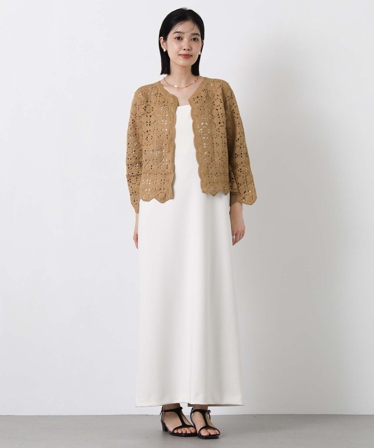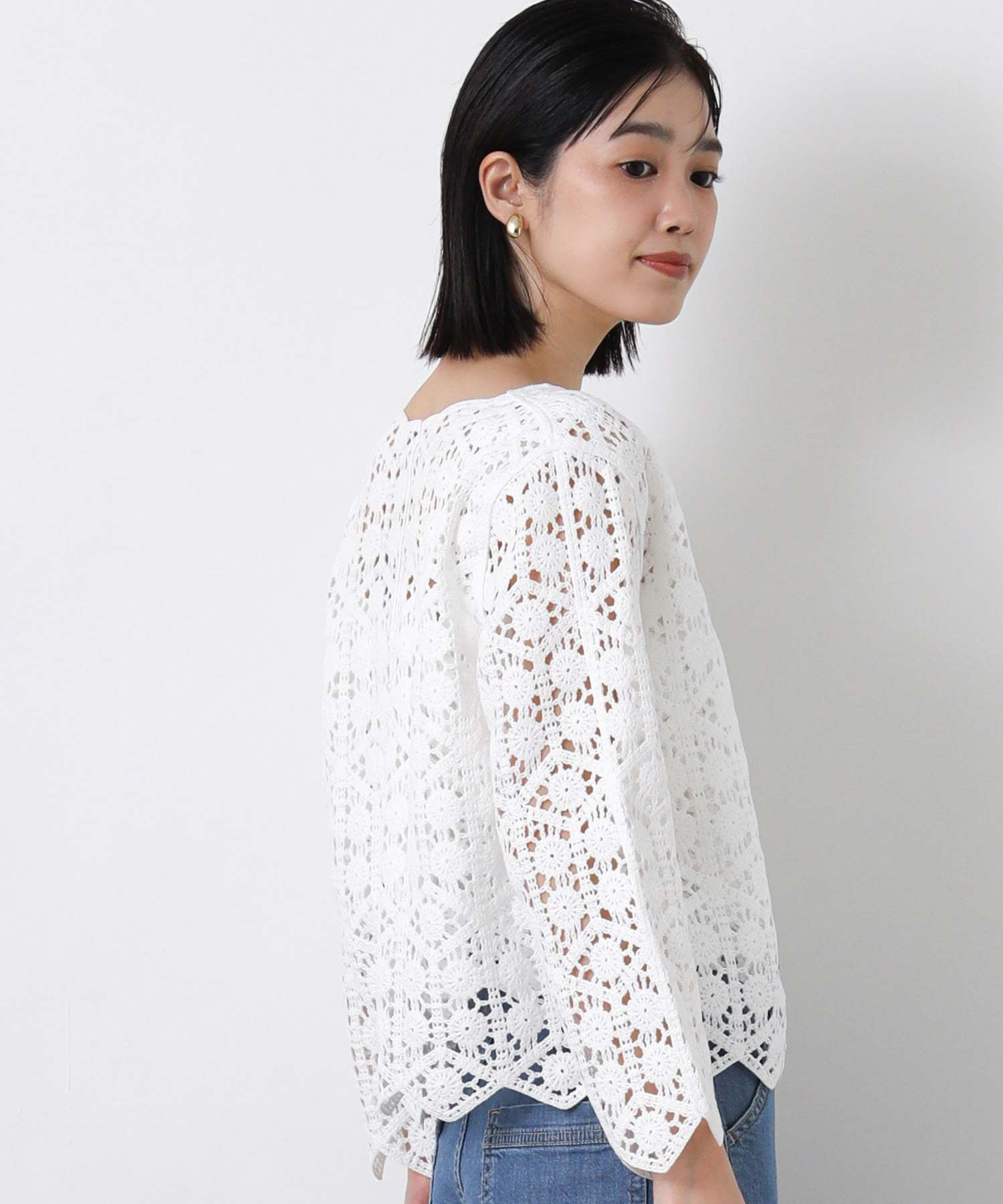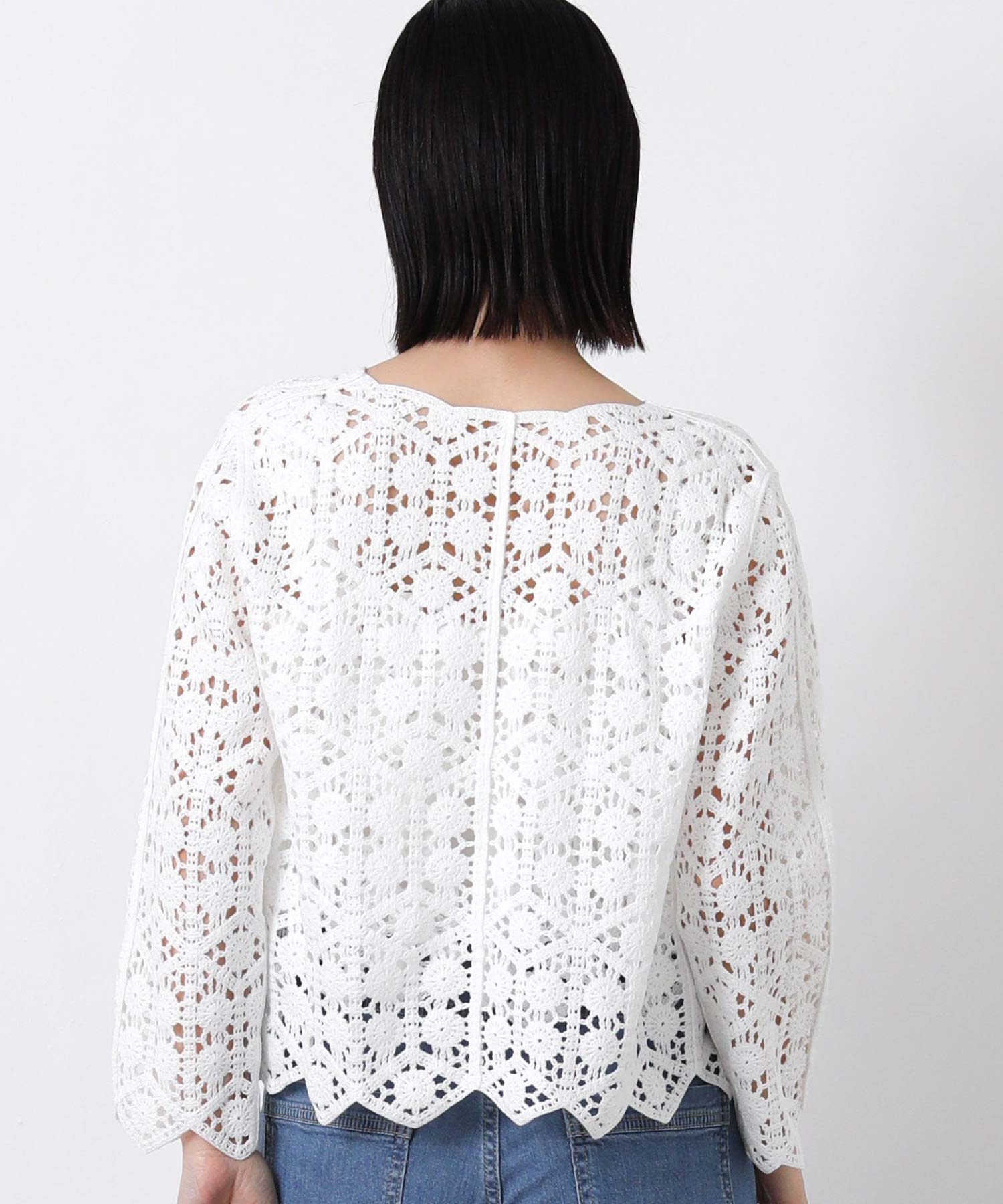 グレディオリジナルの透け感のある柄編みが着映えるレースジャケット。