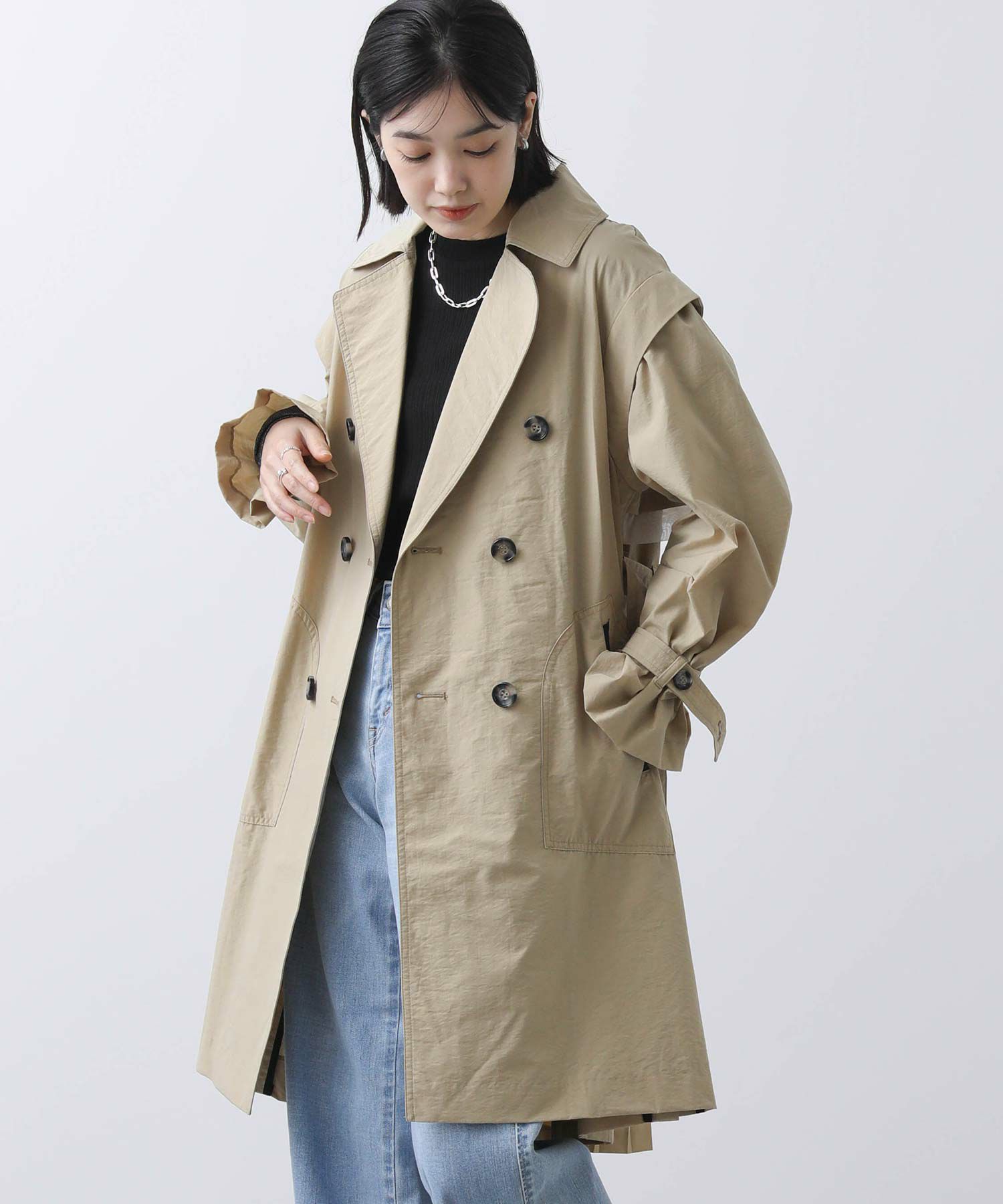 【LalliaMù/ラリア・ムー】から、ベストとしても着用出来るミドル丈のトレンチ風コートをセレクト。