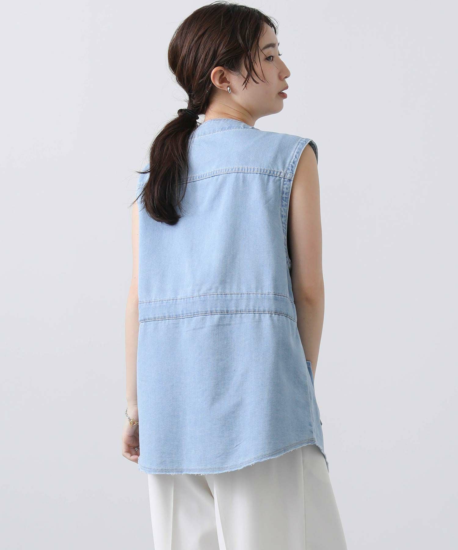 夏のレイヤードスタイルに快適な薄手の素材感と、裾の裁ち切り風フリンジで、ラフでカジュアルな一枚に。