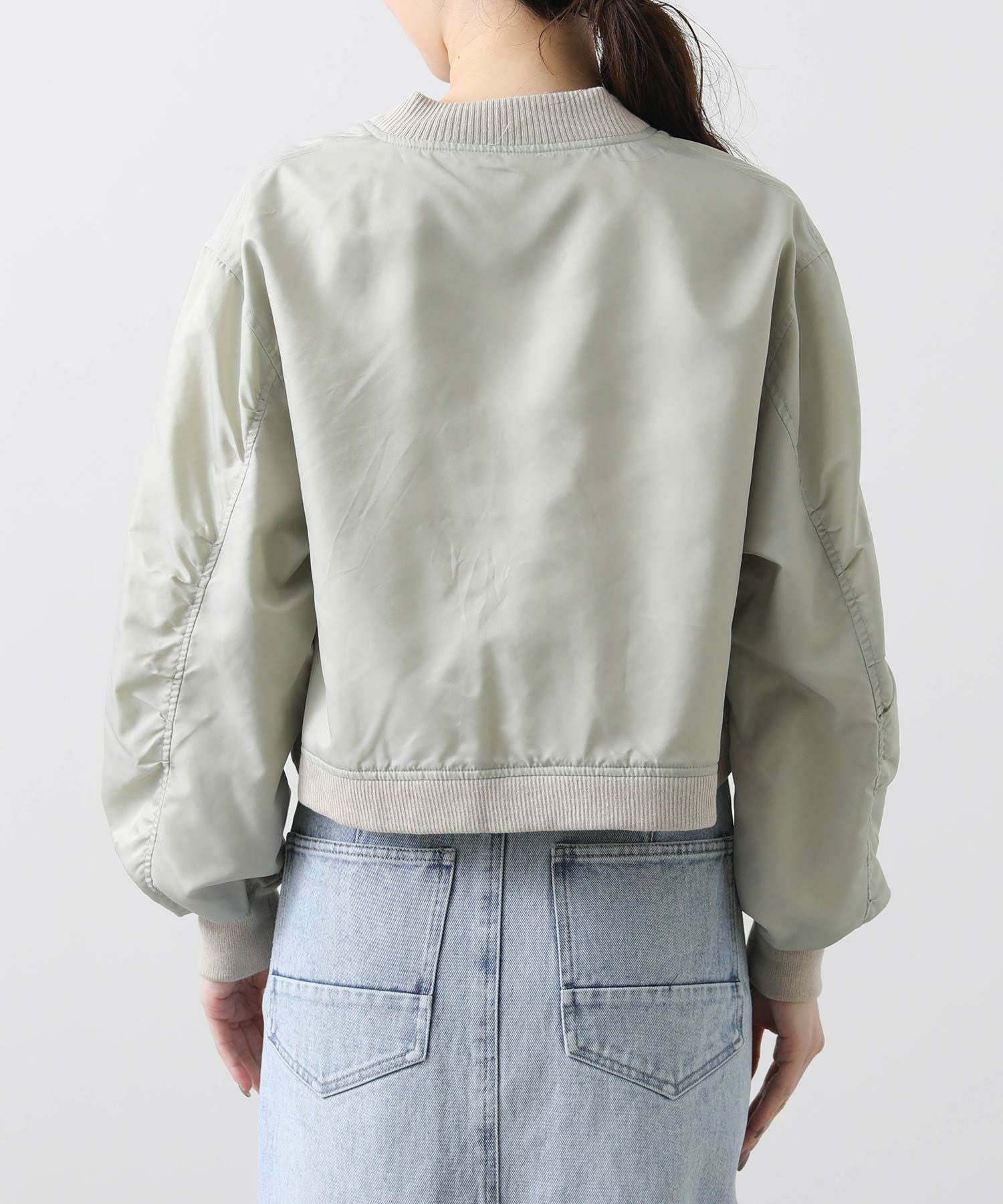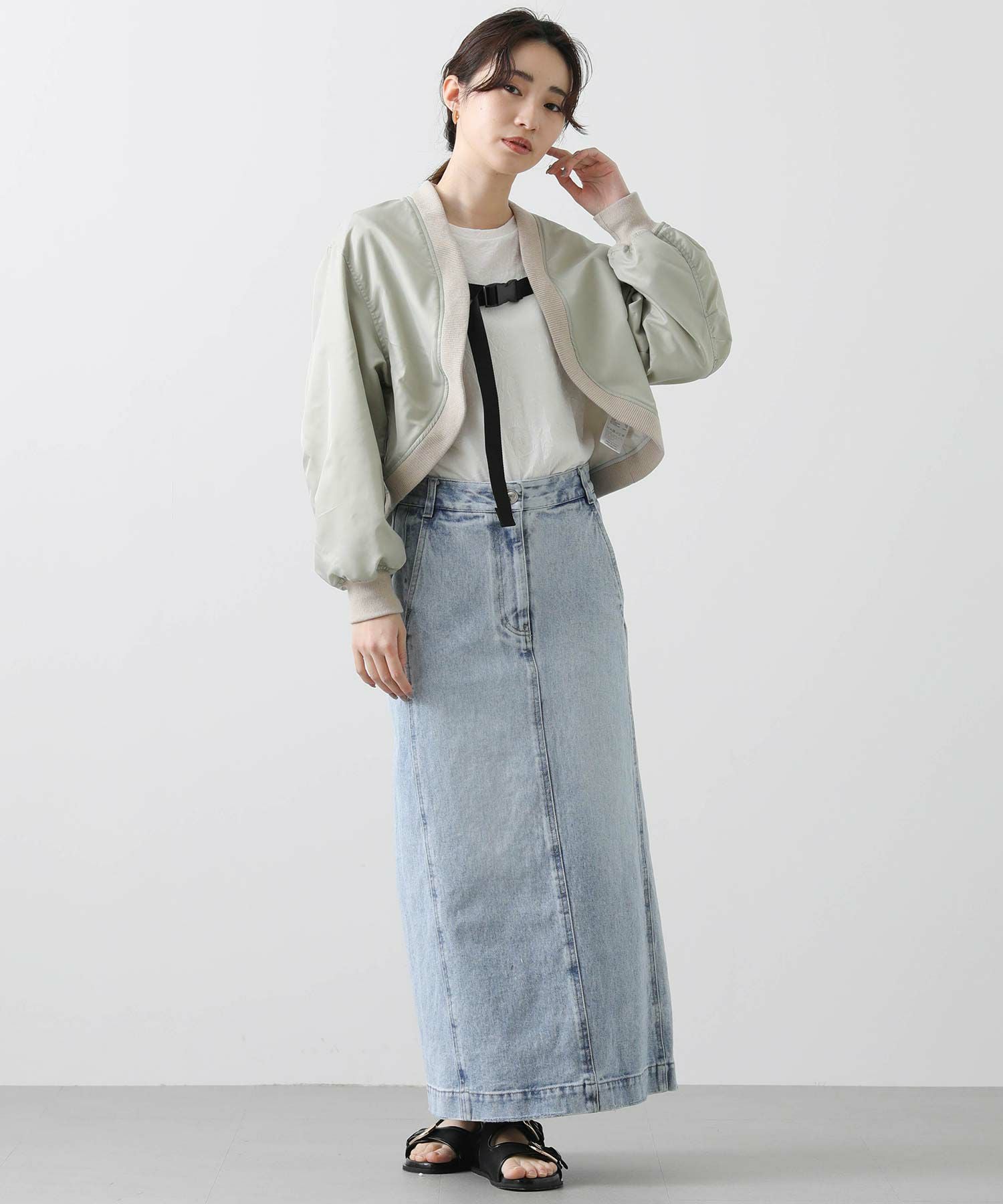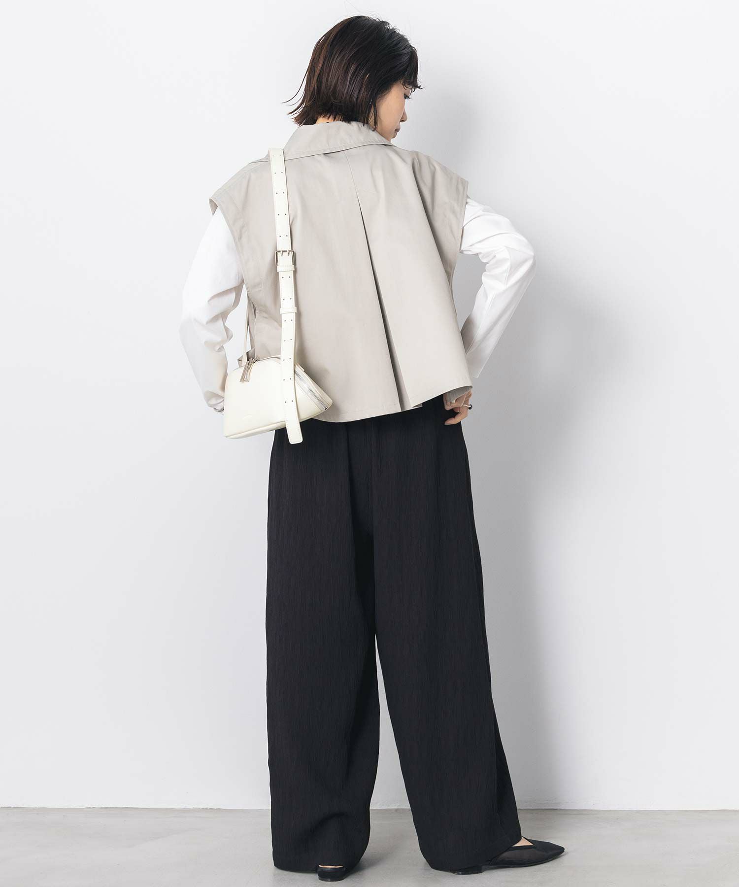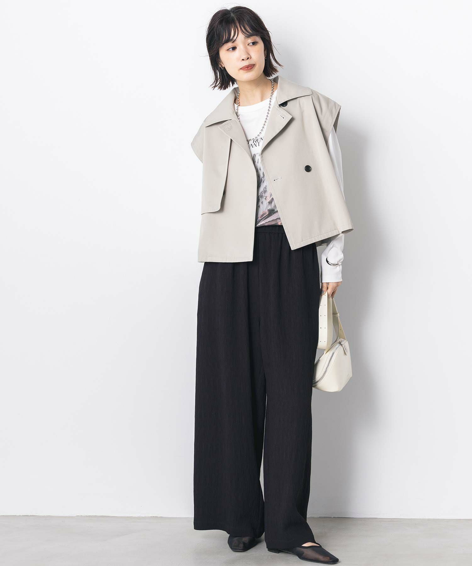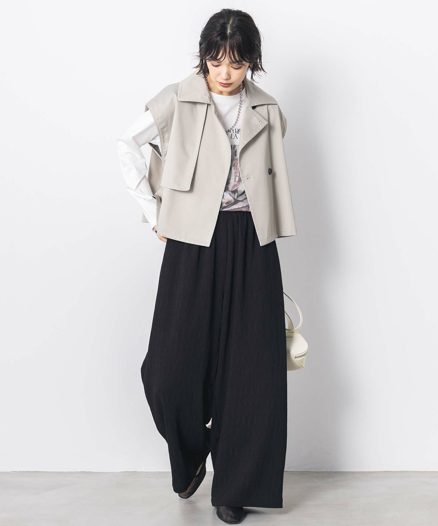 ワイドパンツ、スカートなどと合わせやすいショート丈は全体のバランスを整え、脚長効果を演出します。