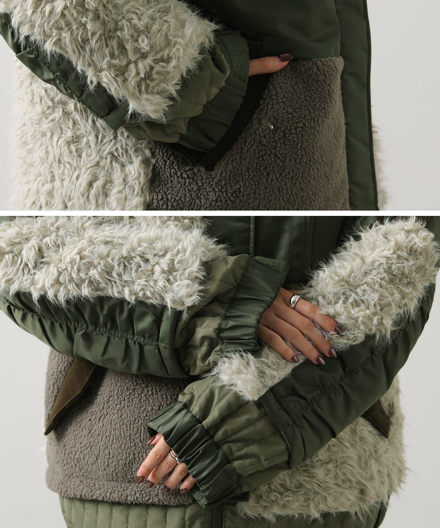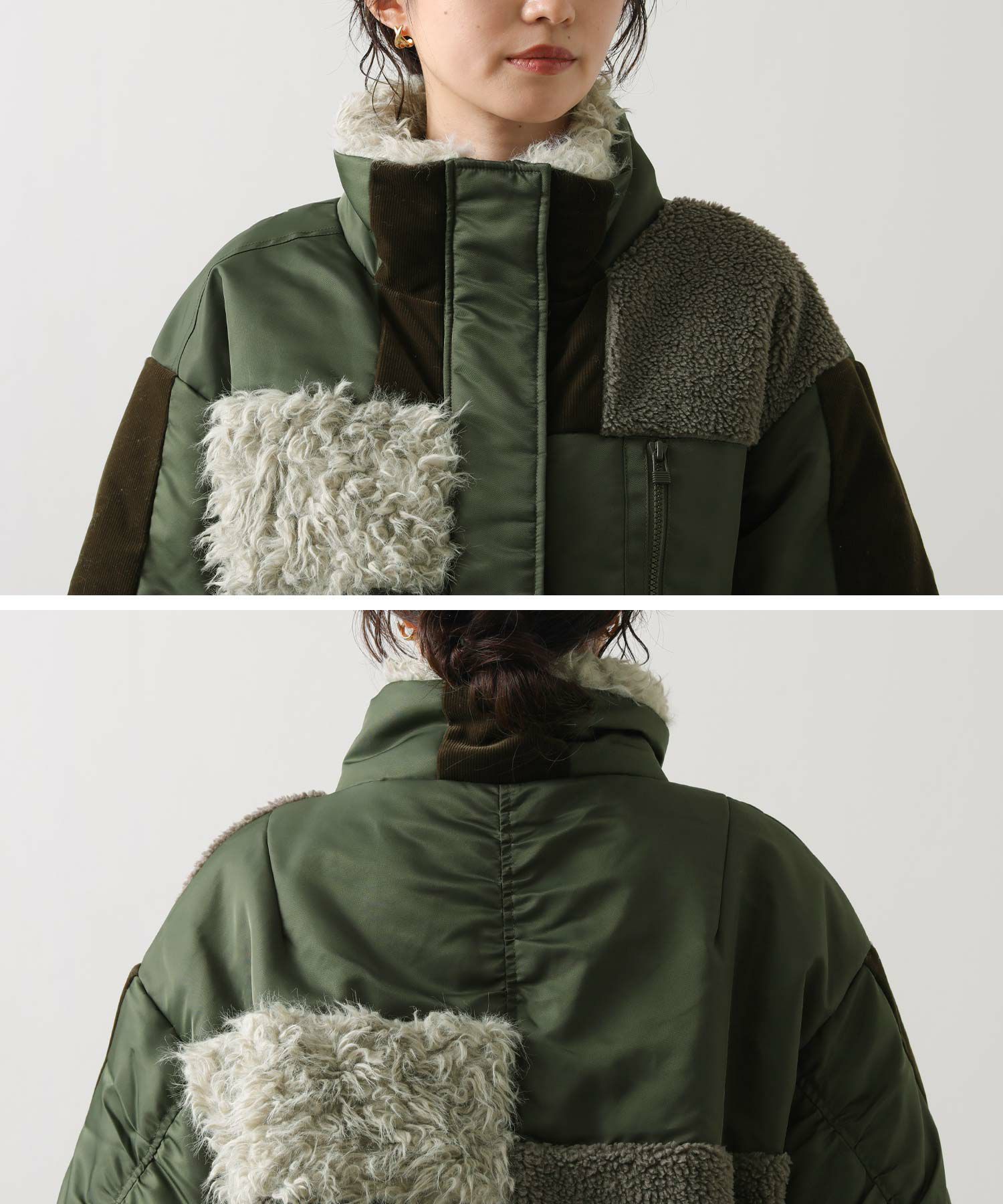 【AULAAILA(アウラアイラ】から、ナイロンタフタをベースに、エコファー、ボア、キルティング、コーデュロイなど、様々な素材を組み合わせたブルゾンをセレクト。