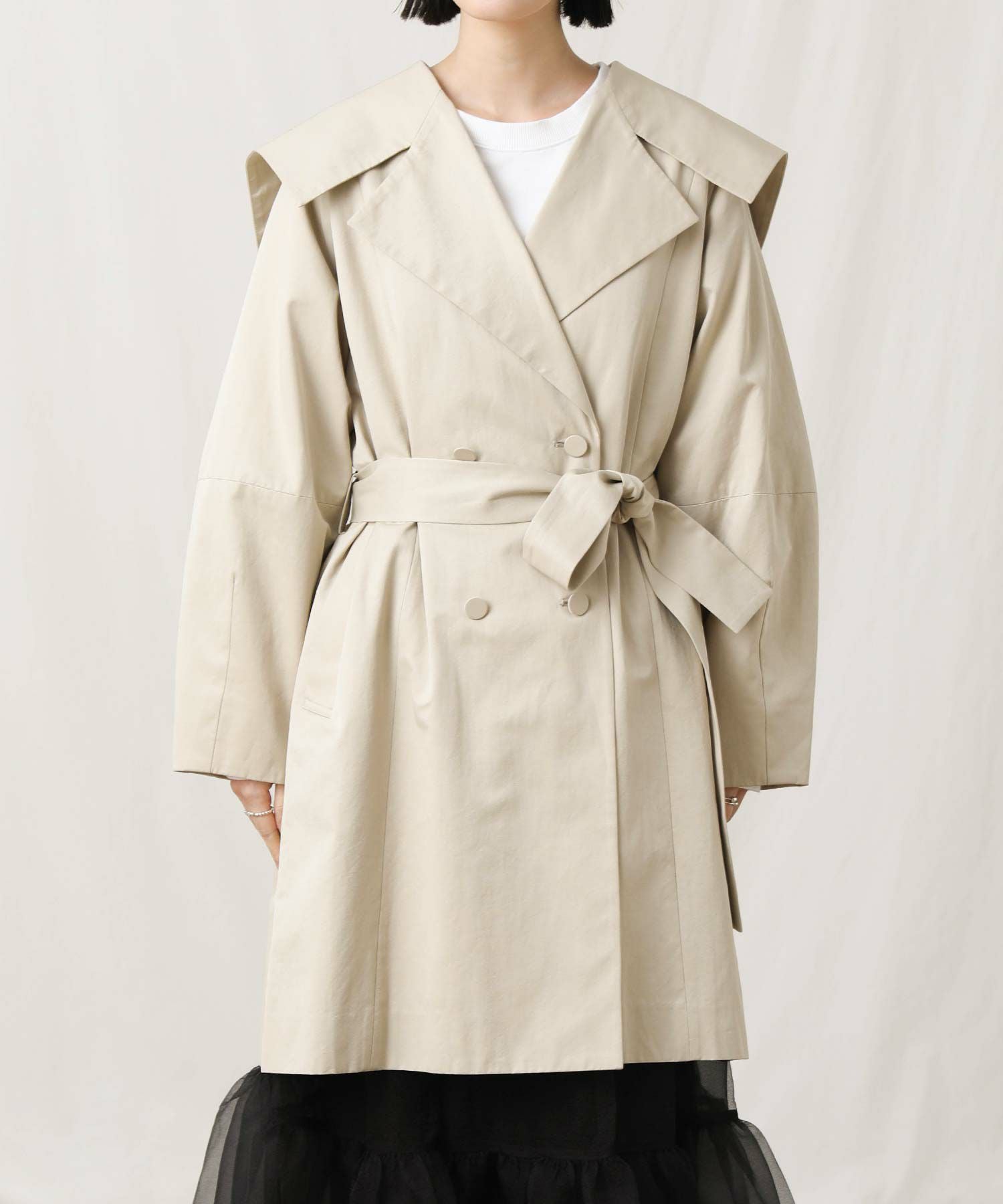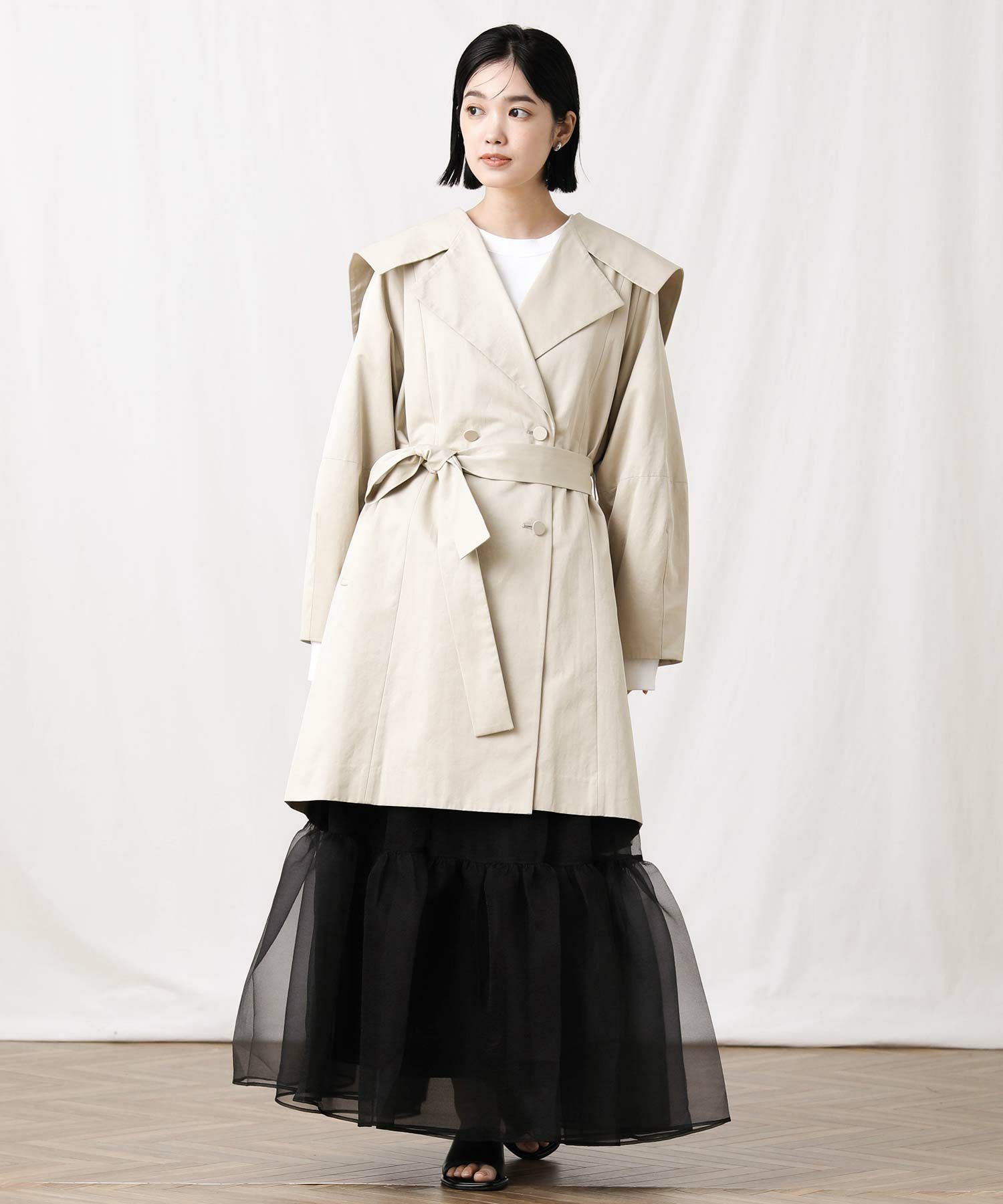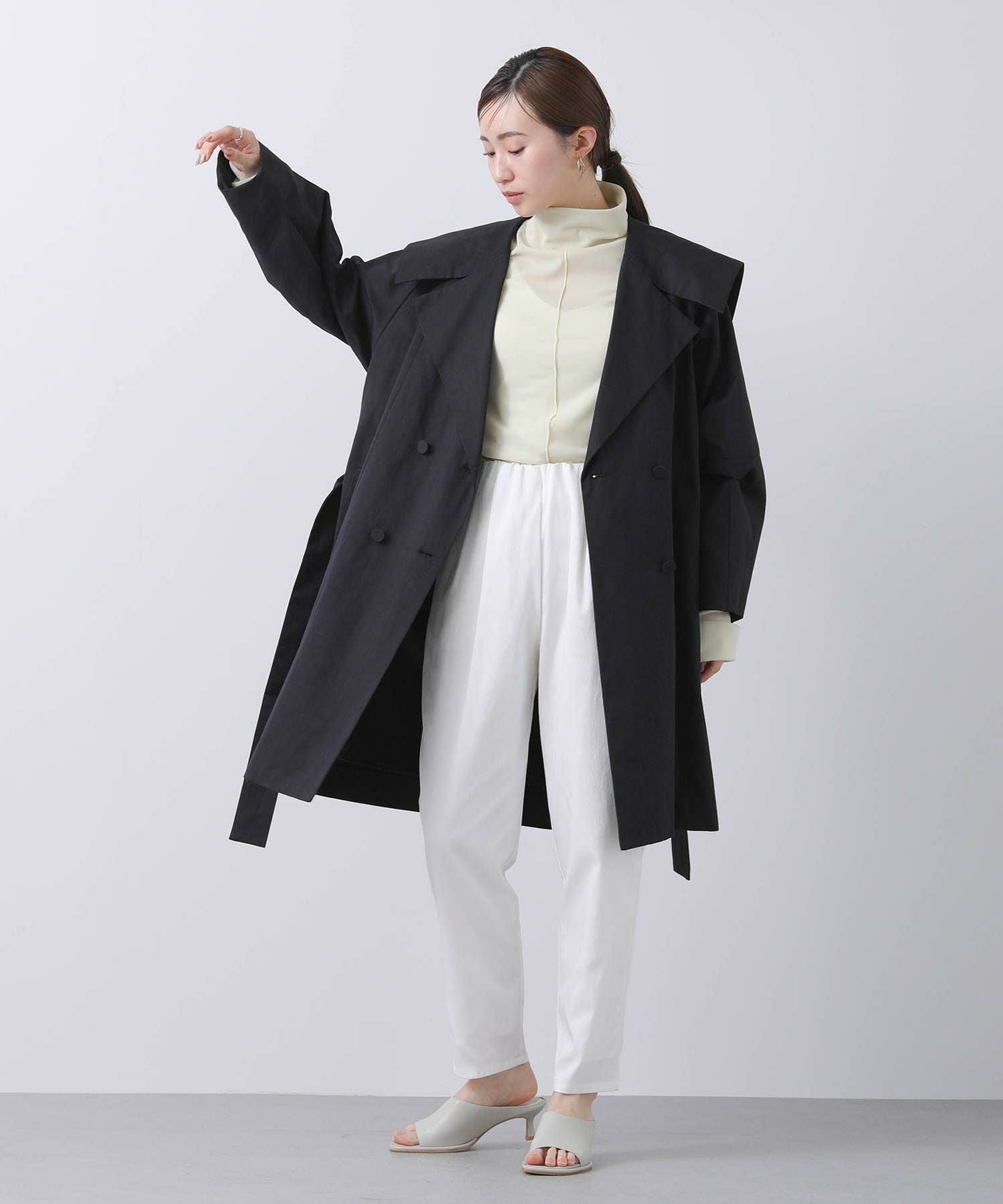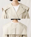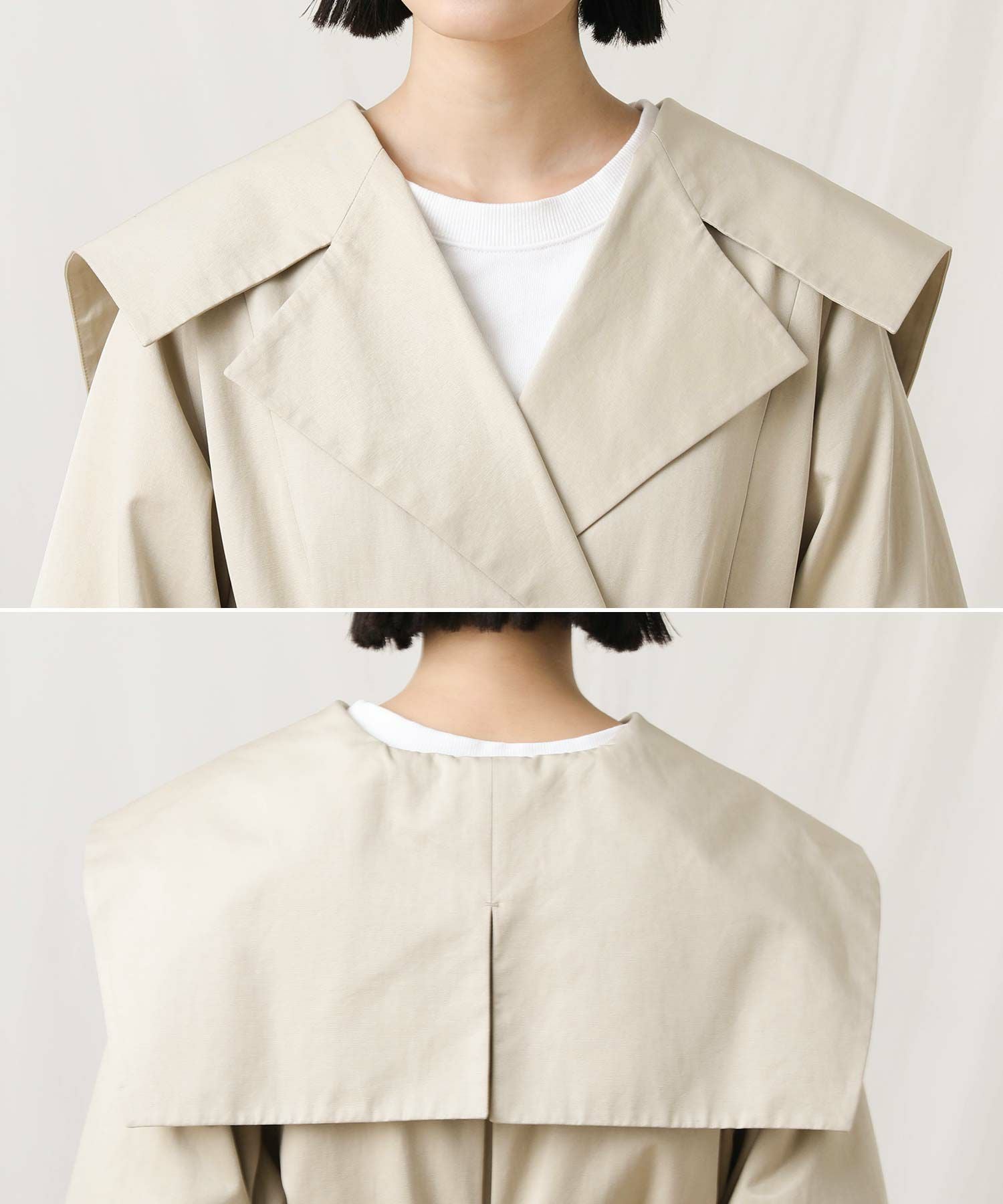 襟元を目立たせるために他のディティールはあえて足さず、素材のハリ感を活かした構築的なシルエットに。