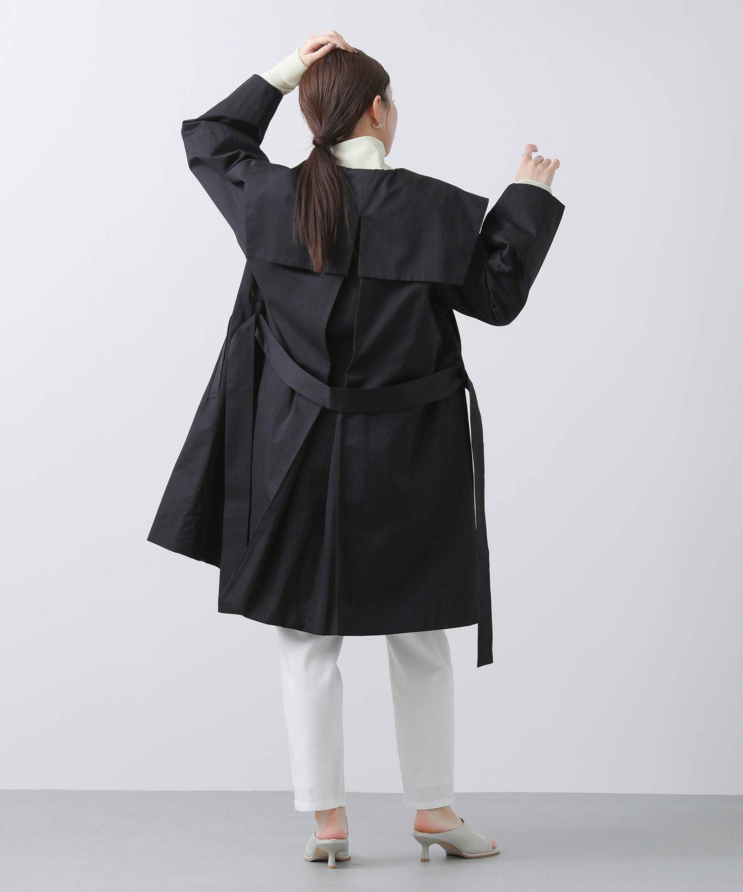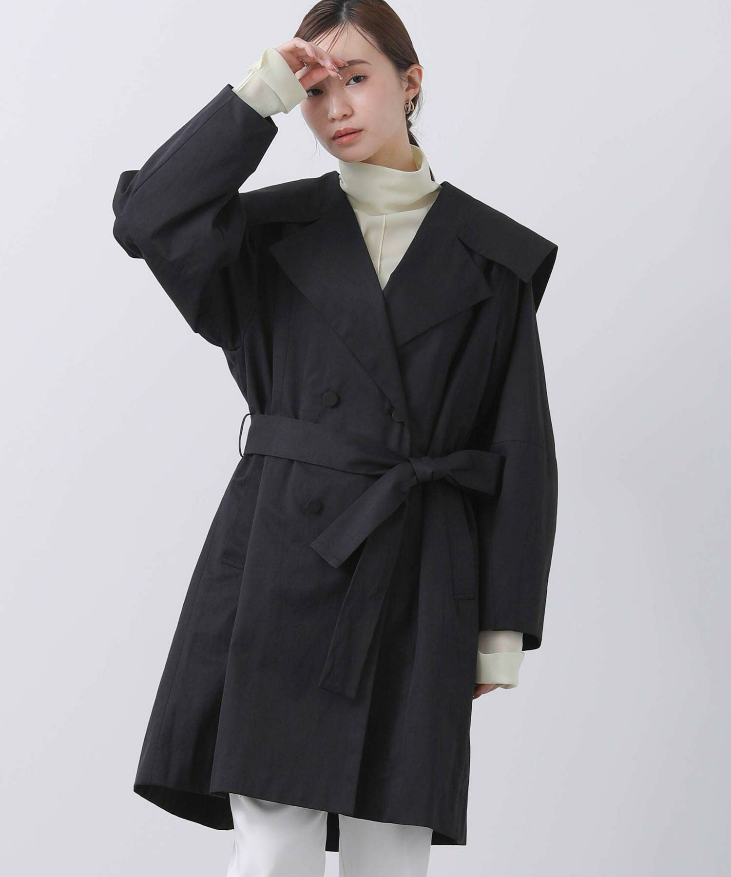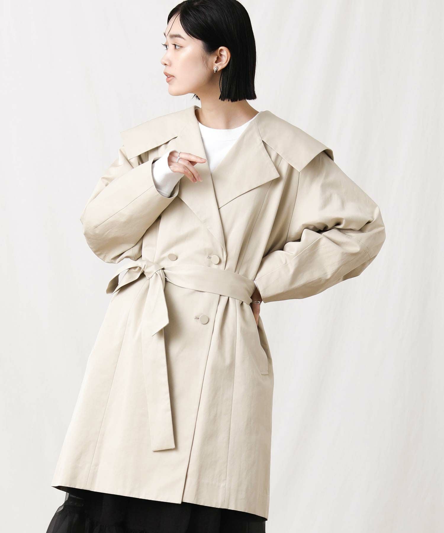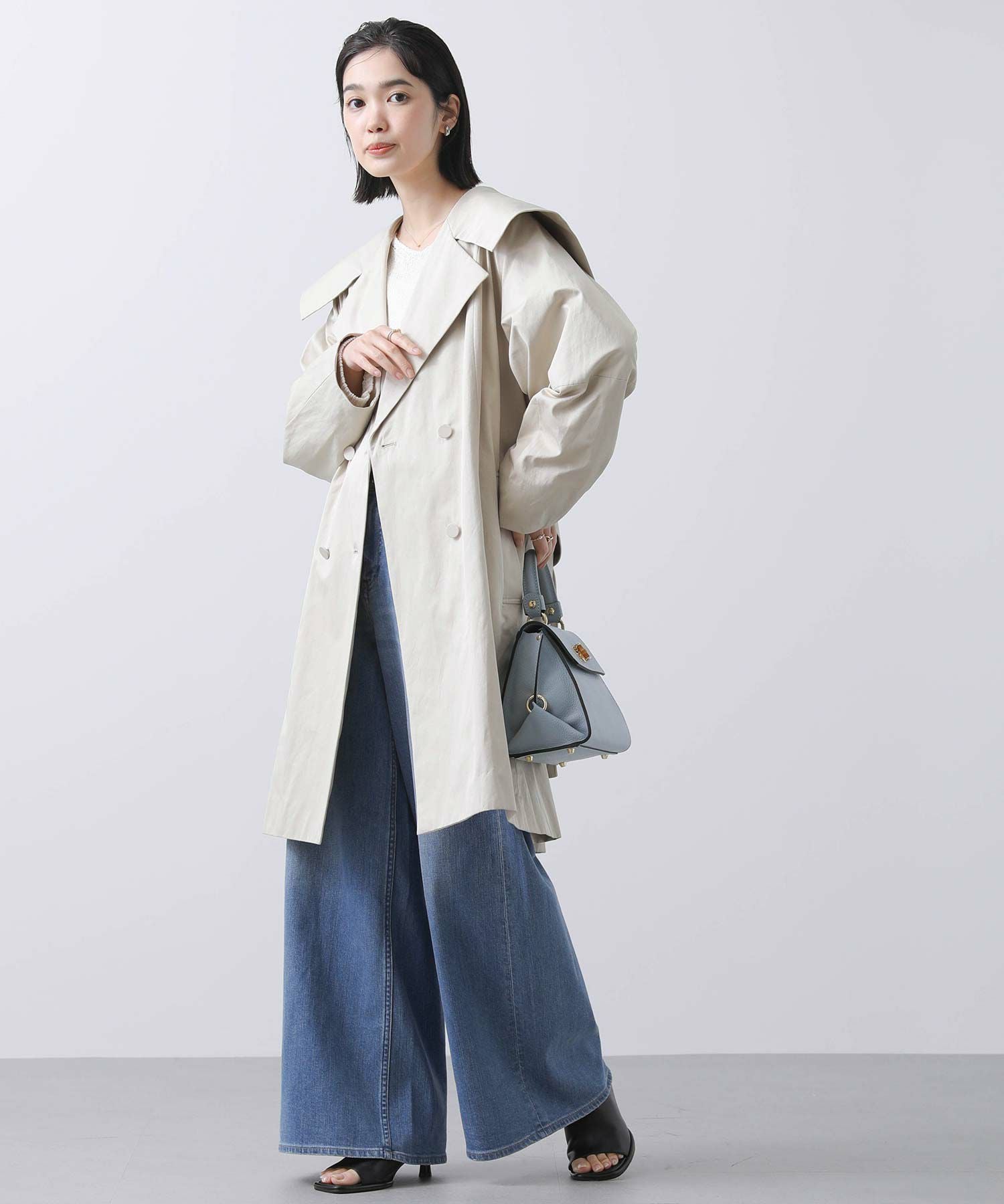 襟元を目立たせるために他のディティールはあえて足さず、素材のハリ感を活かした構築的なシルエットに。