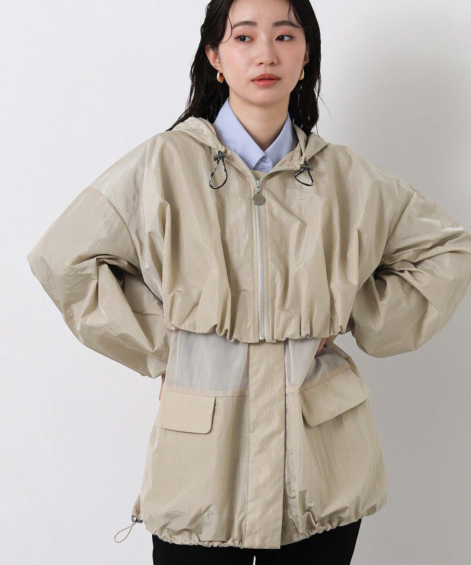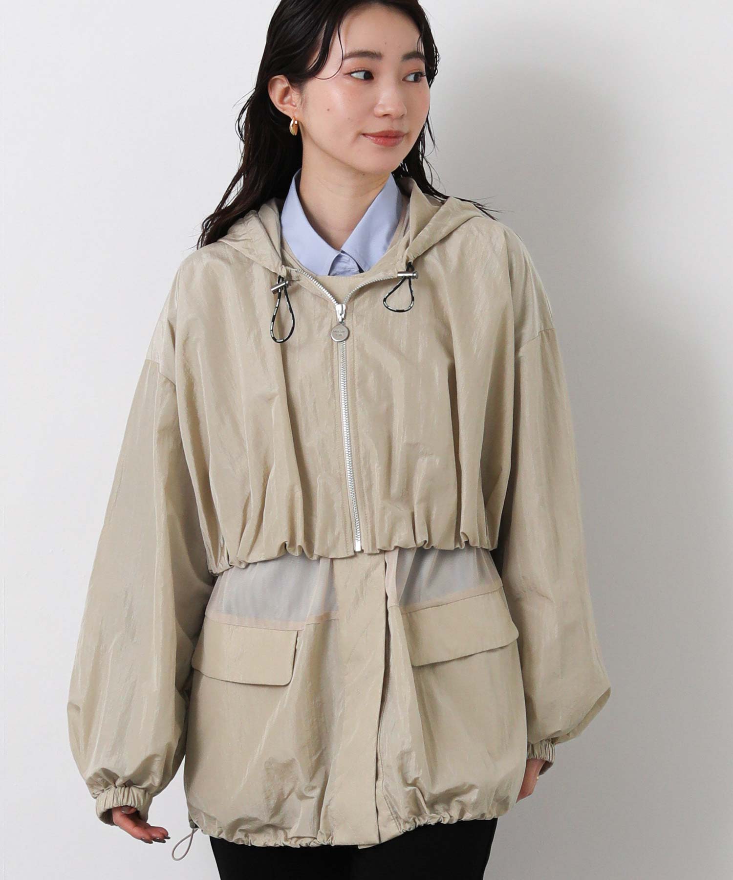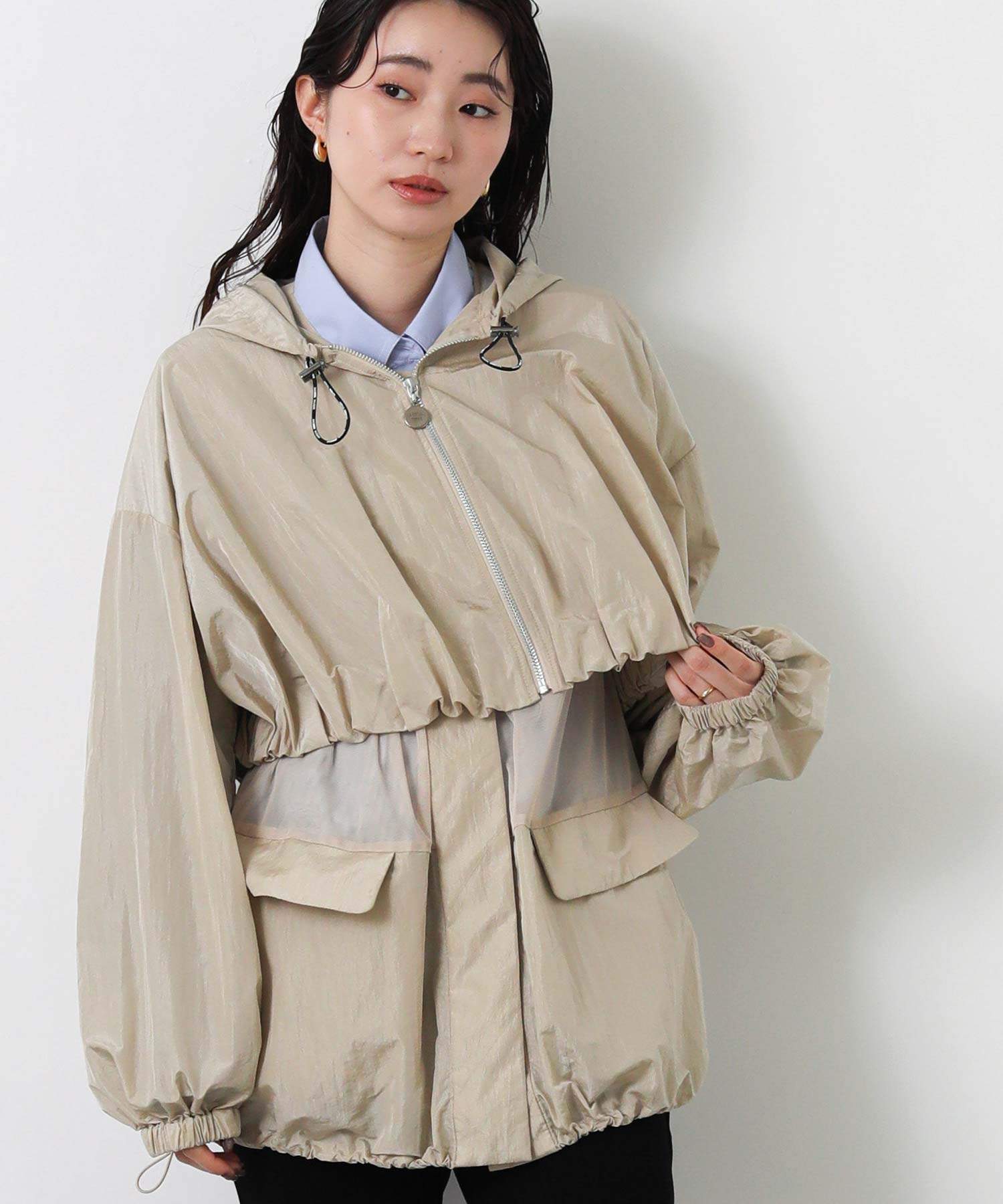 軽量ナイロンを使用したフーディと、レイヤード風に着こなせるナイロンベストのセットブルゾン。