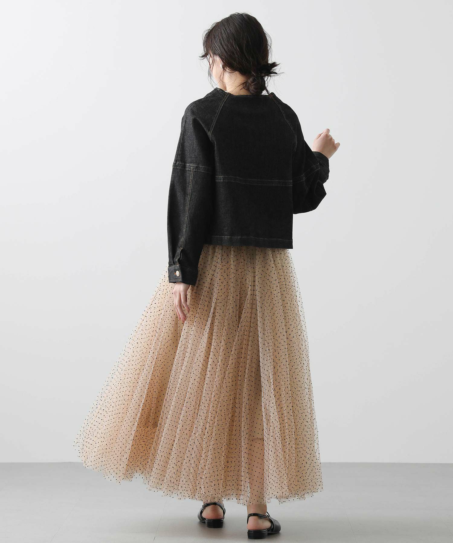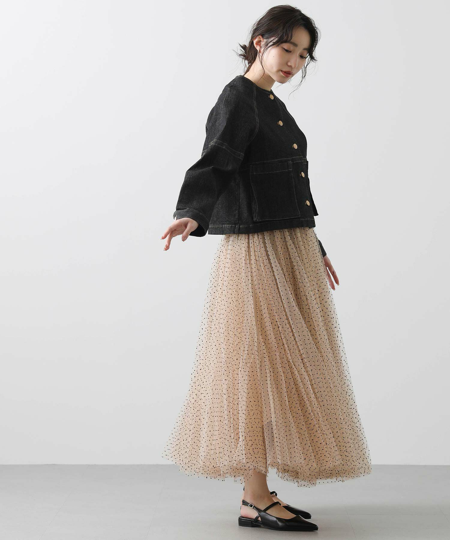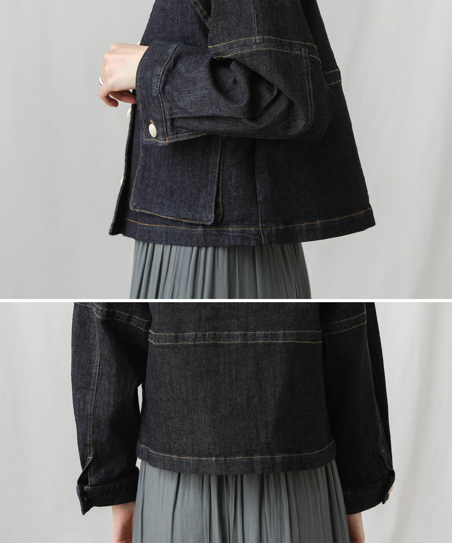 デニムのカジュアル感を楽しみつつ、女性らしい着こなしにもマッチするノーカラーデニムジャケット。