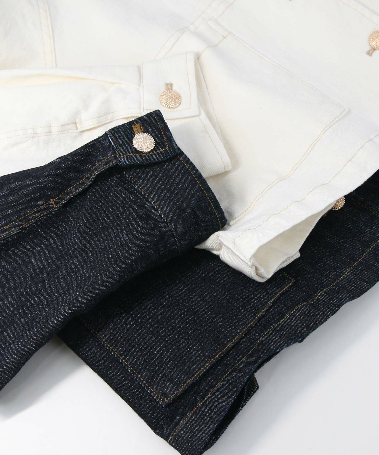 デニムのカジュアル感を楽しみつつ、女性らしい着こなしにもマッチするGジャン。襟付きだと、前を開けて着た時にサマになります。存在感のあるゴールド釦や配色ステッチがポイントでシンプルになり過ぎず、ストレッチが効いているので着心地が良いのも特徴です。