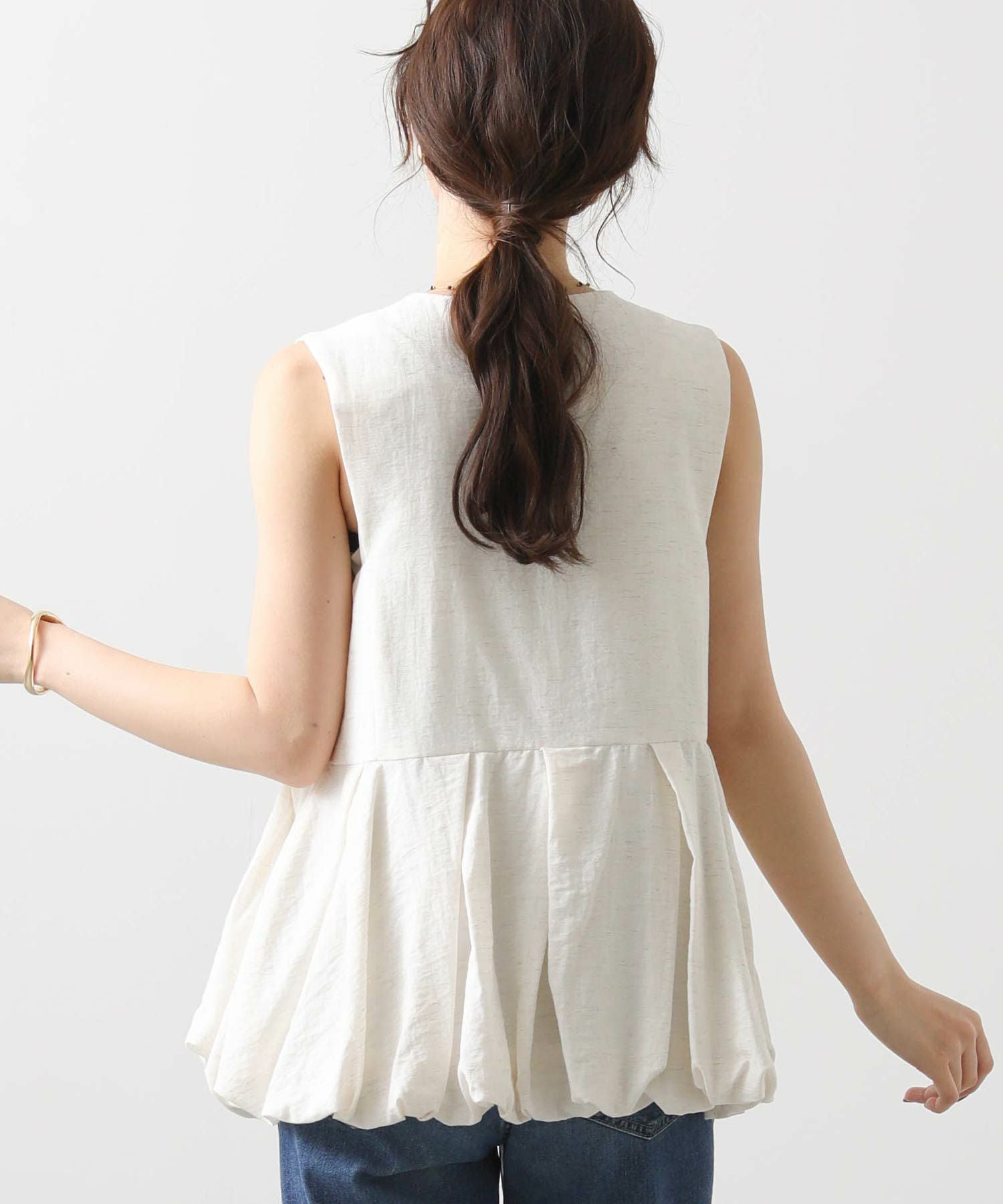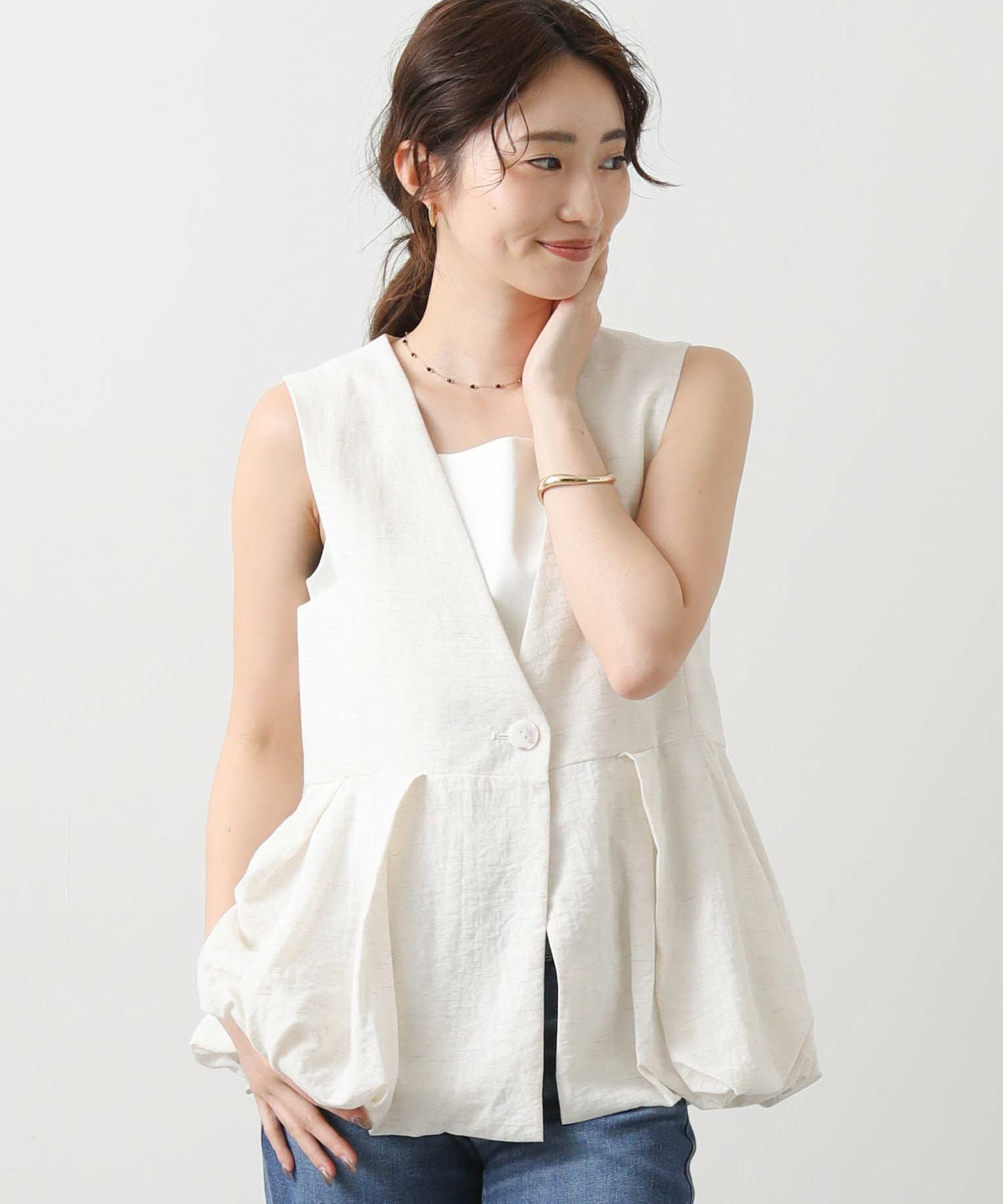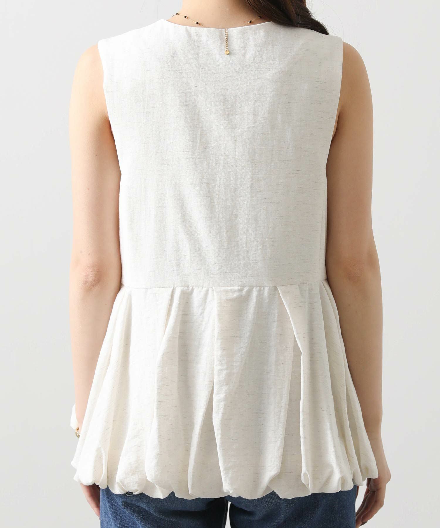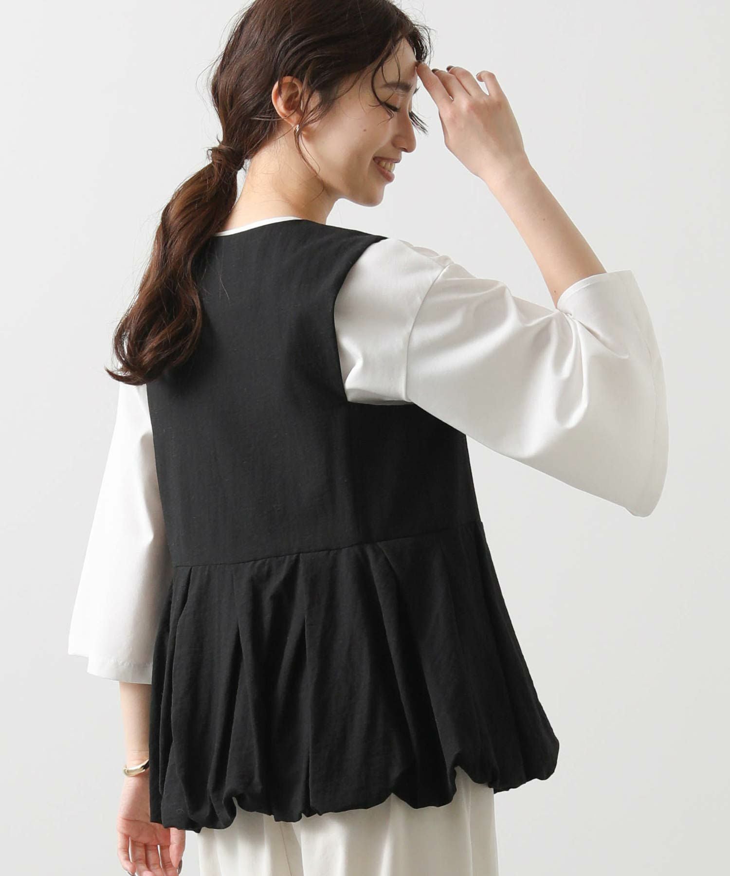 【Mewl/ミュール】から、リネン混素材を使用し、タック&ギャザーでボリュームを出したバルーンシルエットのベストをセレクト。