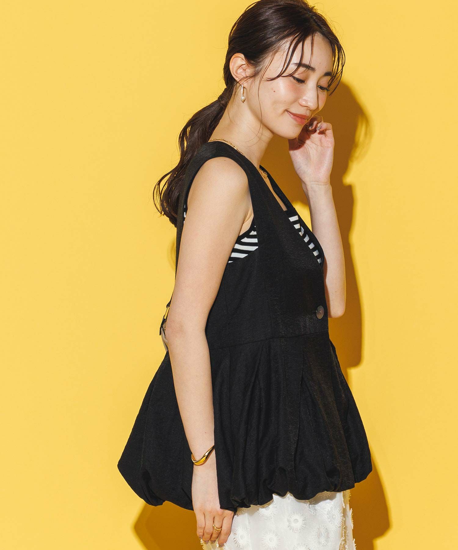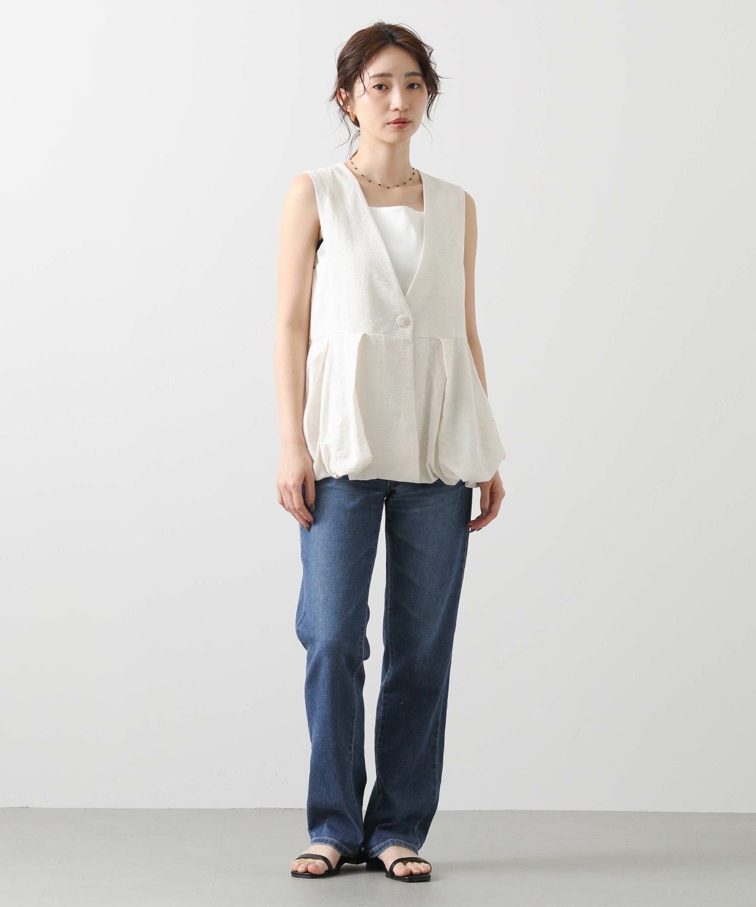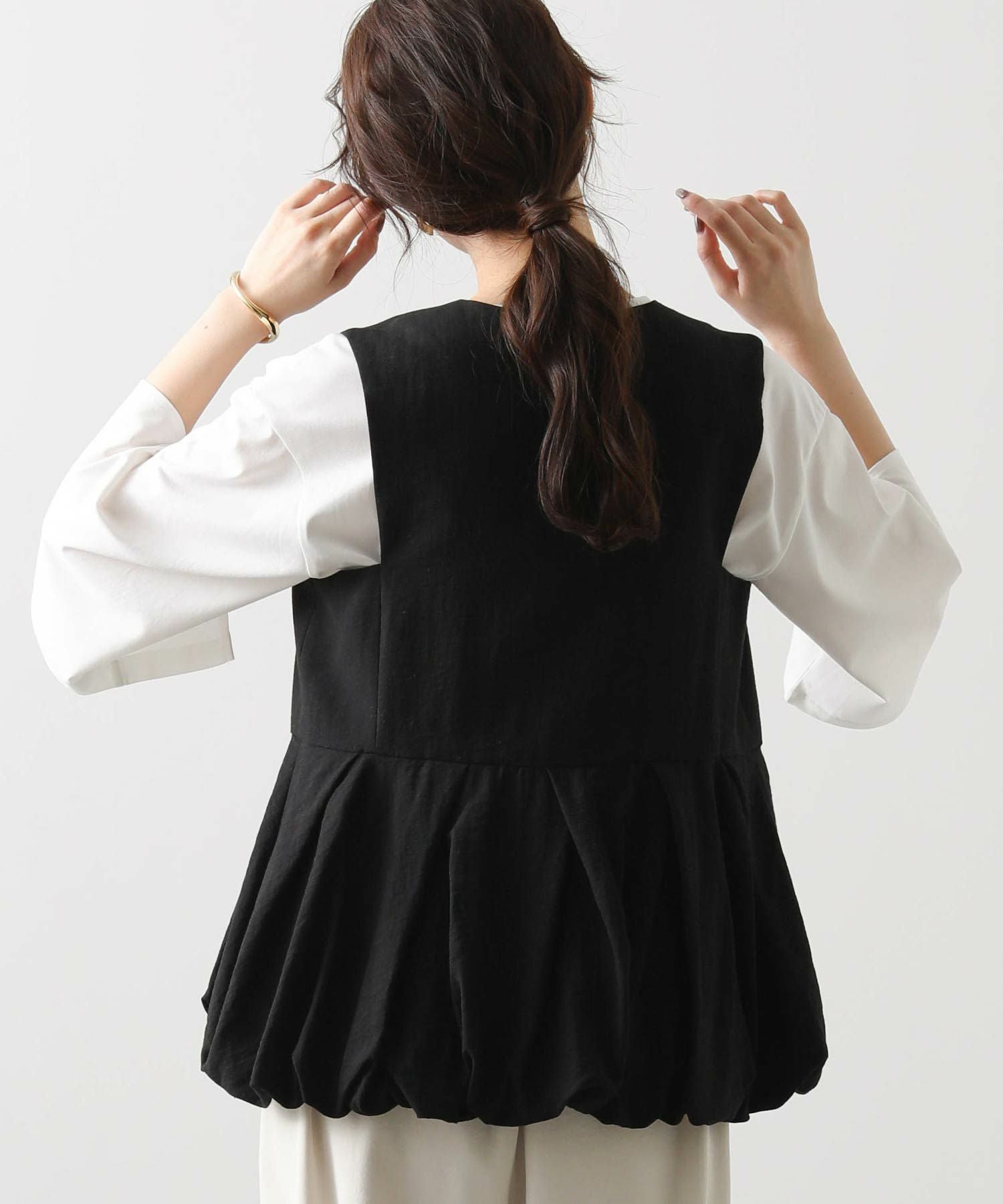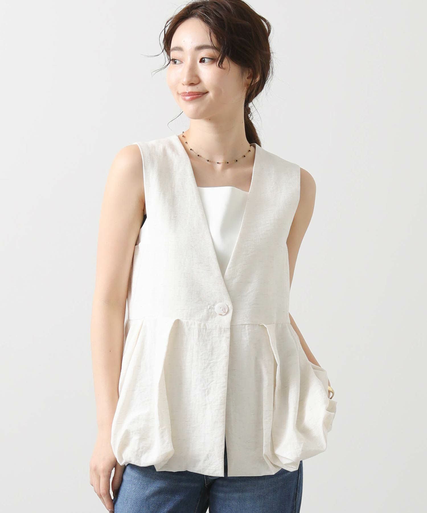 【Mewl/ミュール】から、リネン混素材を使用し、タック&ギャザーでボリュームを出したバルーンシルエットのベストをセレクト。