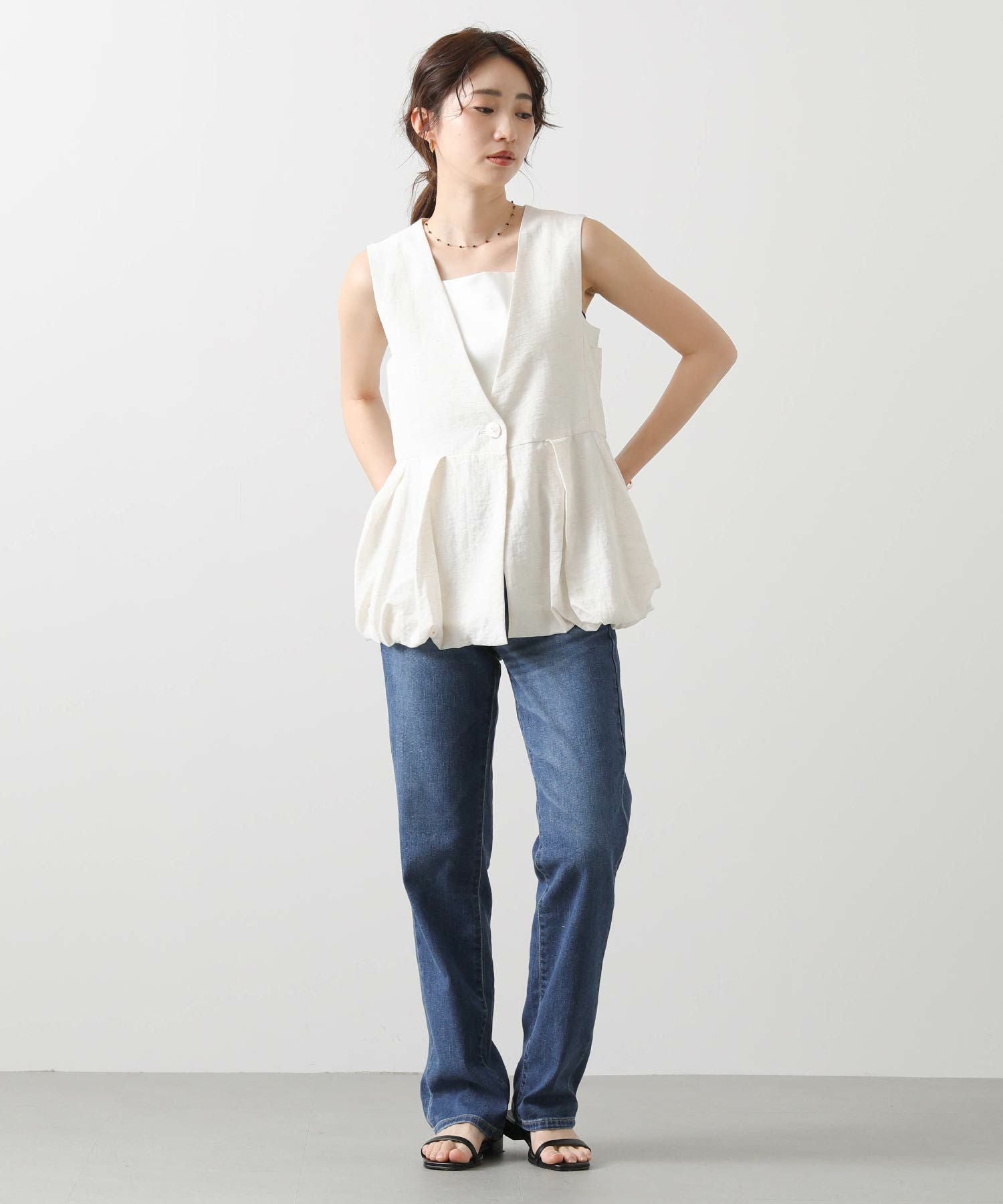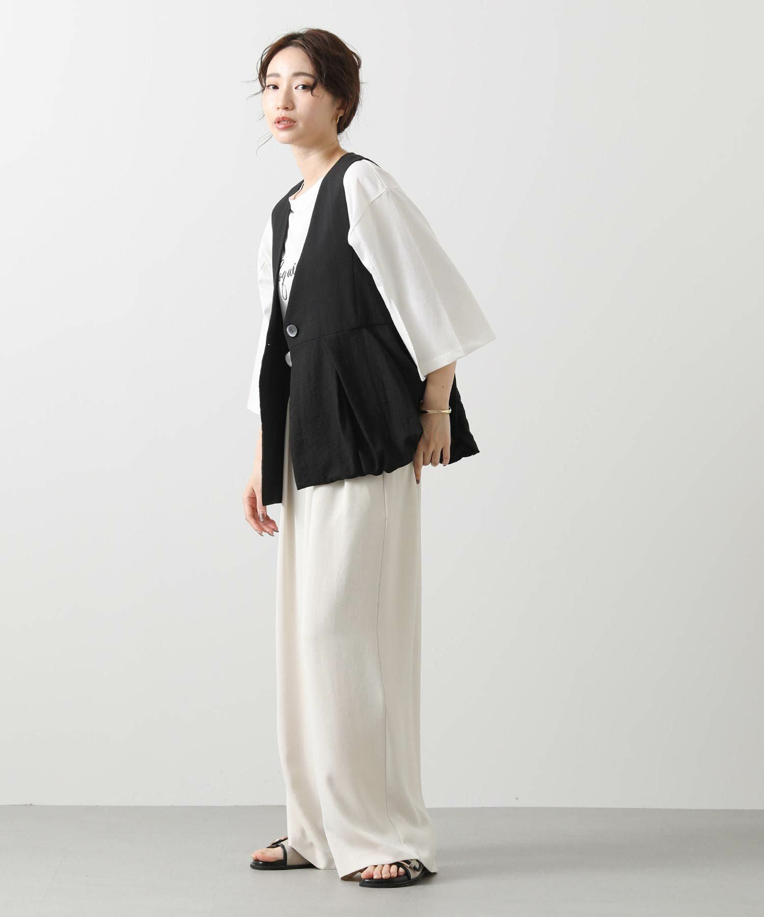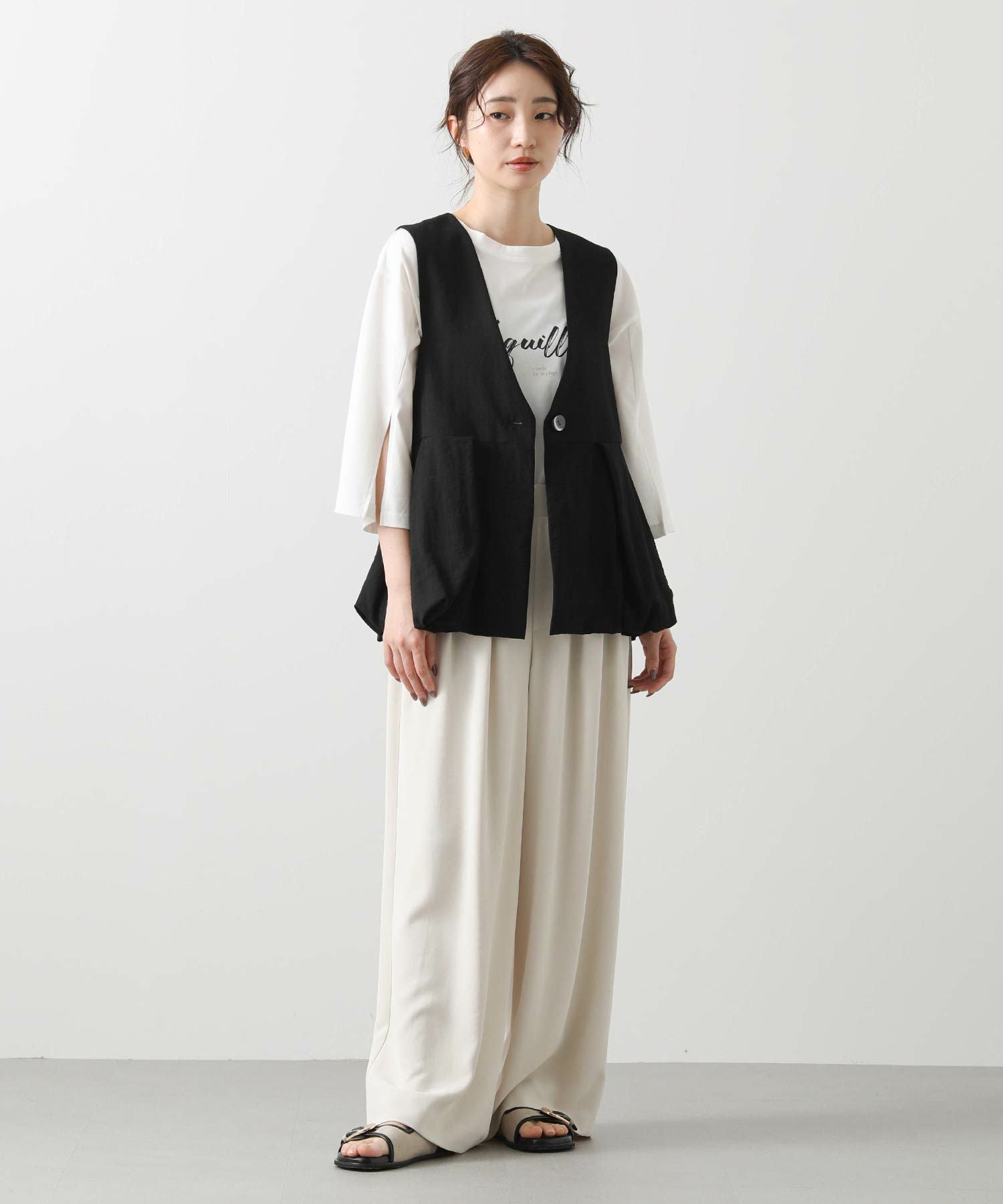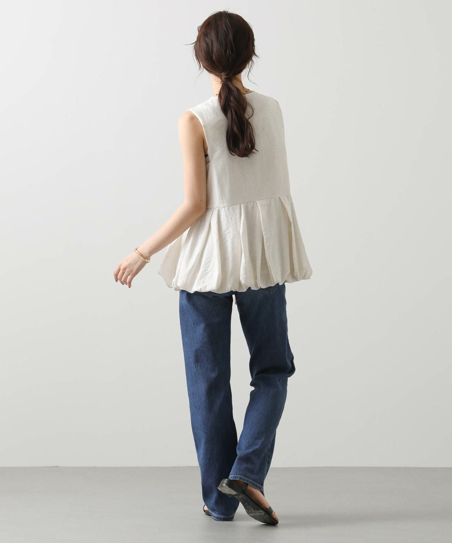 【Mewl/ミュール】から、リネン混素材を使用し、タック&ギャザーでボリュームを出したバルーンシルエットのベストをセレクト。