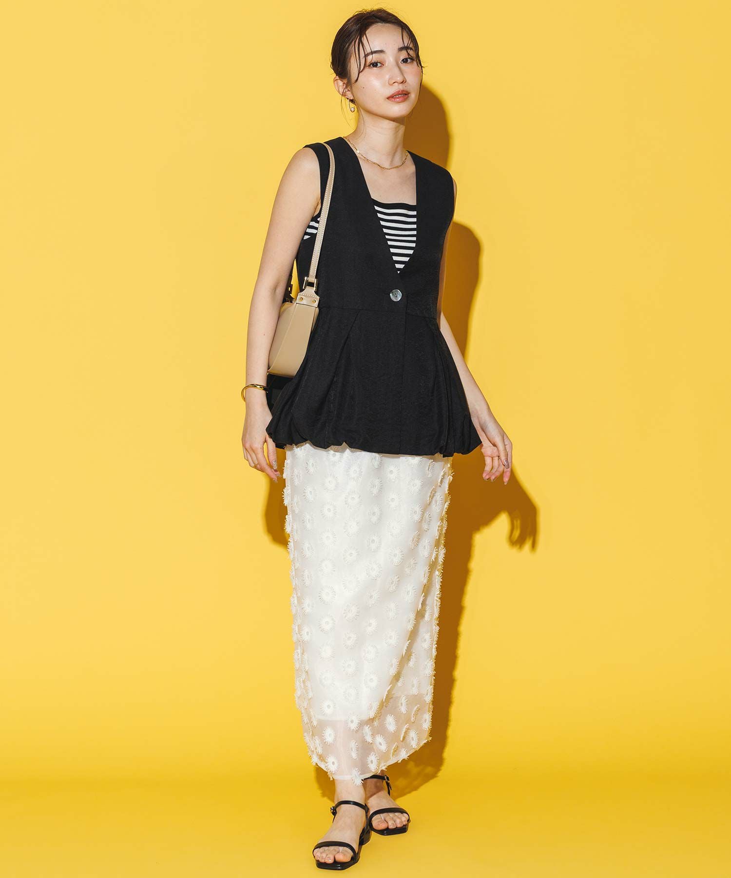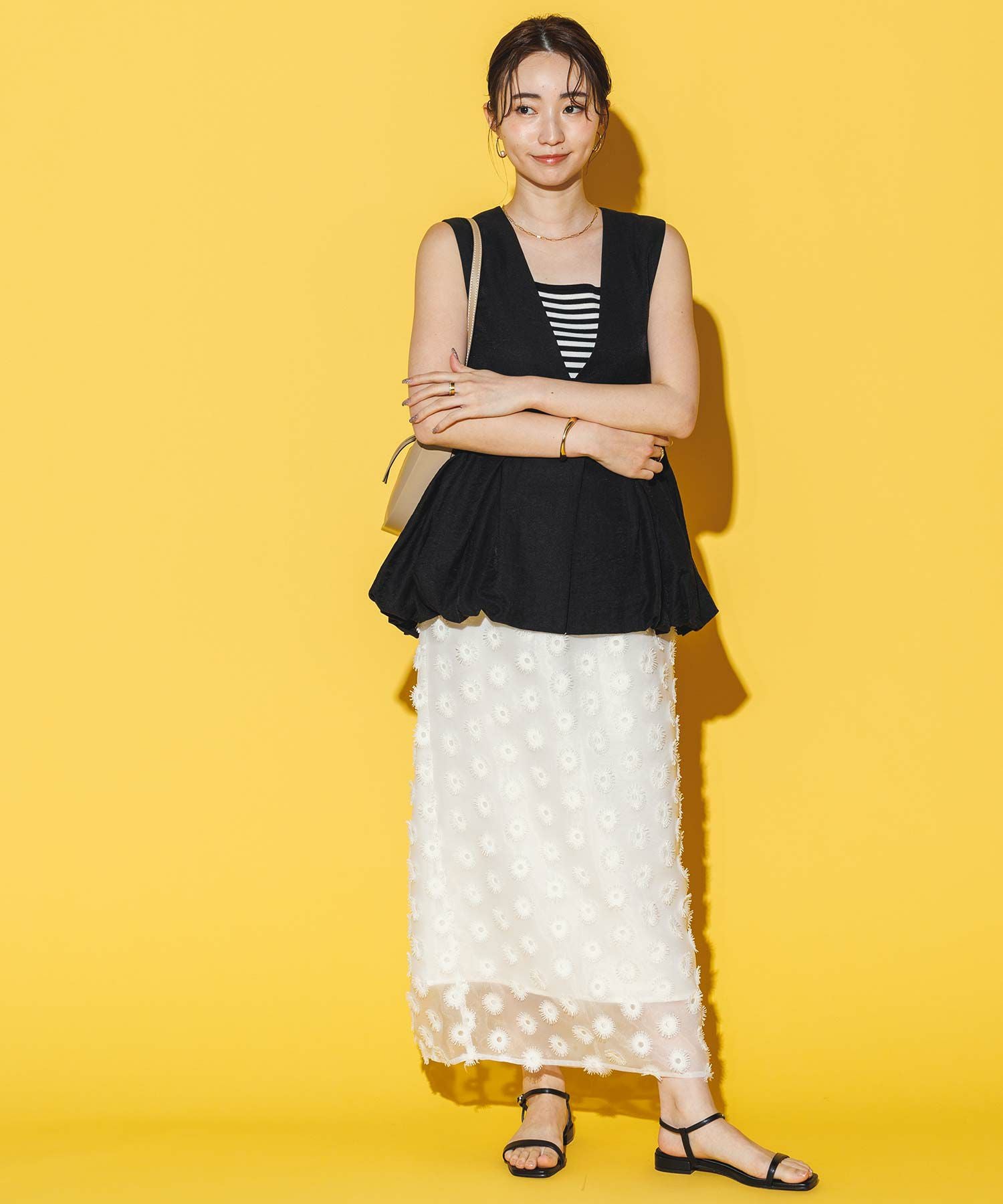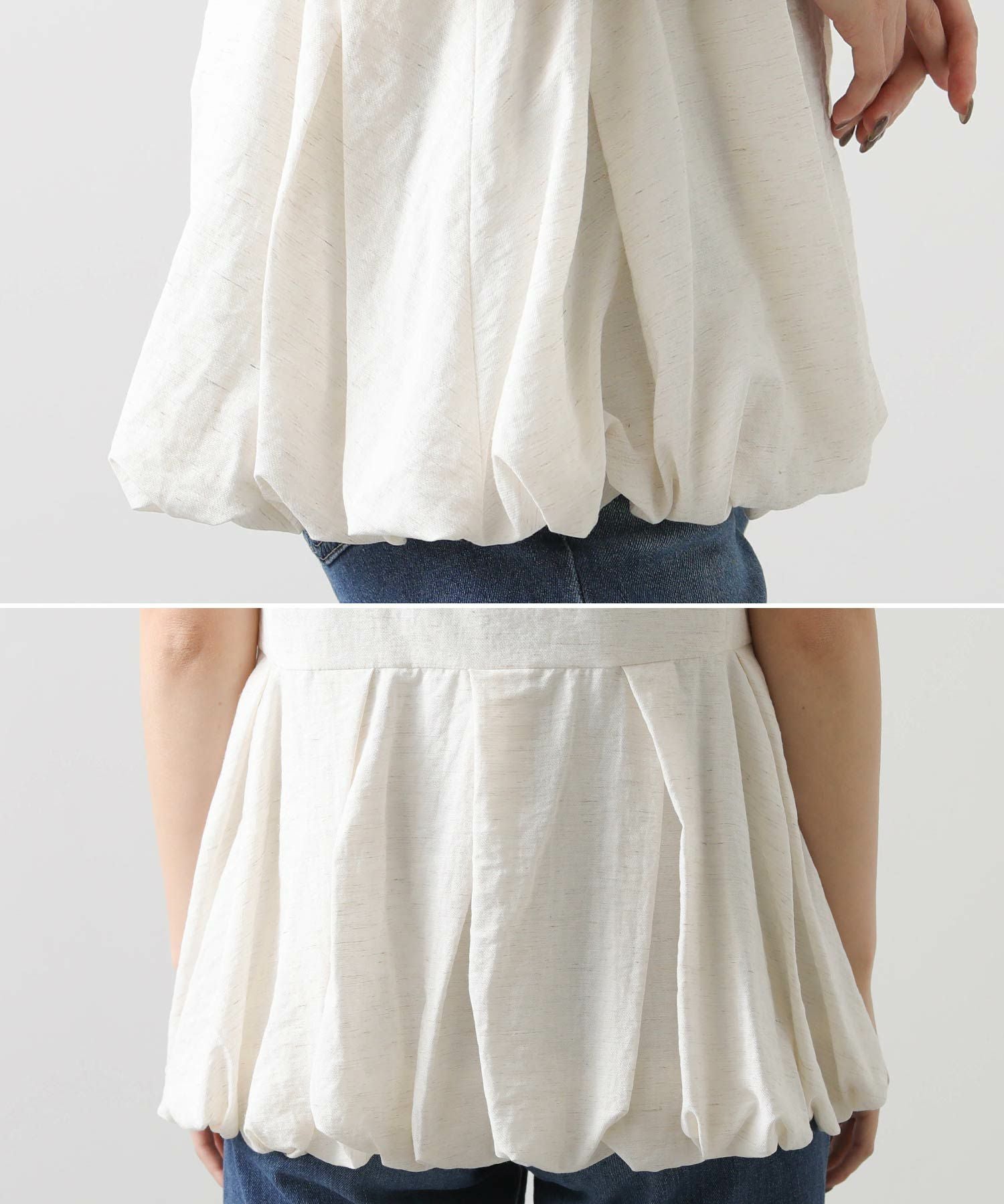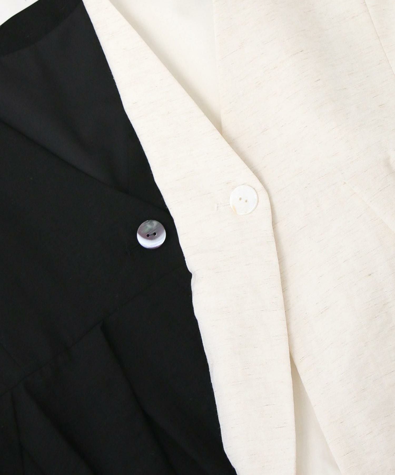 【Mewl/ミュール】から、リネン混素材を使用し、タック&ギャザーでボリュームを出したバルーンシルエットのベストをセレクト。