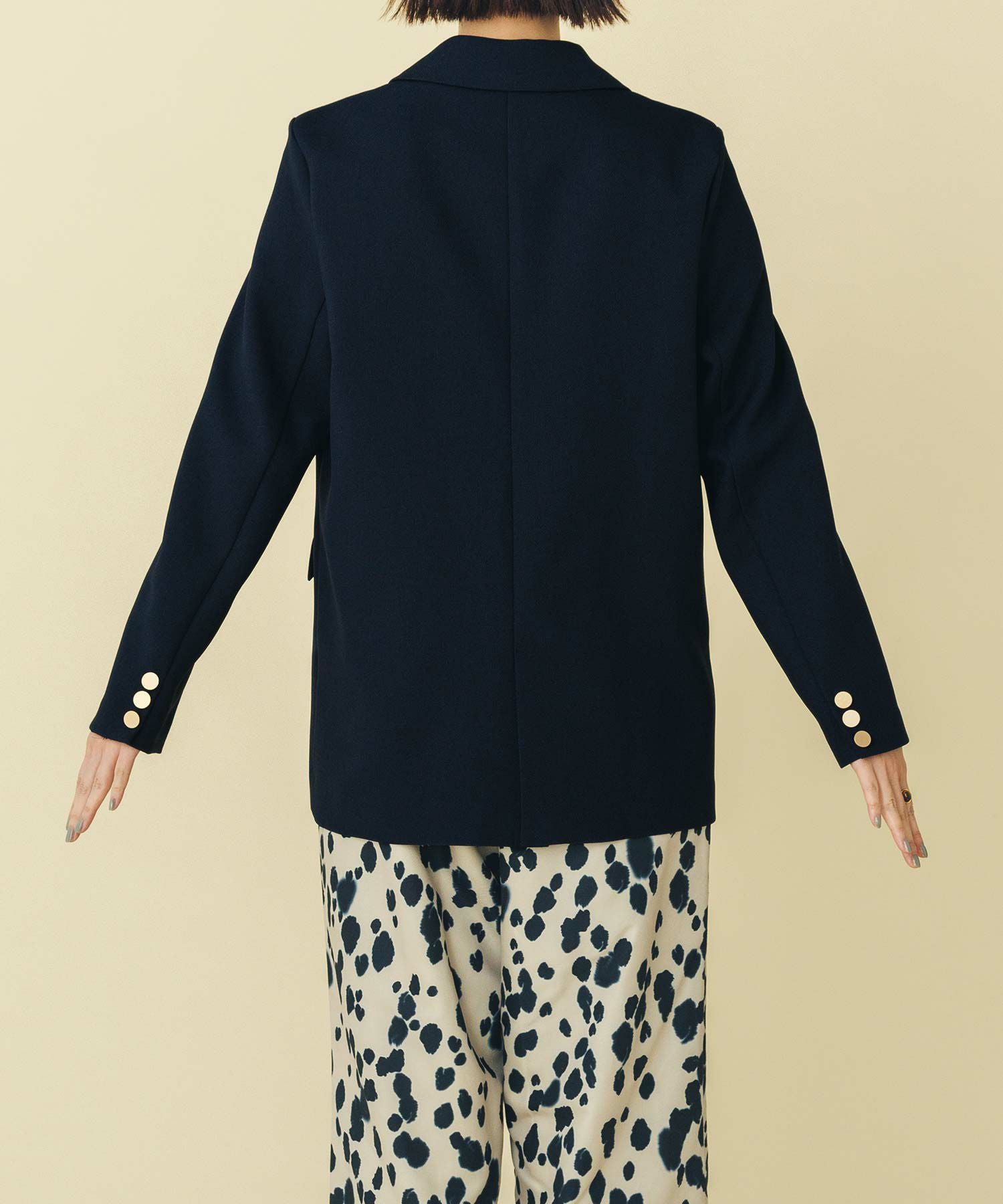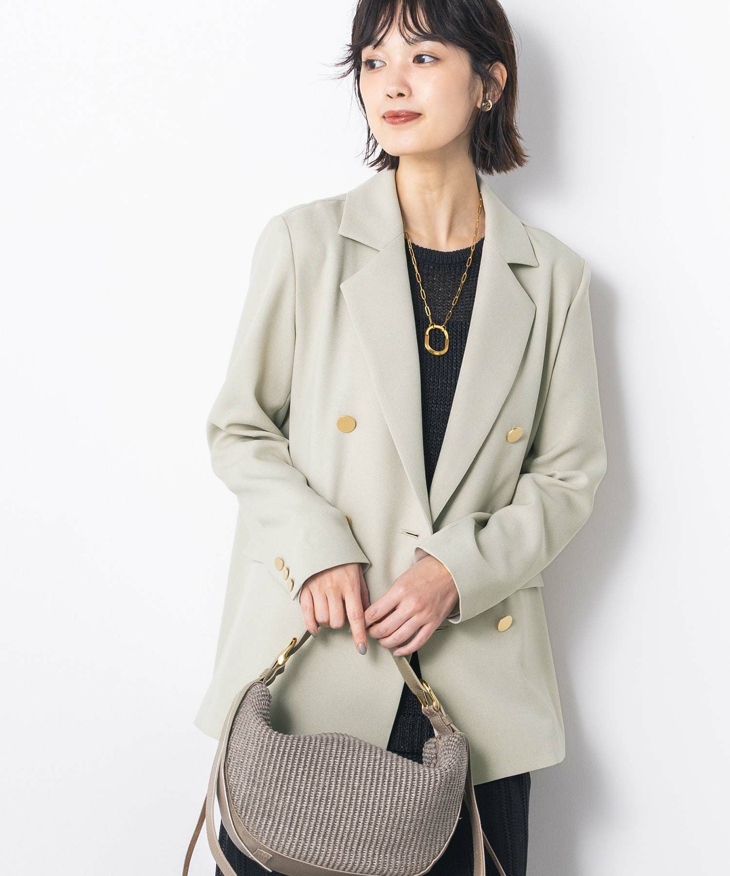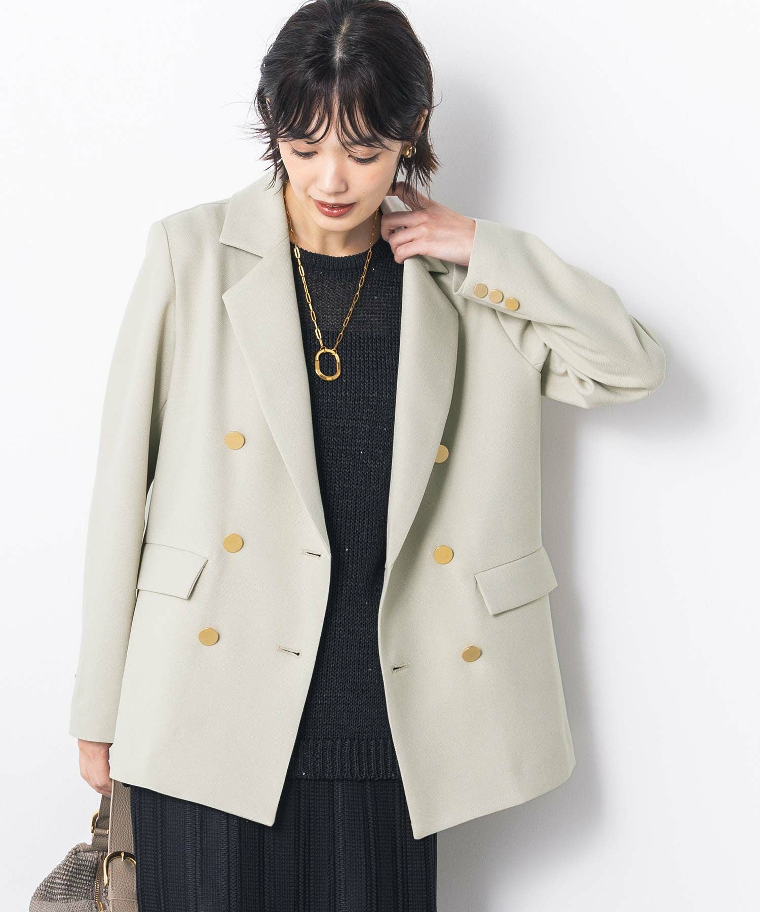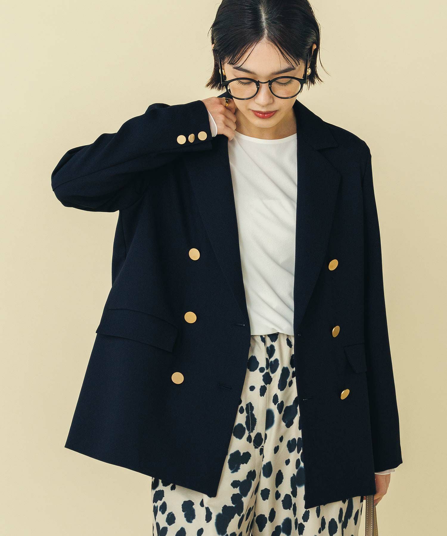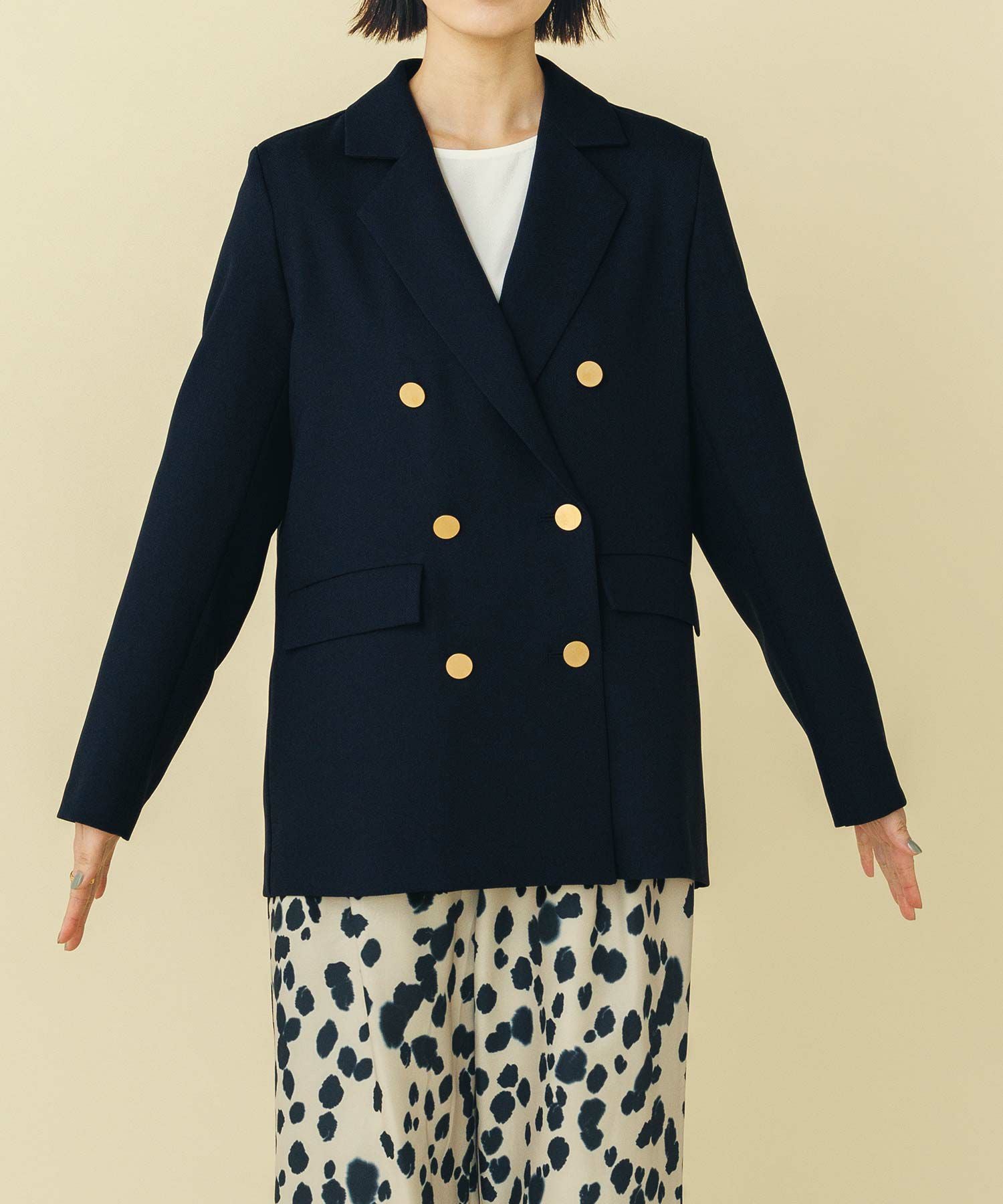 マルチに活躍するWフロントの金ボタンジャケット。ボクシーなシルエットでかっちりしすぎず気負わず羽織れます。