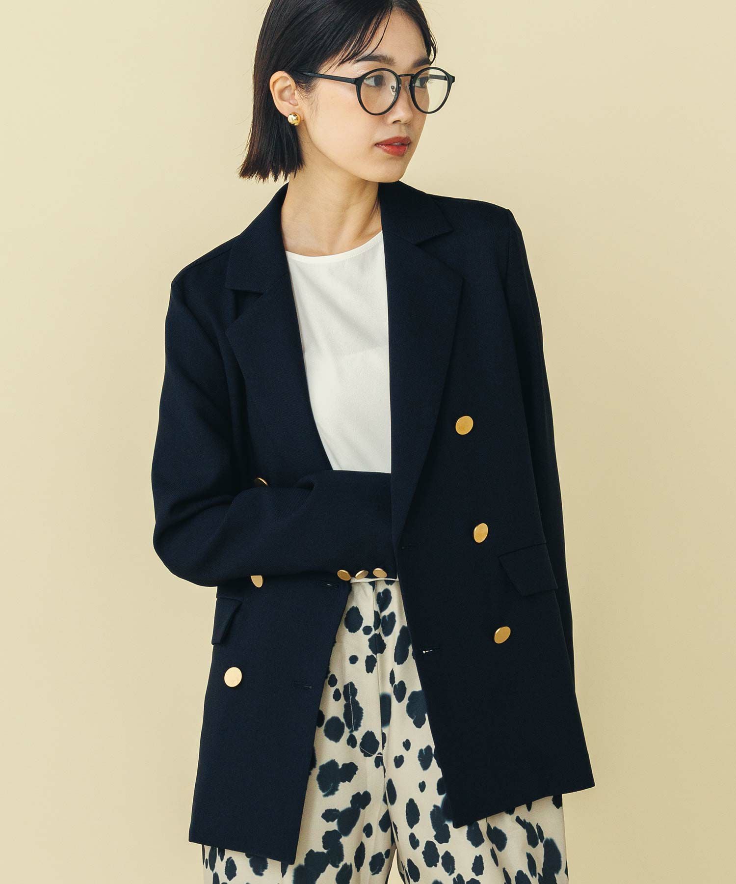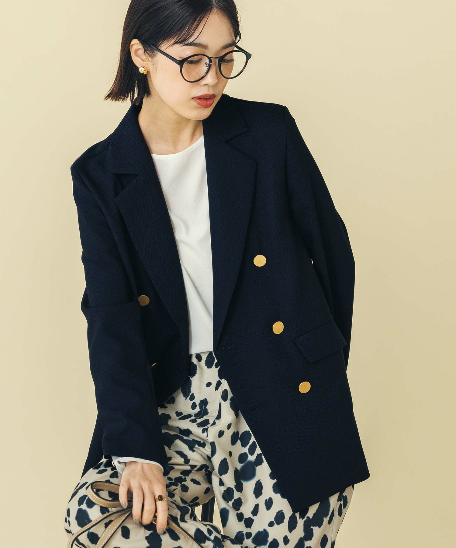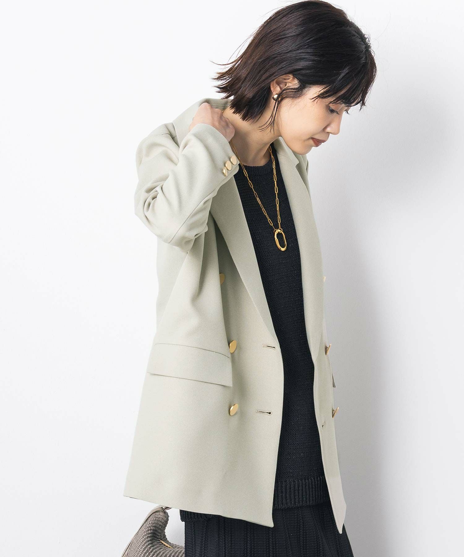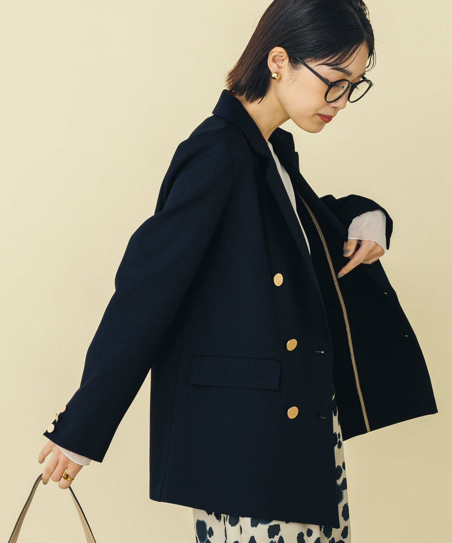 マルチに活躍するWフロントの金ボタンジャケット。ボクシーなシルエットでかっちりしすぎず気負わず羽織れます。