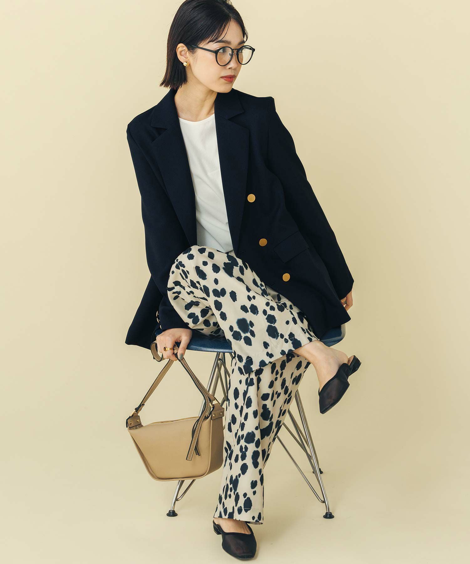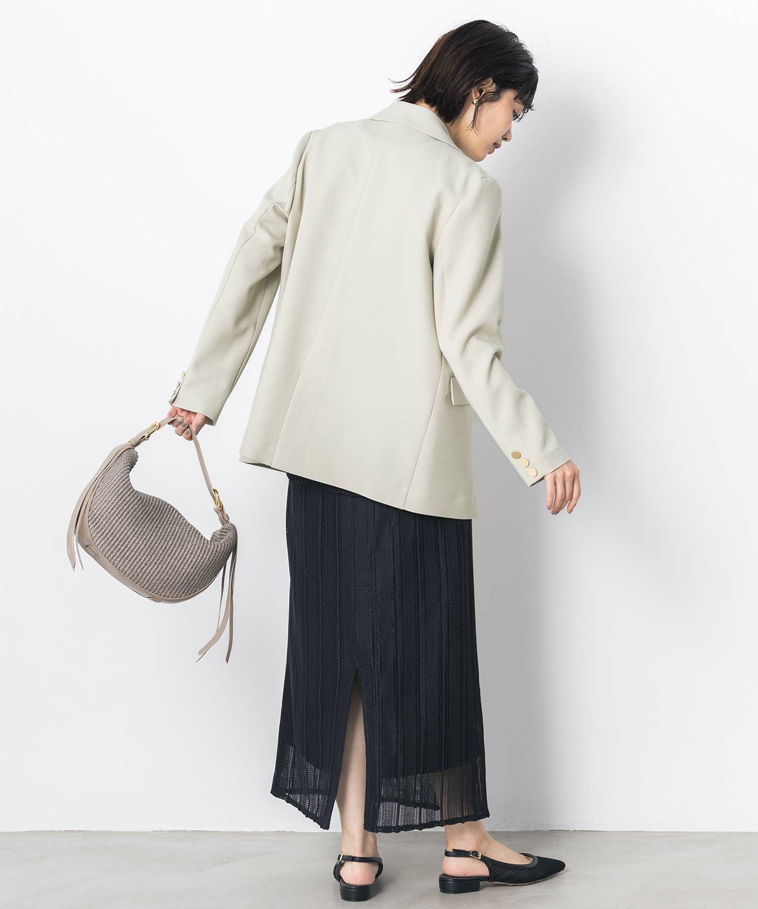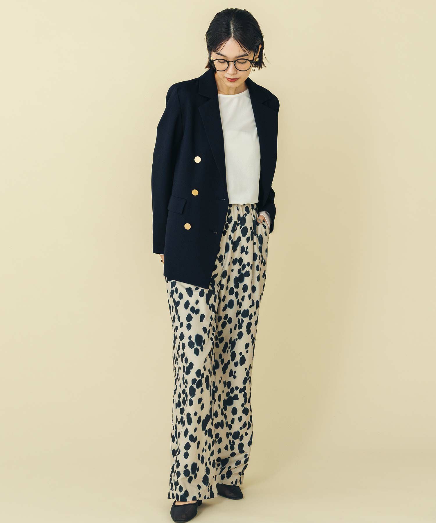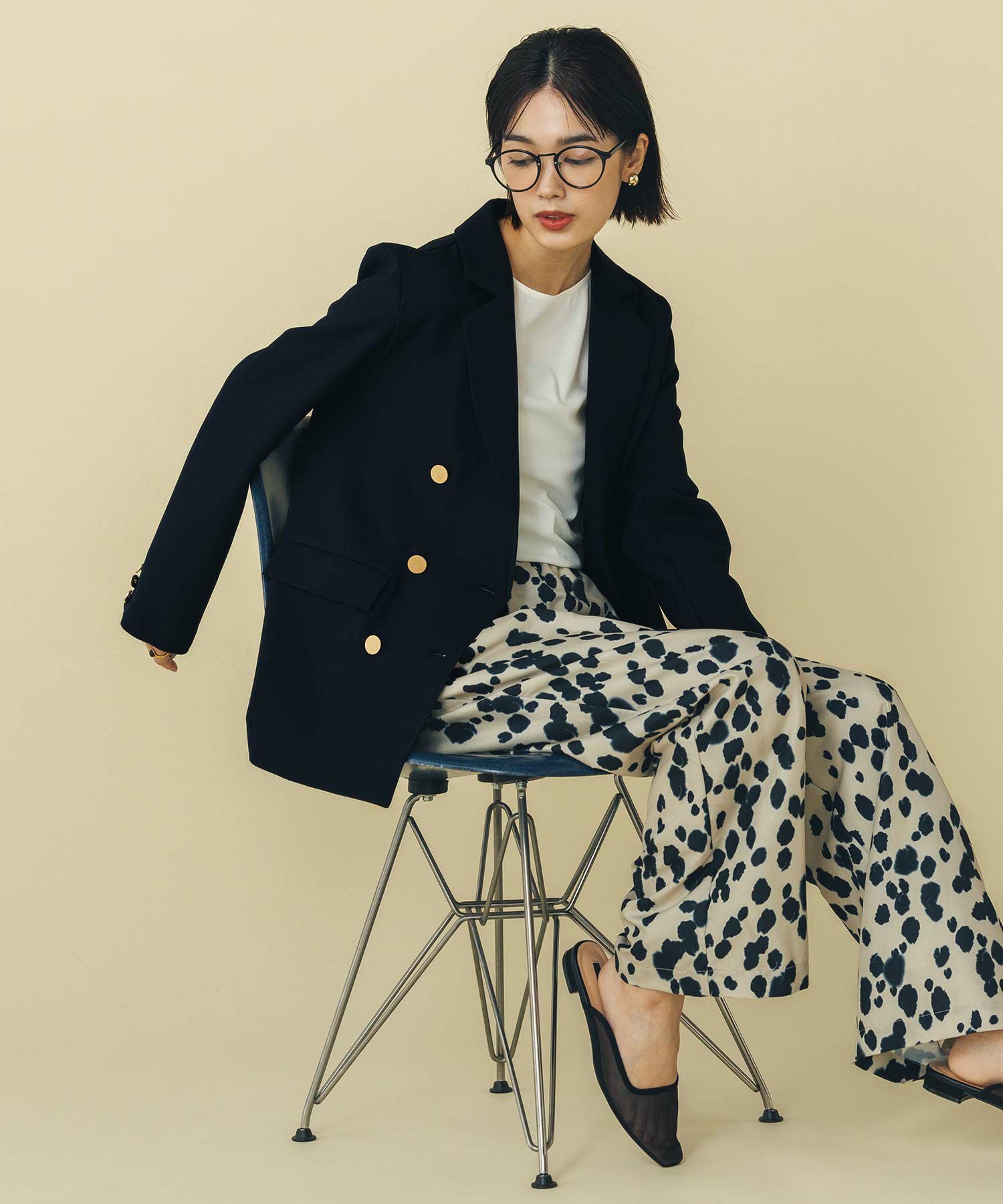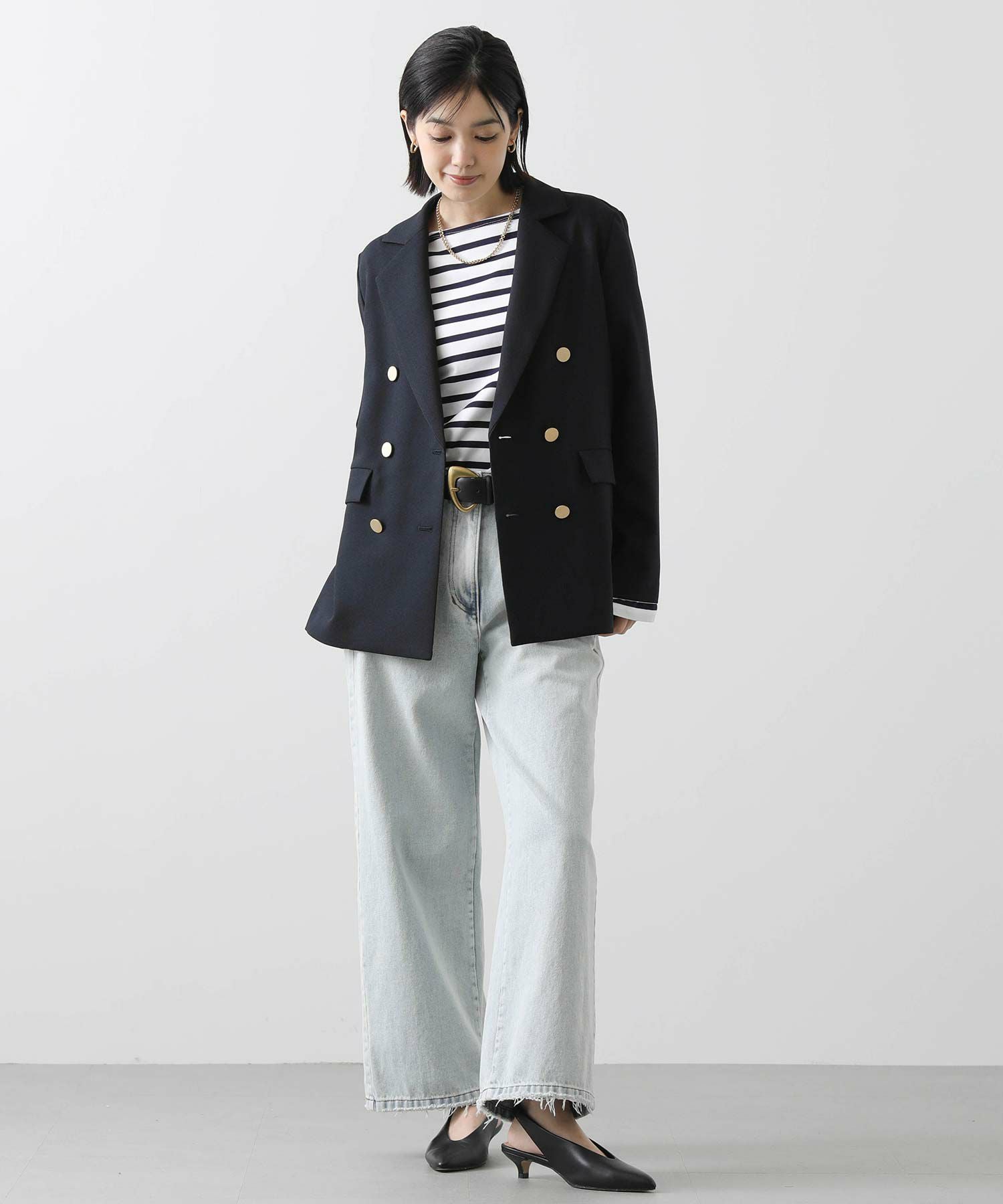 マルチに活躍するWフロントの金ボタンジャケット。ボクシーなシルエットでかっちりしすぎず気負わず羽織れます。