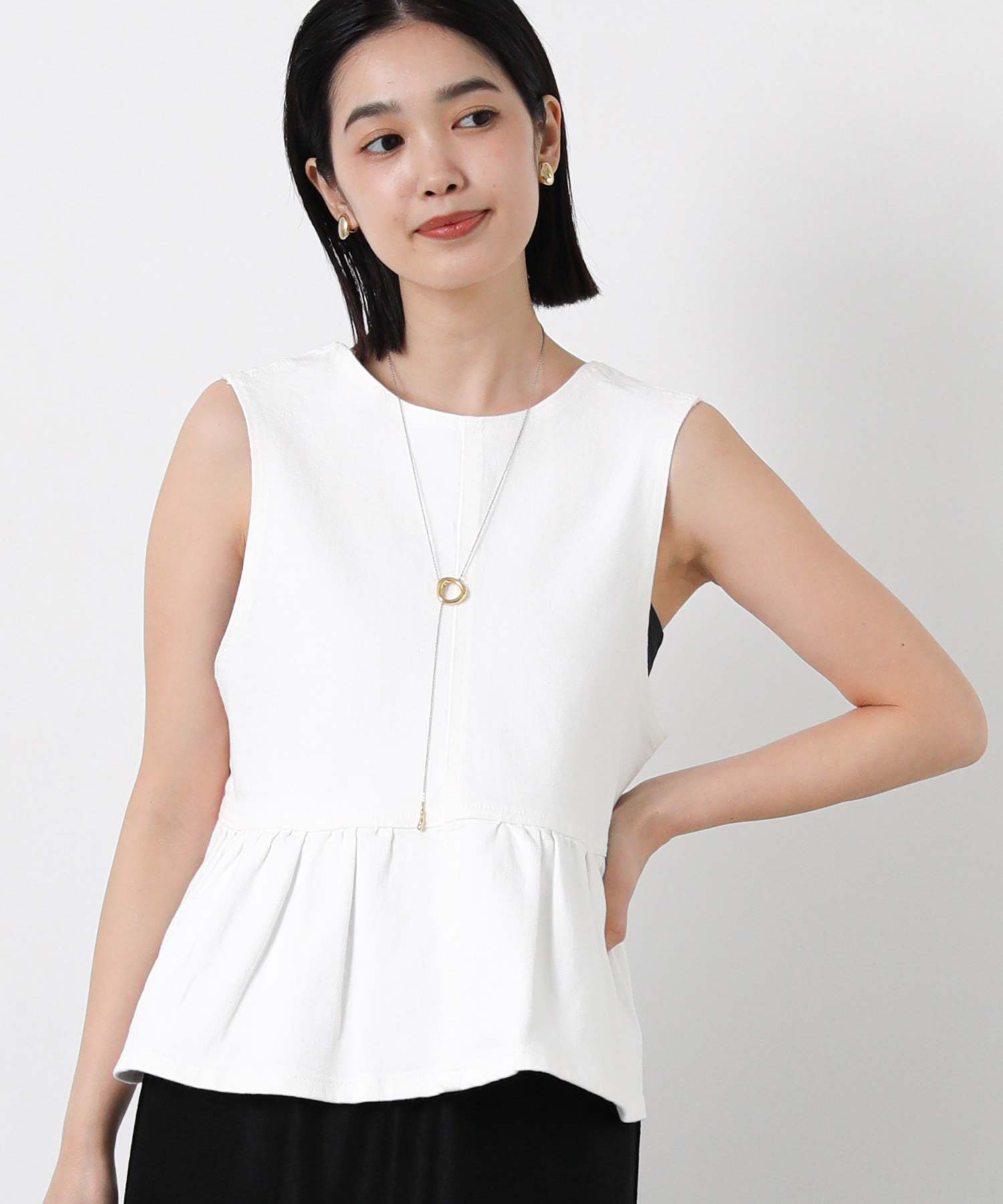 裾広がりのペプラムシルエットが、ウエストを細く見せる視覚効果を生み出し、スタイルアップを叶えます。