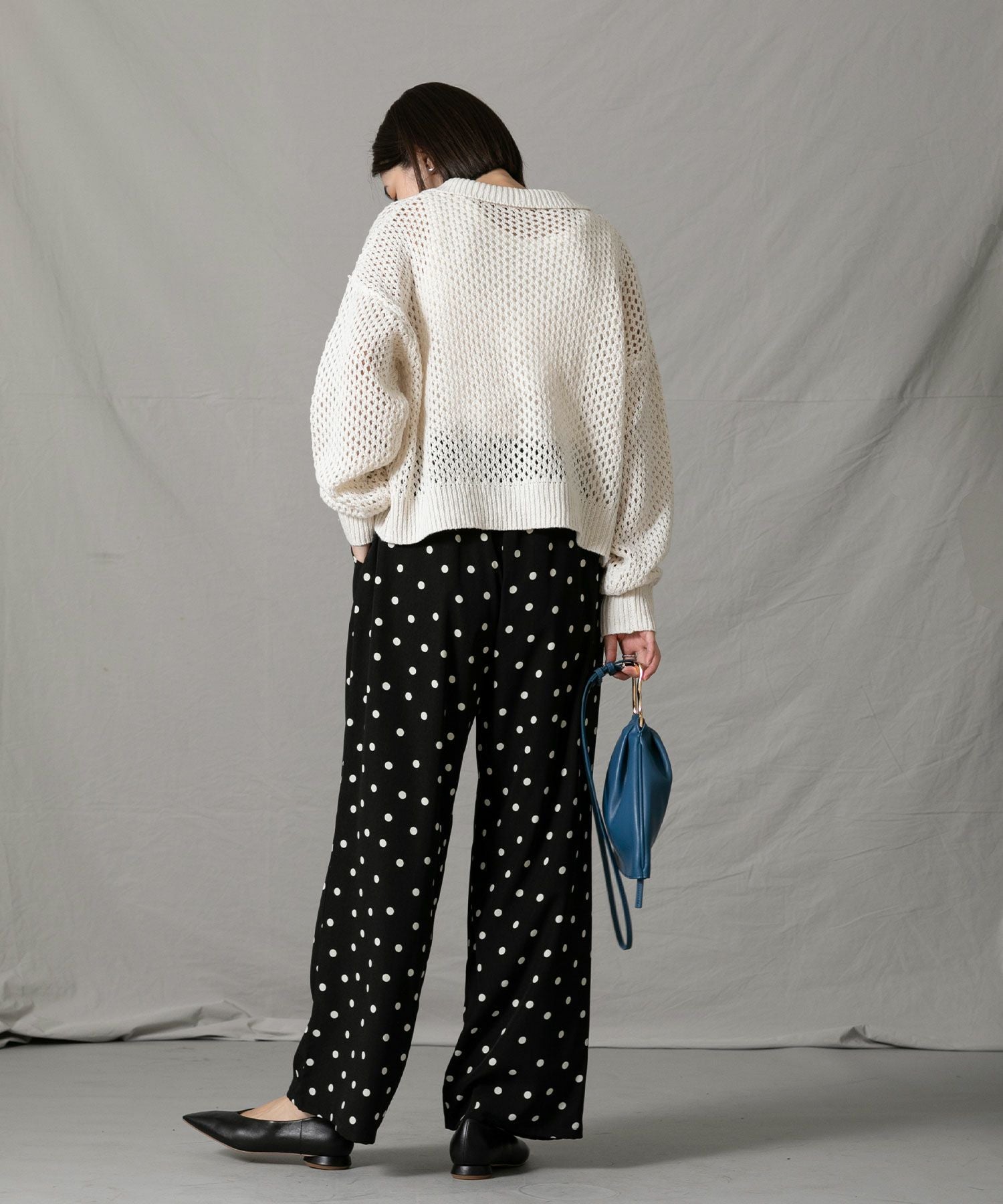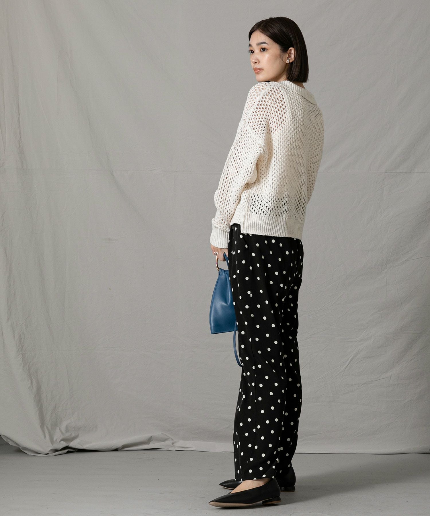 メッシュ素材のニットがこなれた雰囲気をプラス。着丈が短めなのでワイドパンツやスカートなどボリュームのあるボトムともバランス良く着ていただけます。