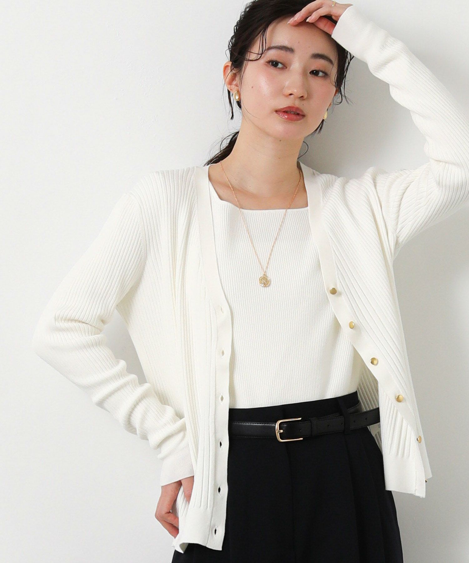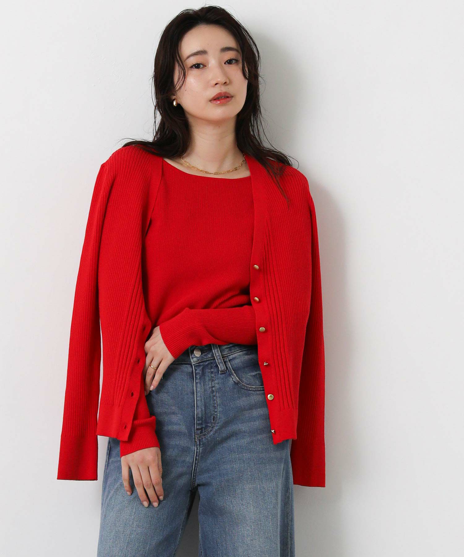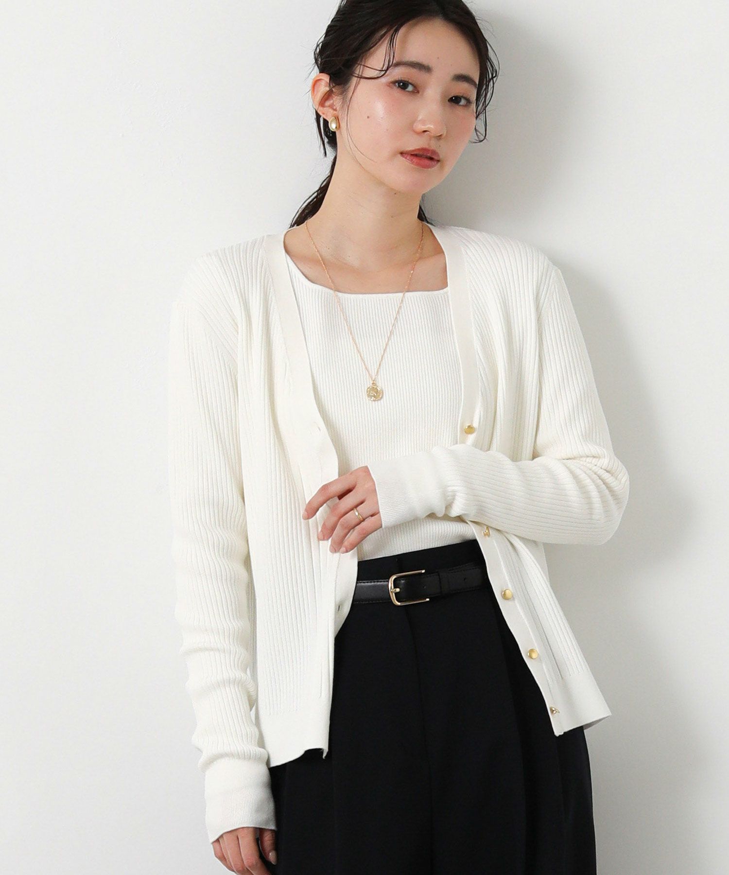 羽織としても、ボタンを止めてタンクやキャミと合わせてプルオーバーのようにした着こなしもオススメ。