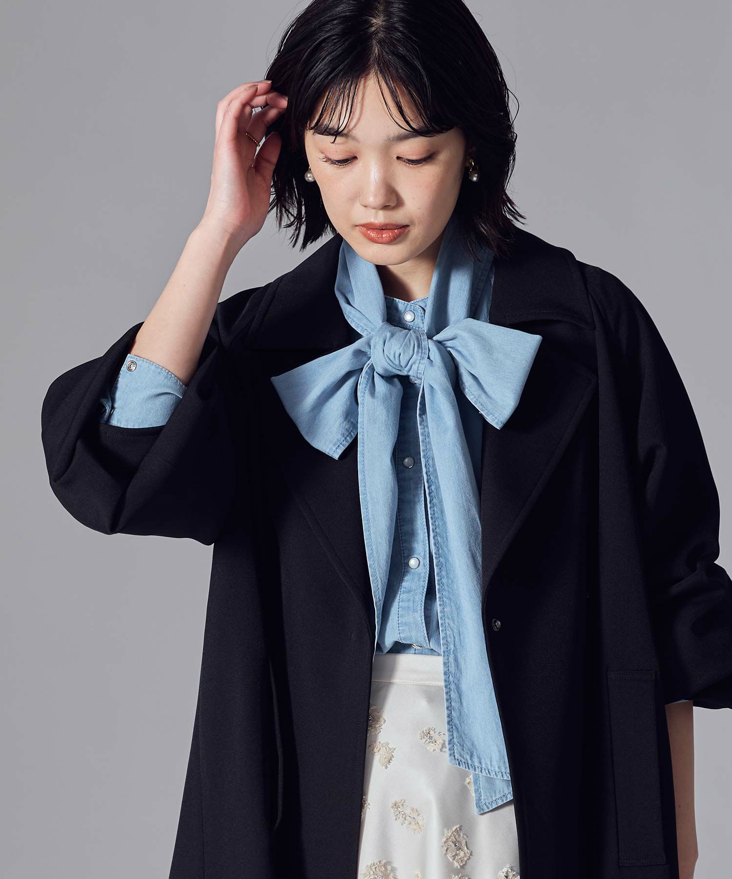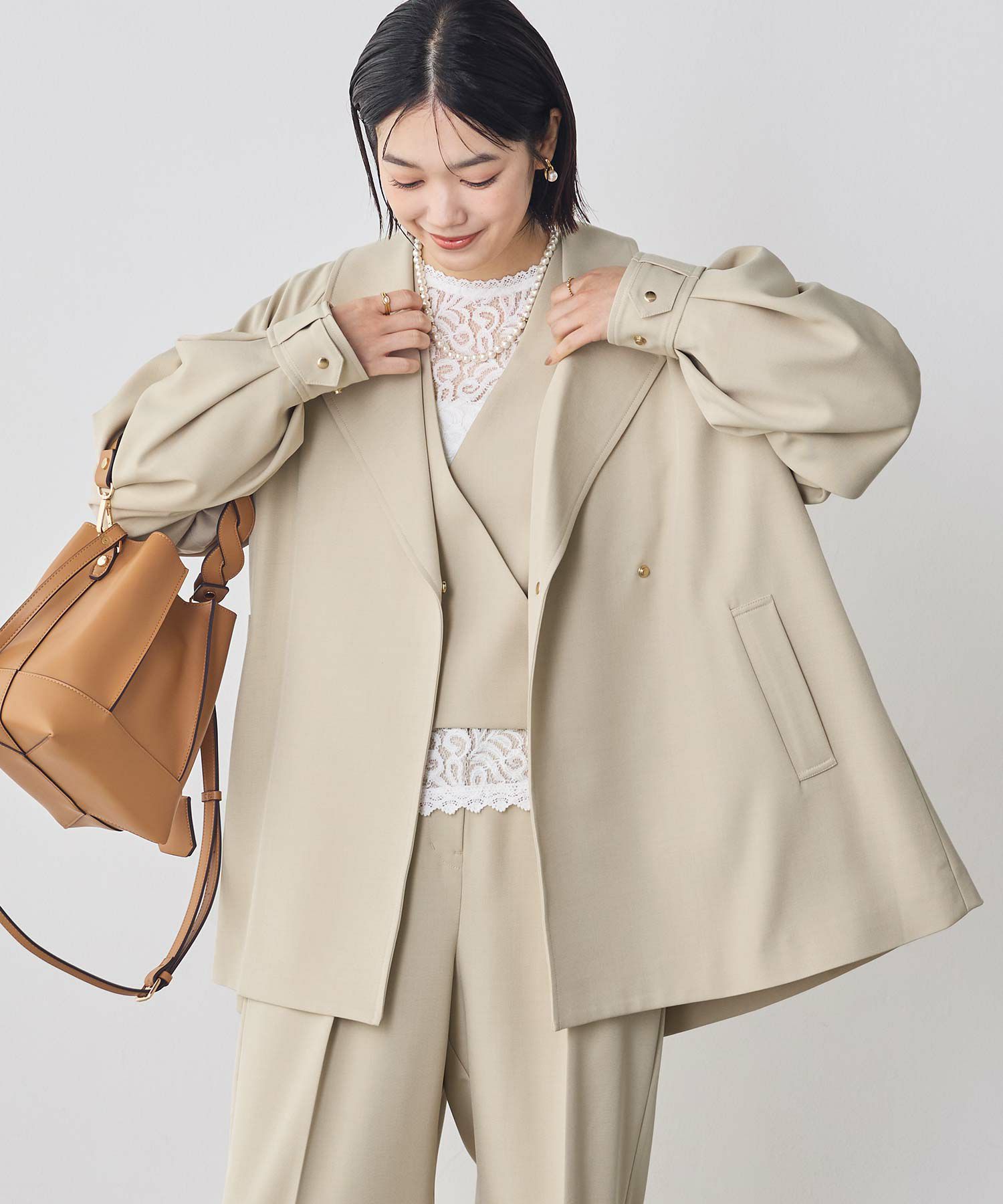袖口はギュッと絞ってボリュームを出したり、あえて釦を金属のドットにしてシンプルに仕上げる着こなしも。