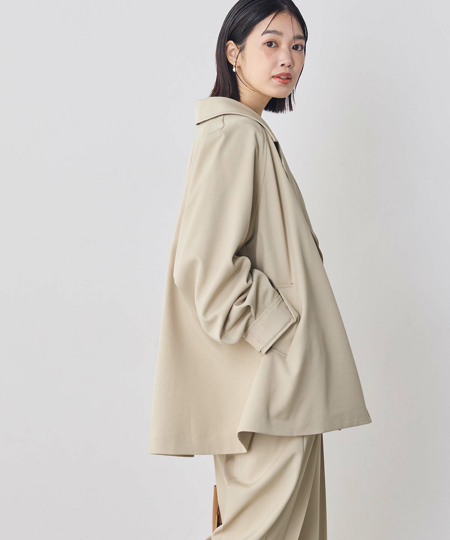 トラディショナルなトレンチコートのディティールを取り入れながら、Aラインに広がるテント型のシルエットがトレンド感のある印象に仕上げたコート。