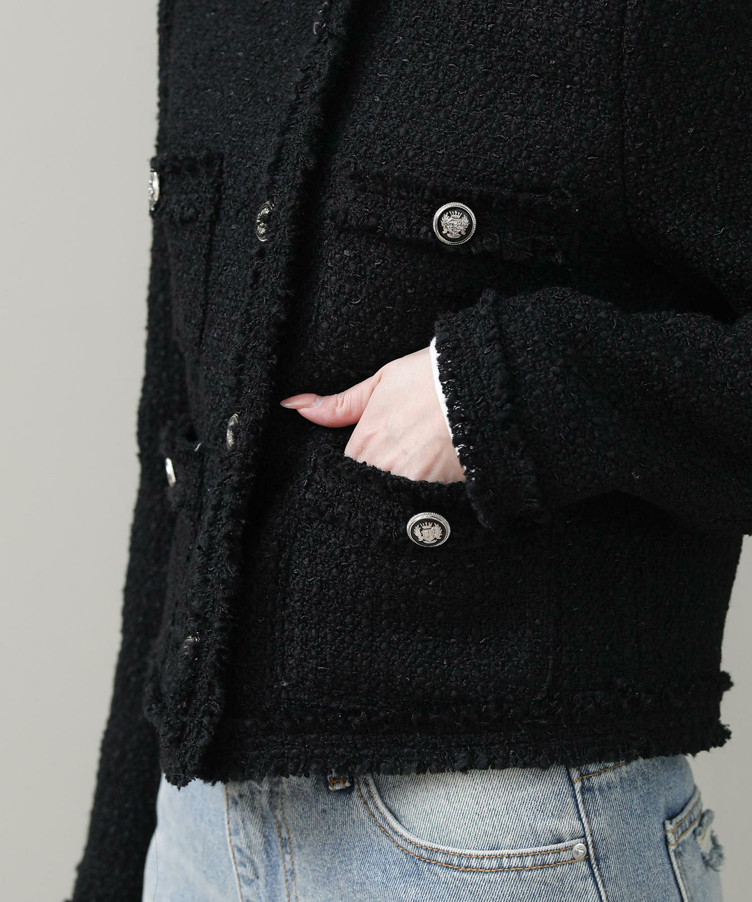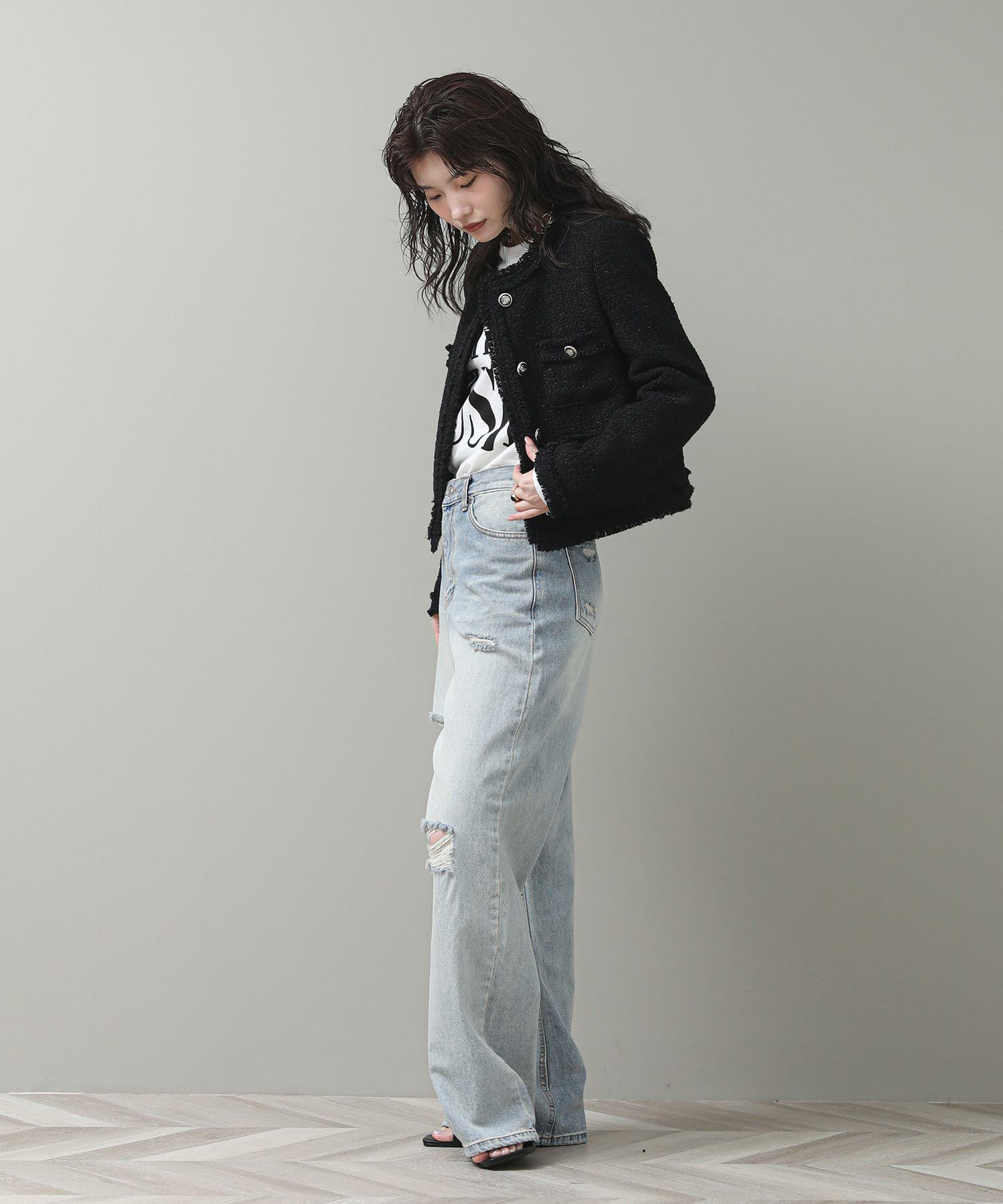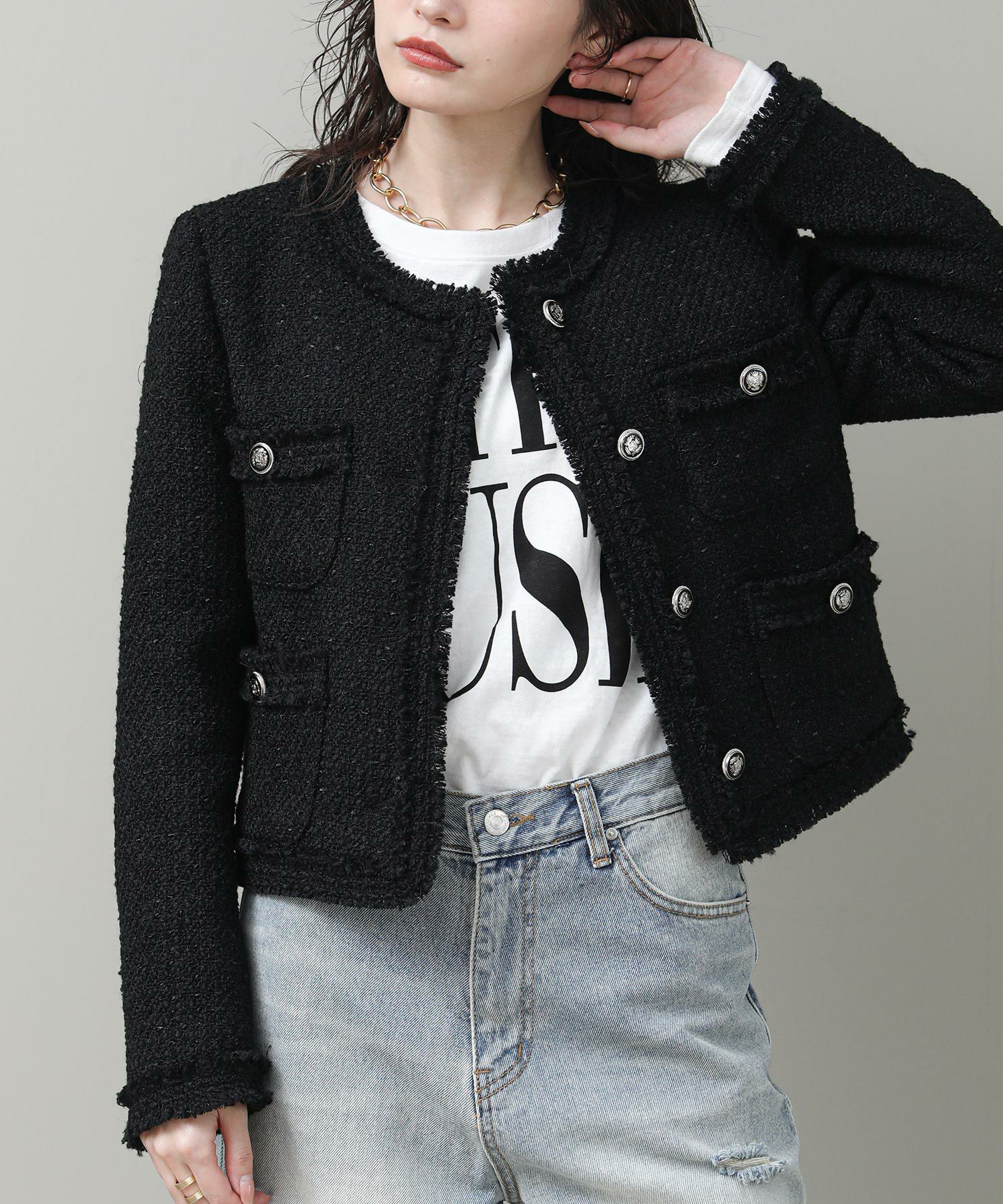 コンパクトなシルエットとブラックのシックな表情がリジョイスらしいアイテムです。普段使いならダメージデニムなどカジュアルボトムとコントラストのあるスタイルがおすすめ。タンクやTシャツにさっと羽織るだけでサマになります。