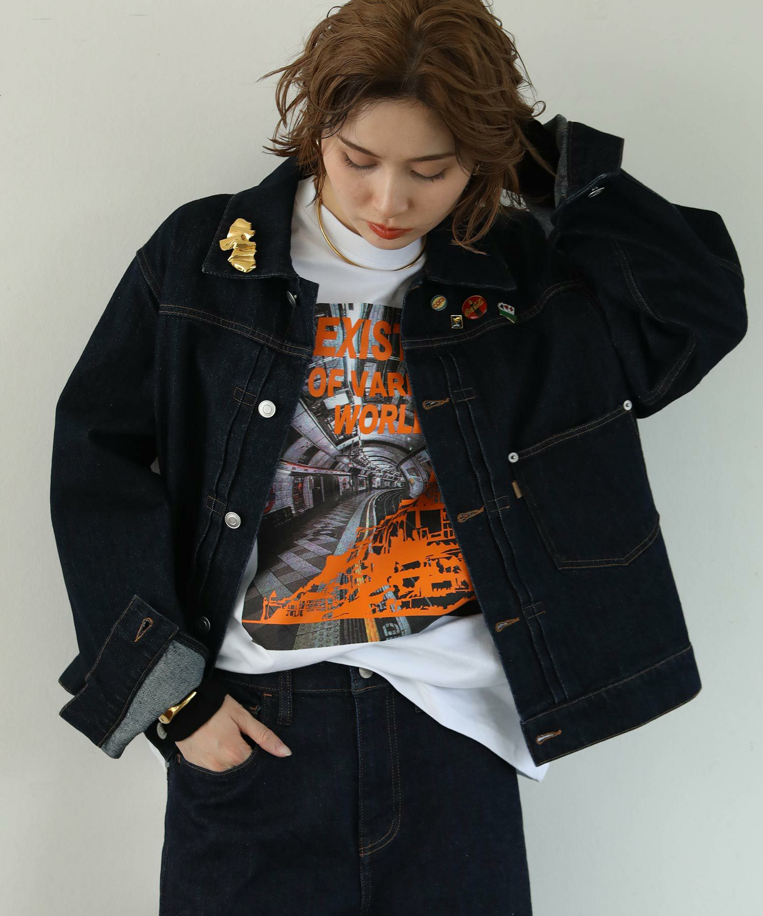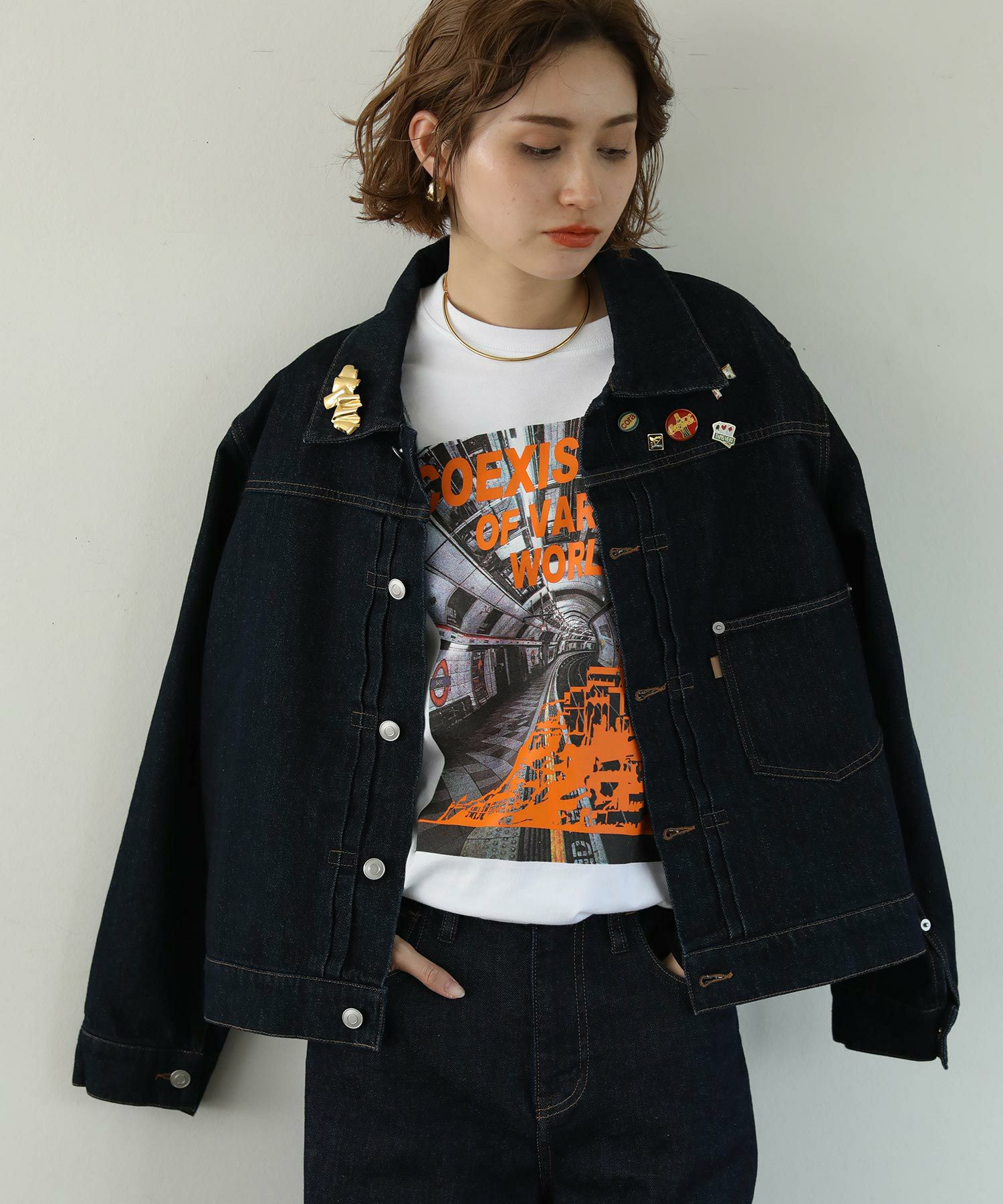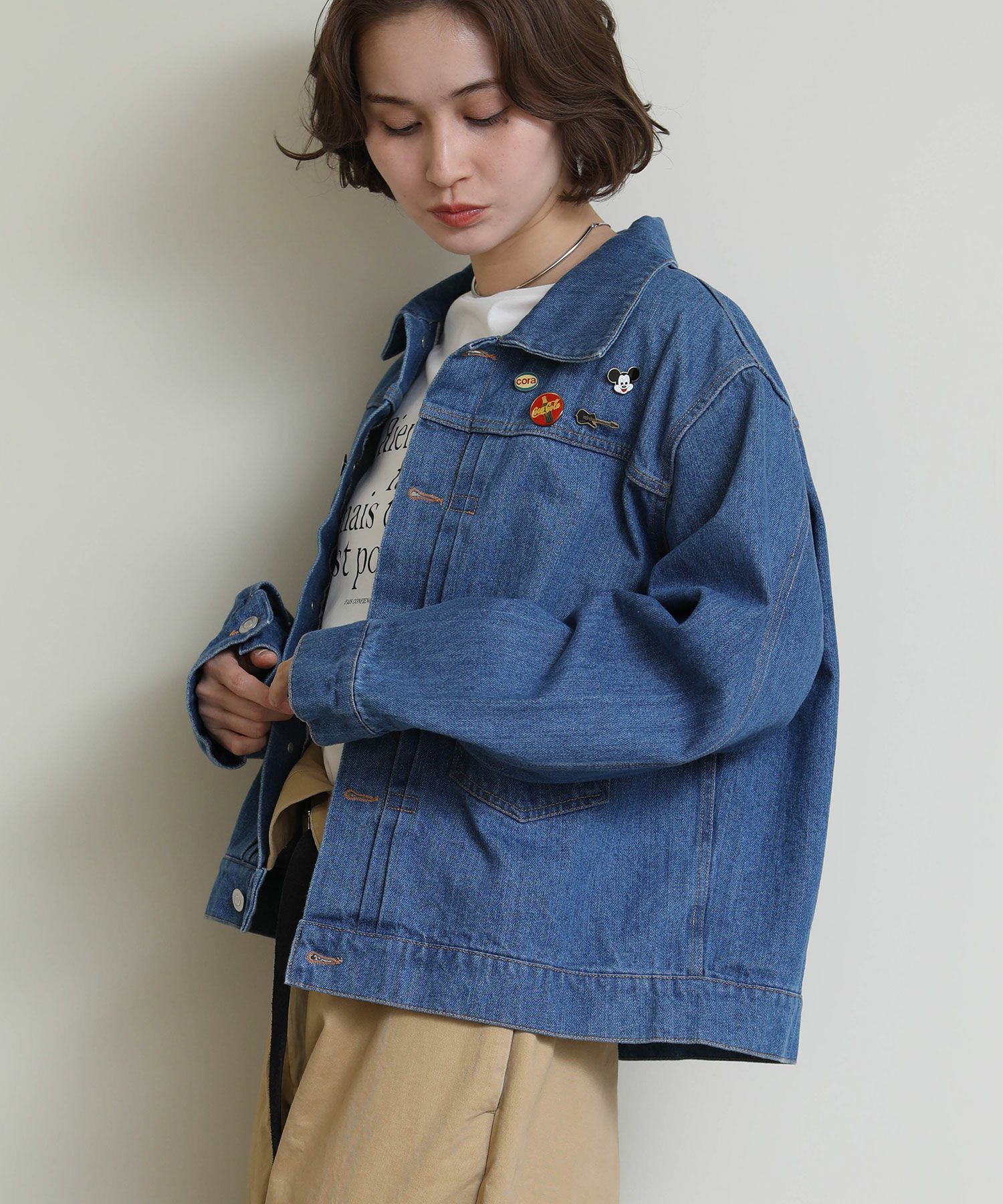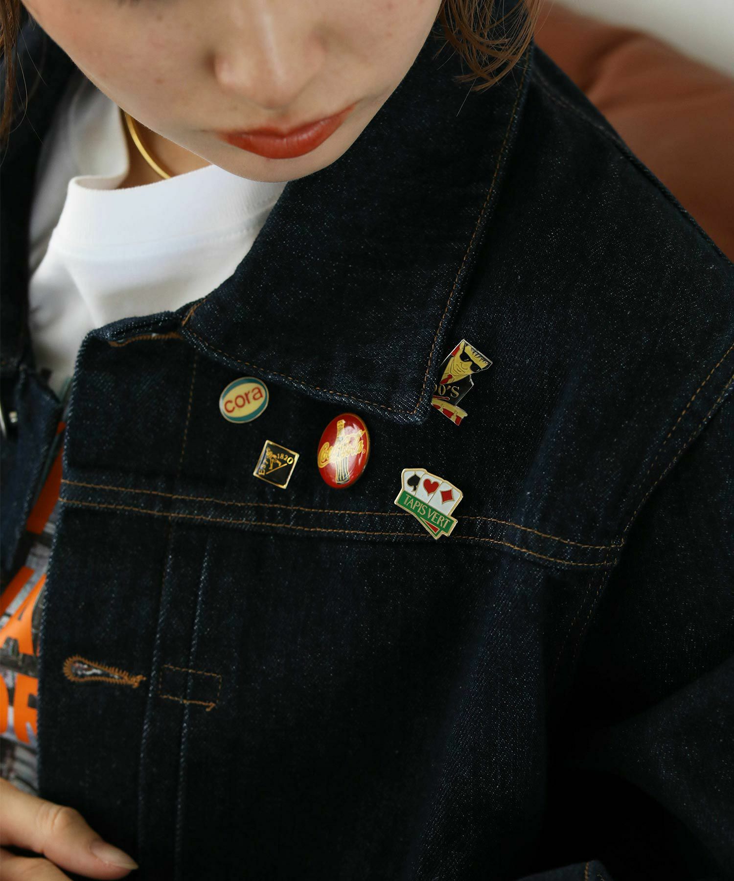※デニムジャケットをご購入いただいたお客様にはビンテージのピンバッジをランダムで5個プレゼント!商品と同梱してお届けいたします。(ブローチは付属しません。)