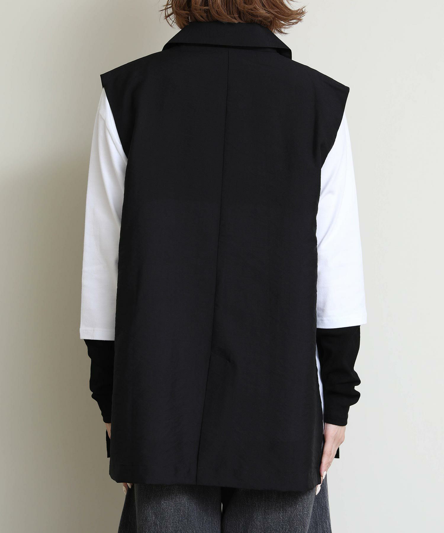 両サイドのバックルがポイントのジレ。