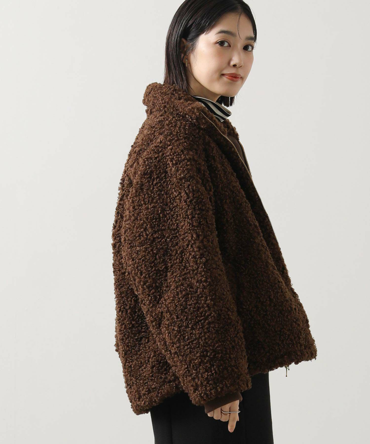 毛足が長めのプードルボアを使用したハイネックブルゾン。