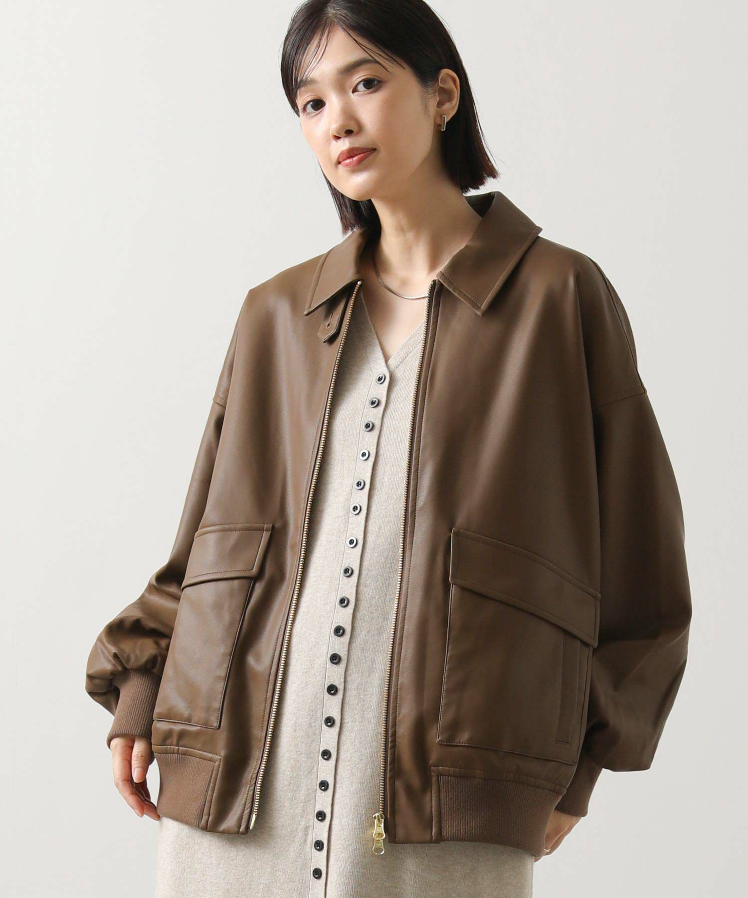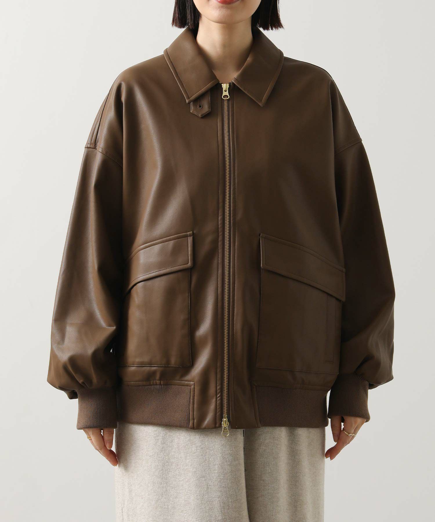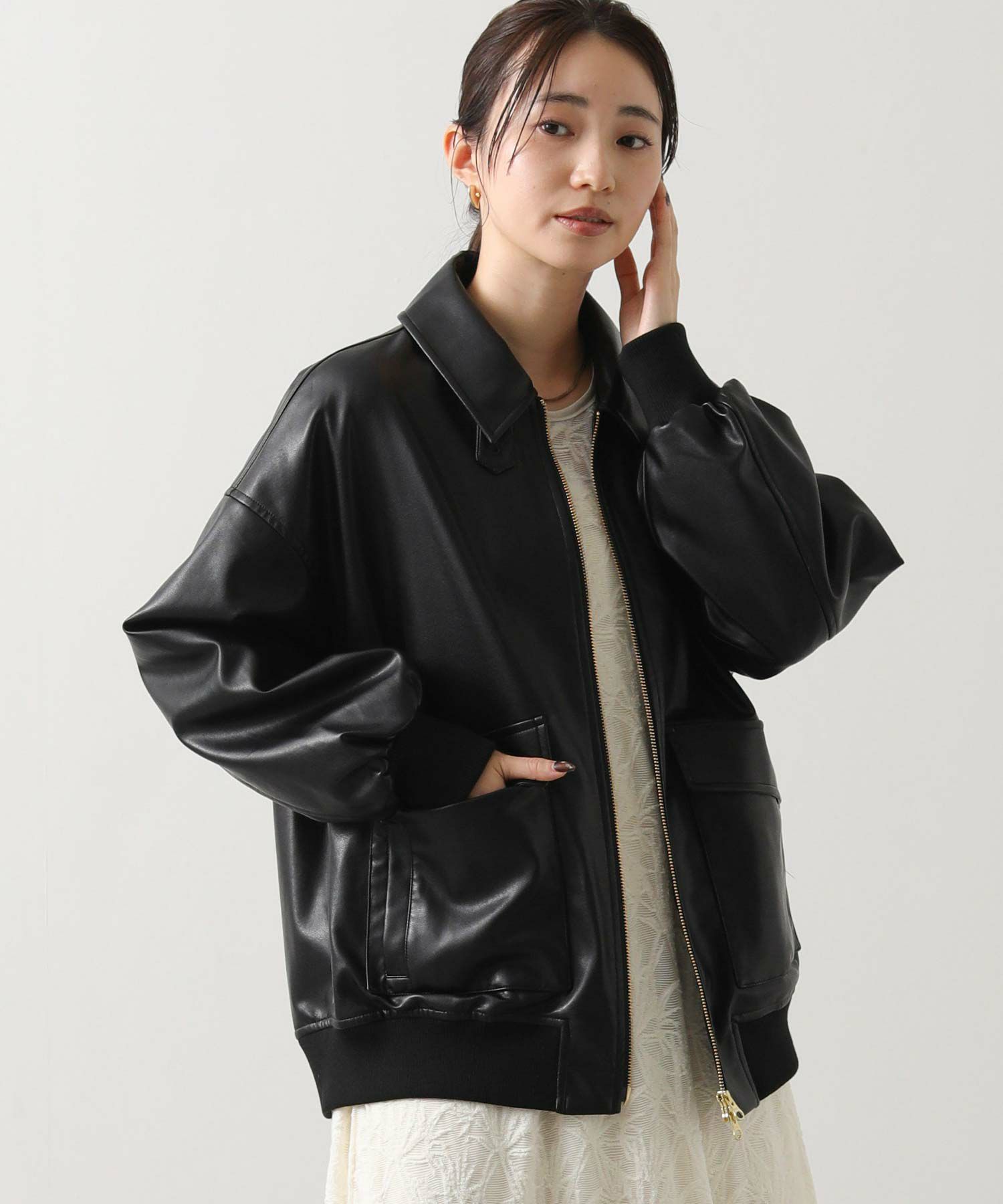 オーバーサイズですが、リアルレザーと違い軽くて羽織りやすいのでデイリー使いにオススメ。