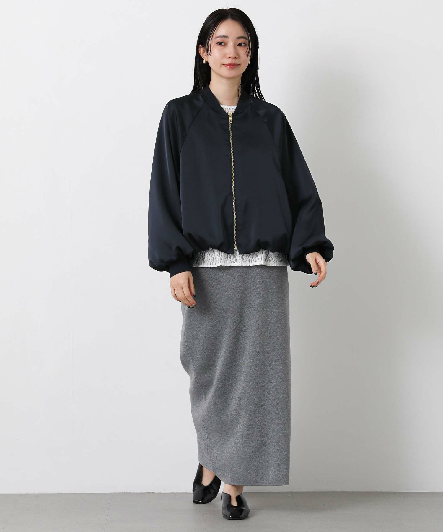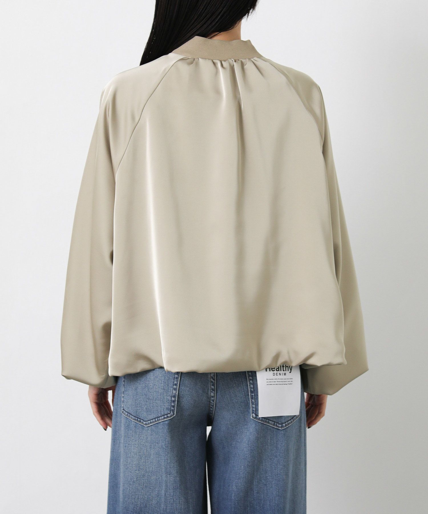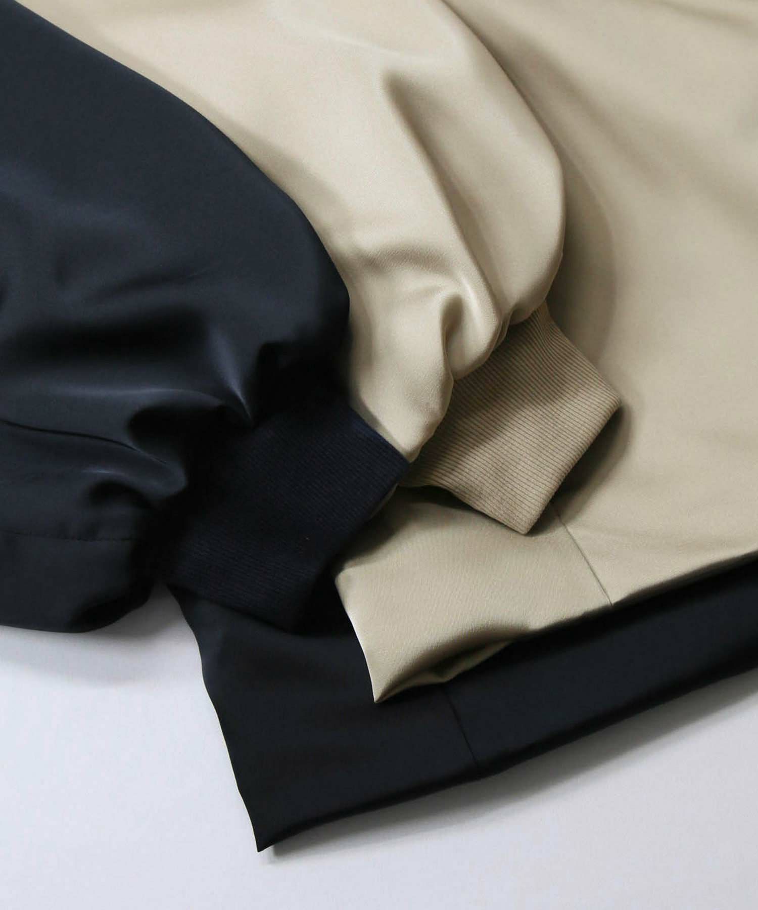 なめらかな微光沢感が美しいサテン素材を使用したブルゾン。