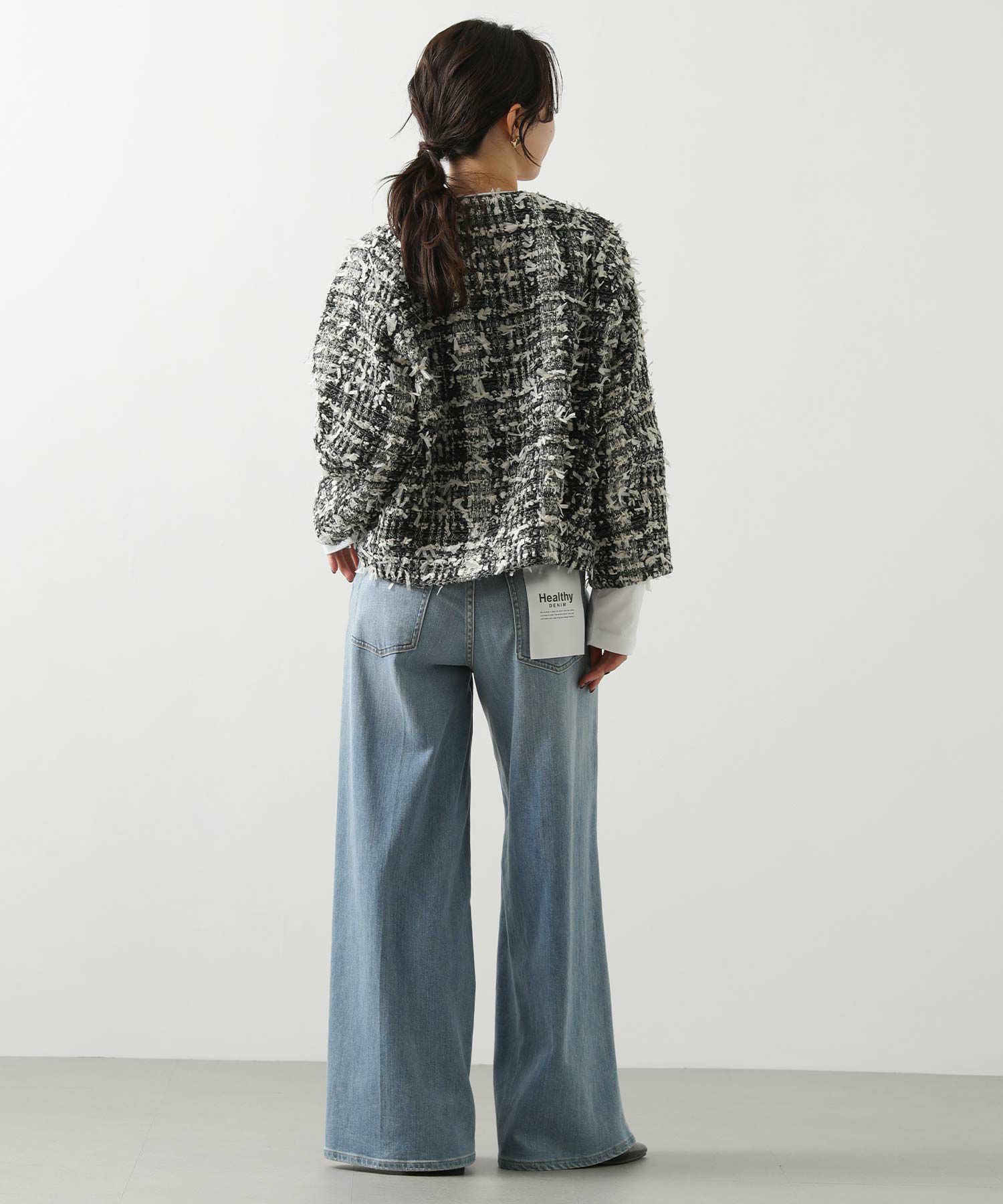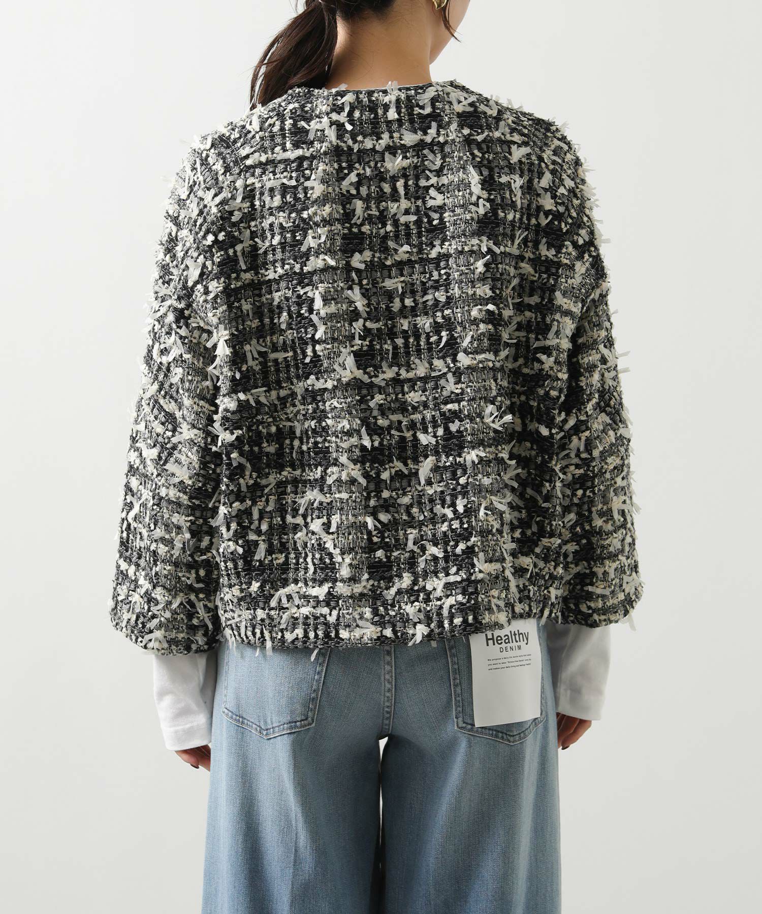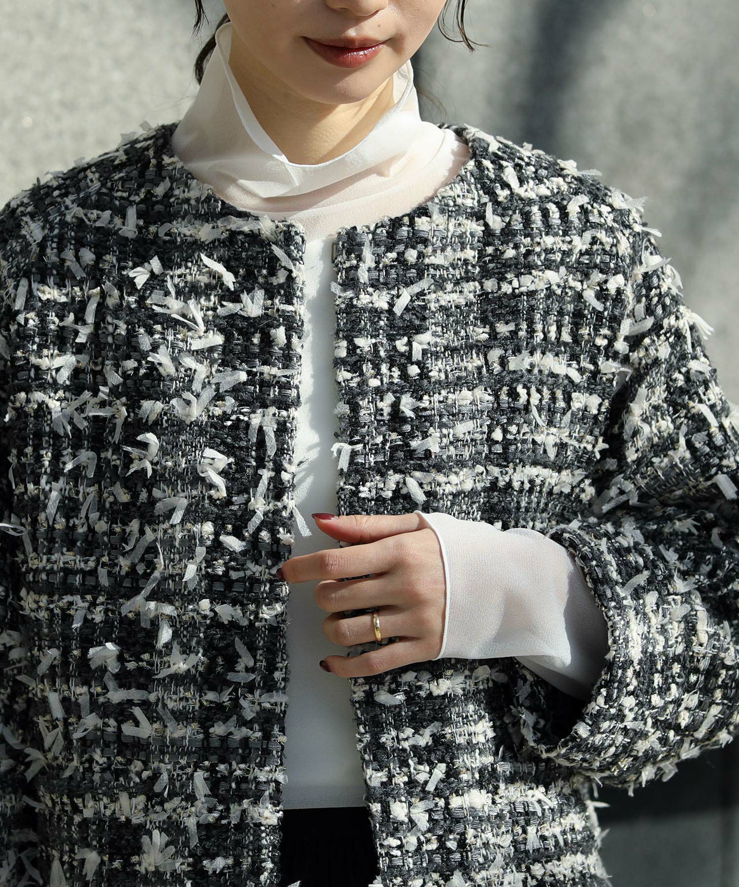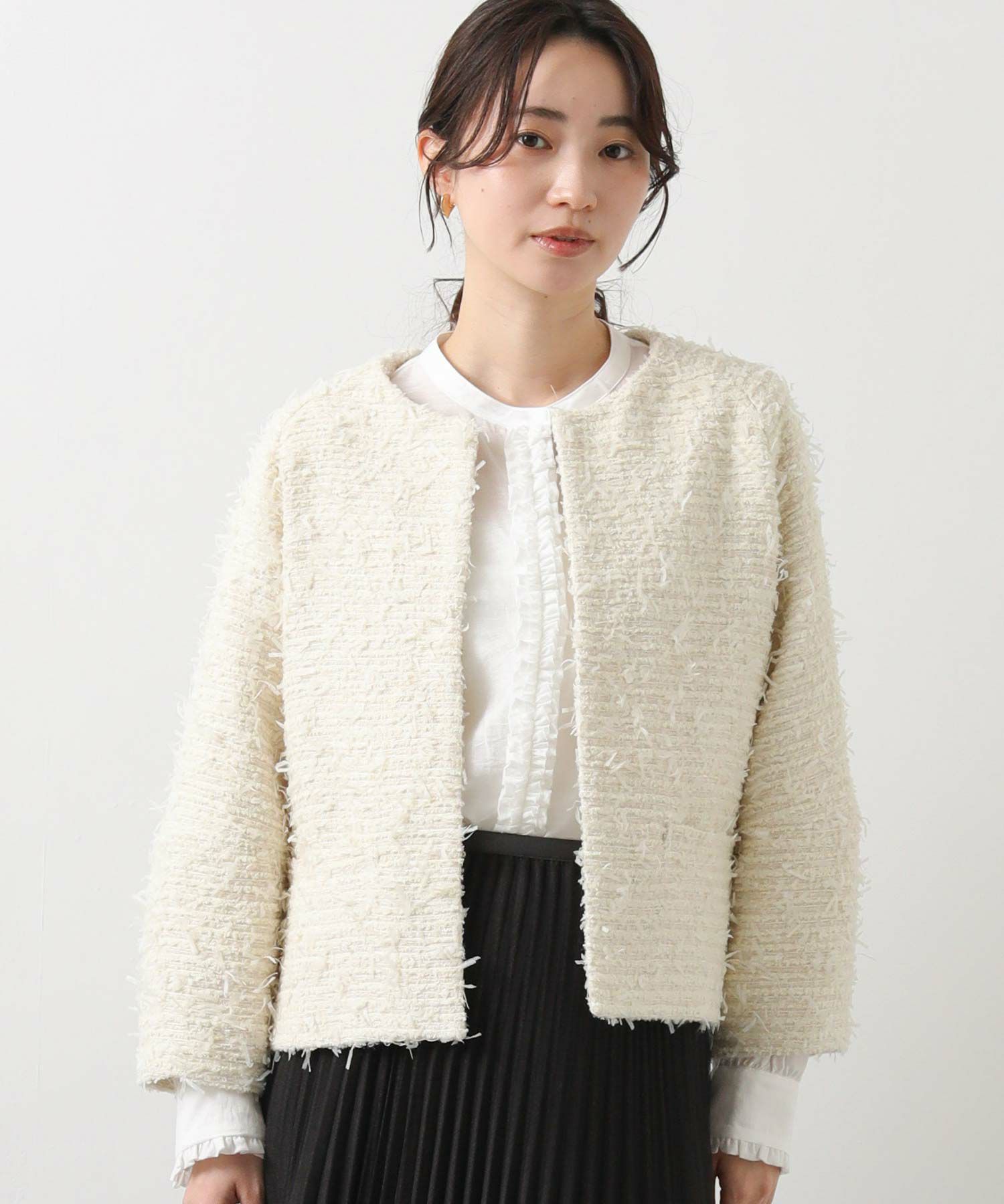 ツイードジャケット特有のカチッとした着難さをなくした、ラグランスリーブと丸みのあるシルエット、身幅もゆったりしているので窮屈感なく柔らかい印象で着用できます。