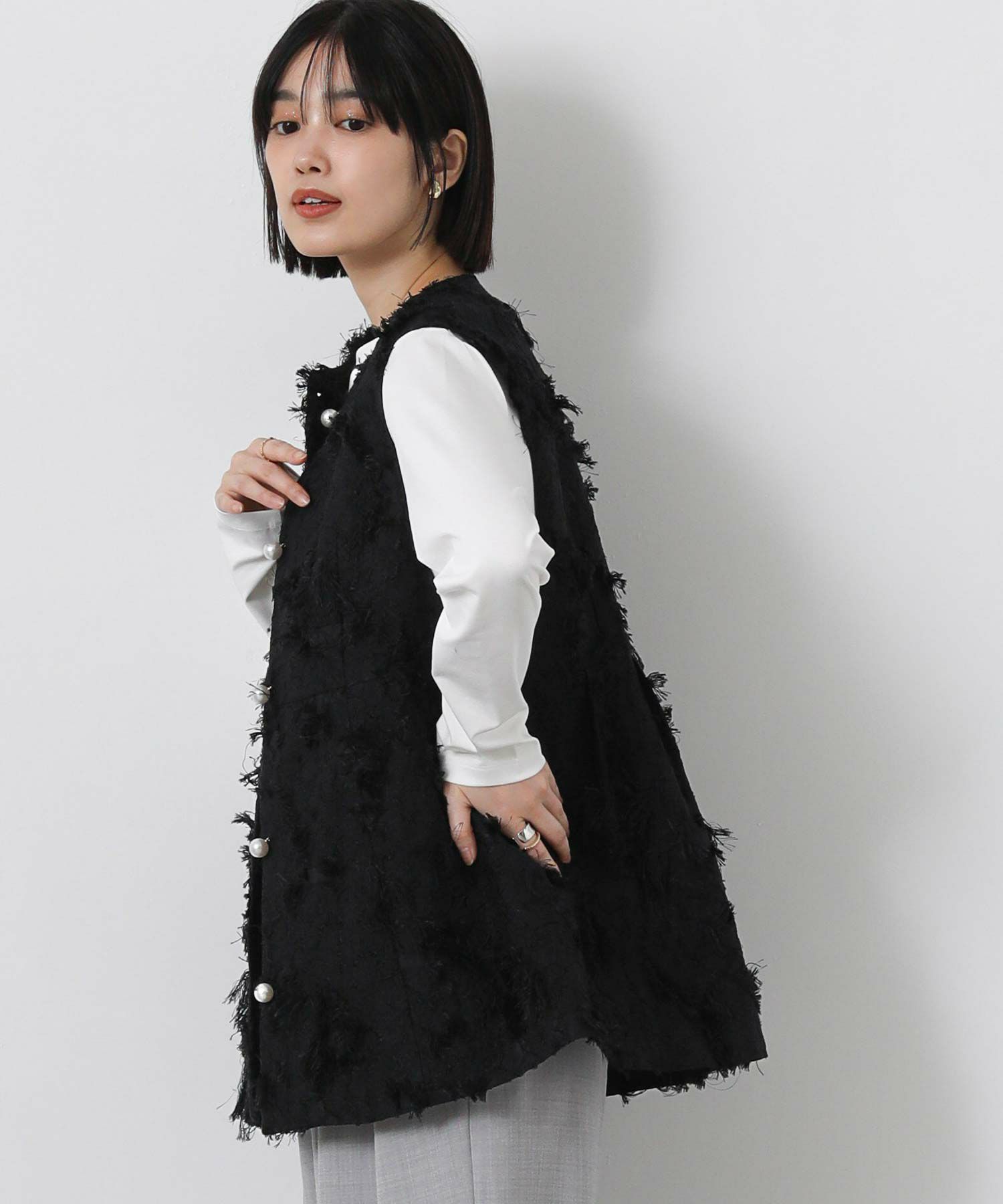 首元はノーカラーにすることで、インナーと合わせやすいデザイン。
