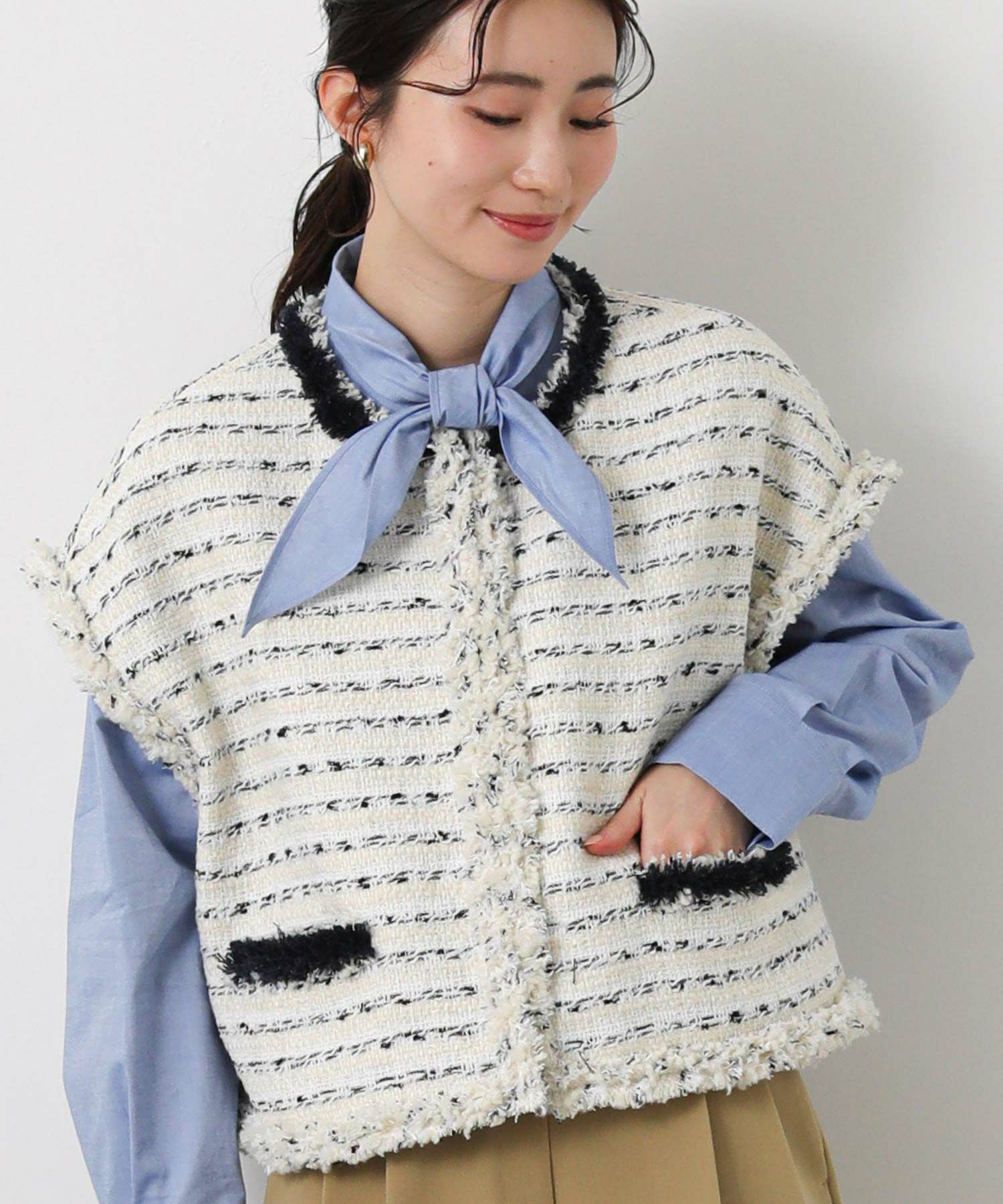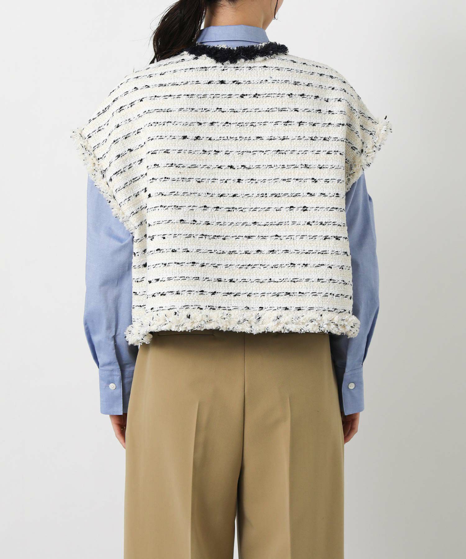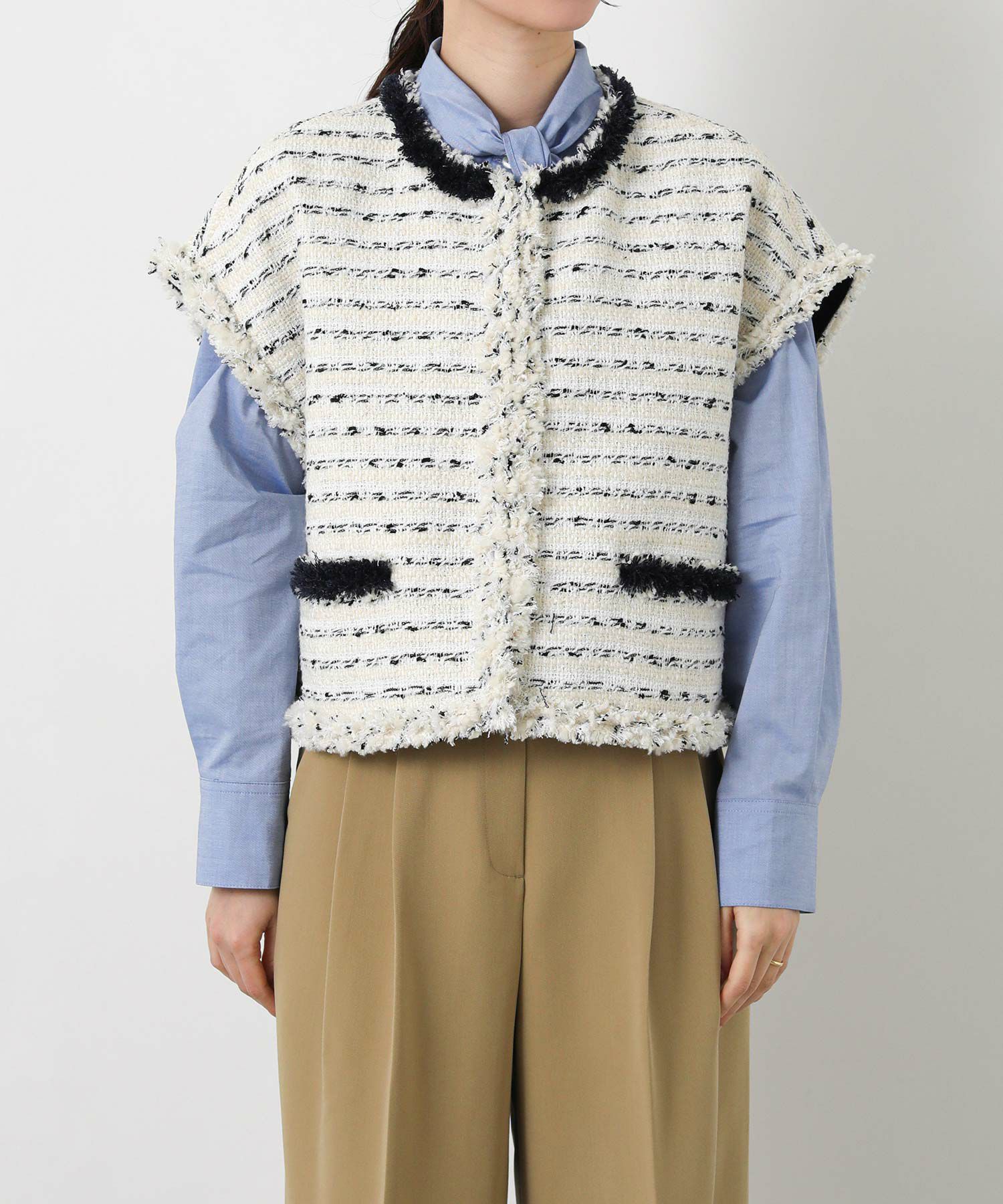 季節を繋ぐアウターとして定番となったジレを、コンパクトなサイジングで新鮮なバランスに仕上げました。