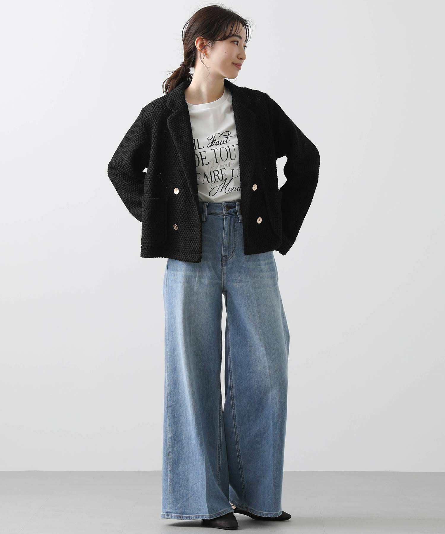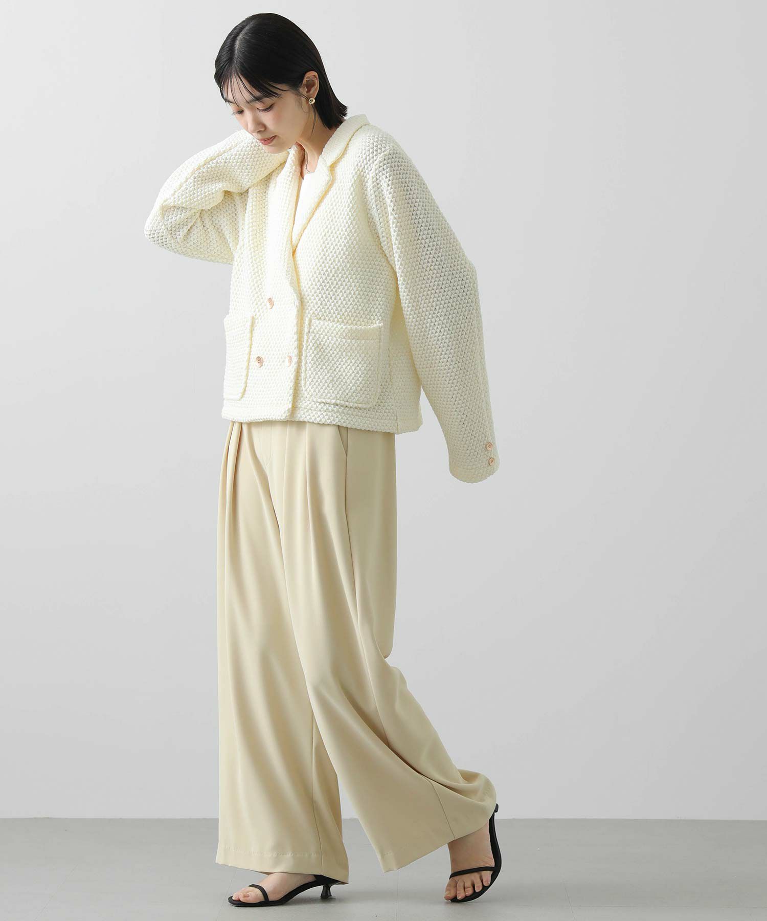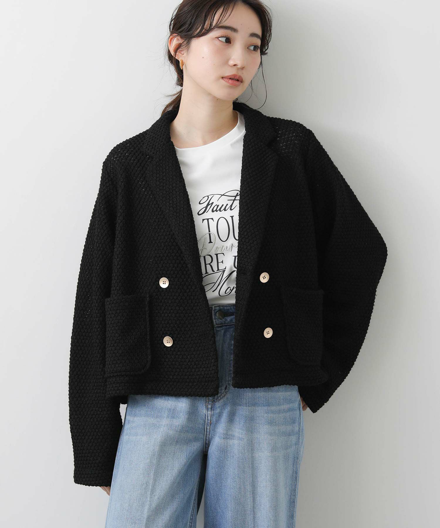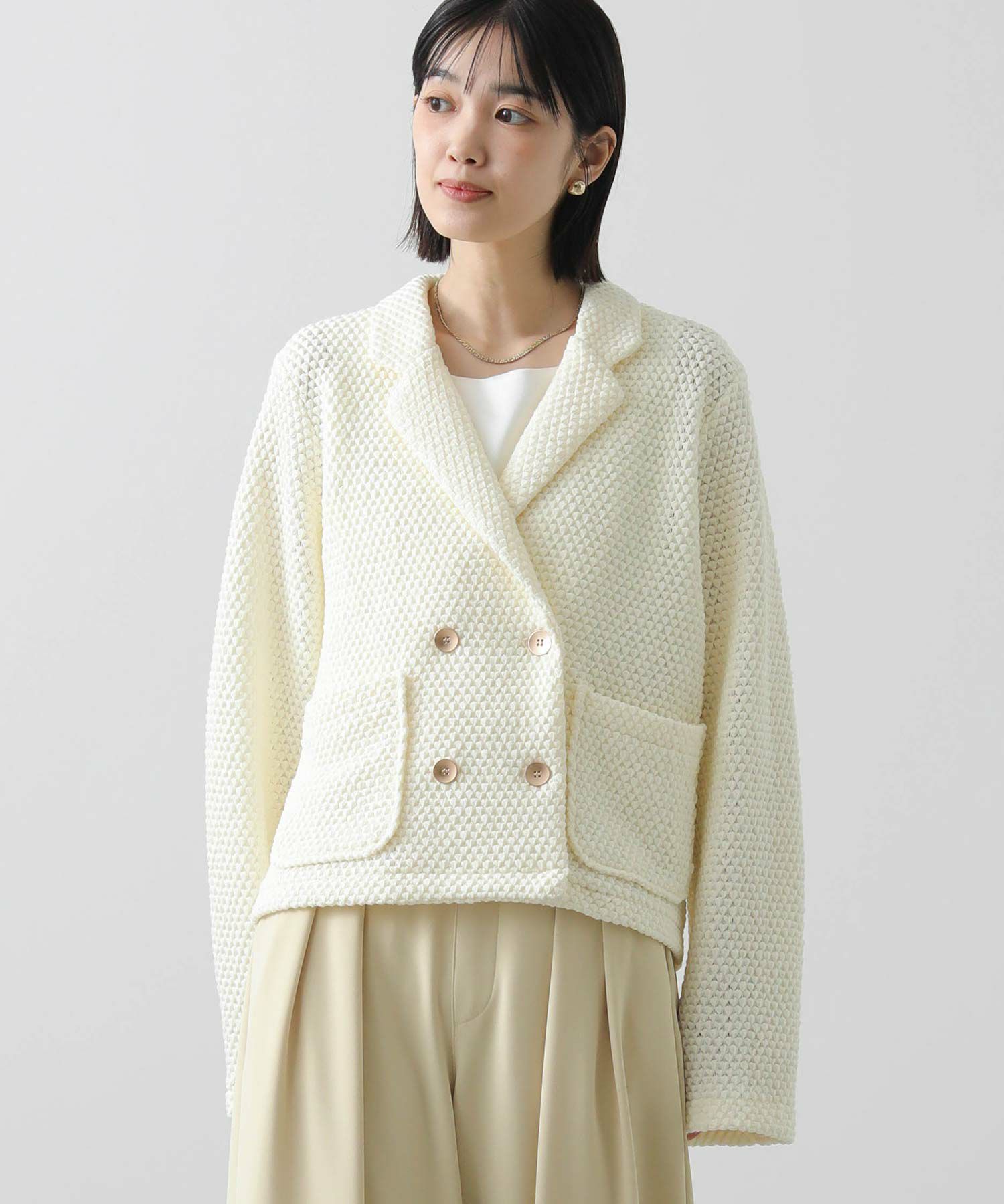 立体感ある生地がしなやかで軽く、着やすい一着です。ダブルボタンの短丈ジャケットでお出かけやオケージョンなどの上品な着こなしから、デニムやジョガーパンツなどのカジュアルなコーデまで、雰囲気を変えながらもしっくりくるとても使えるジャケットです。