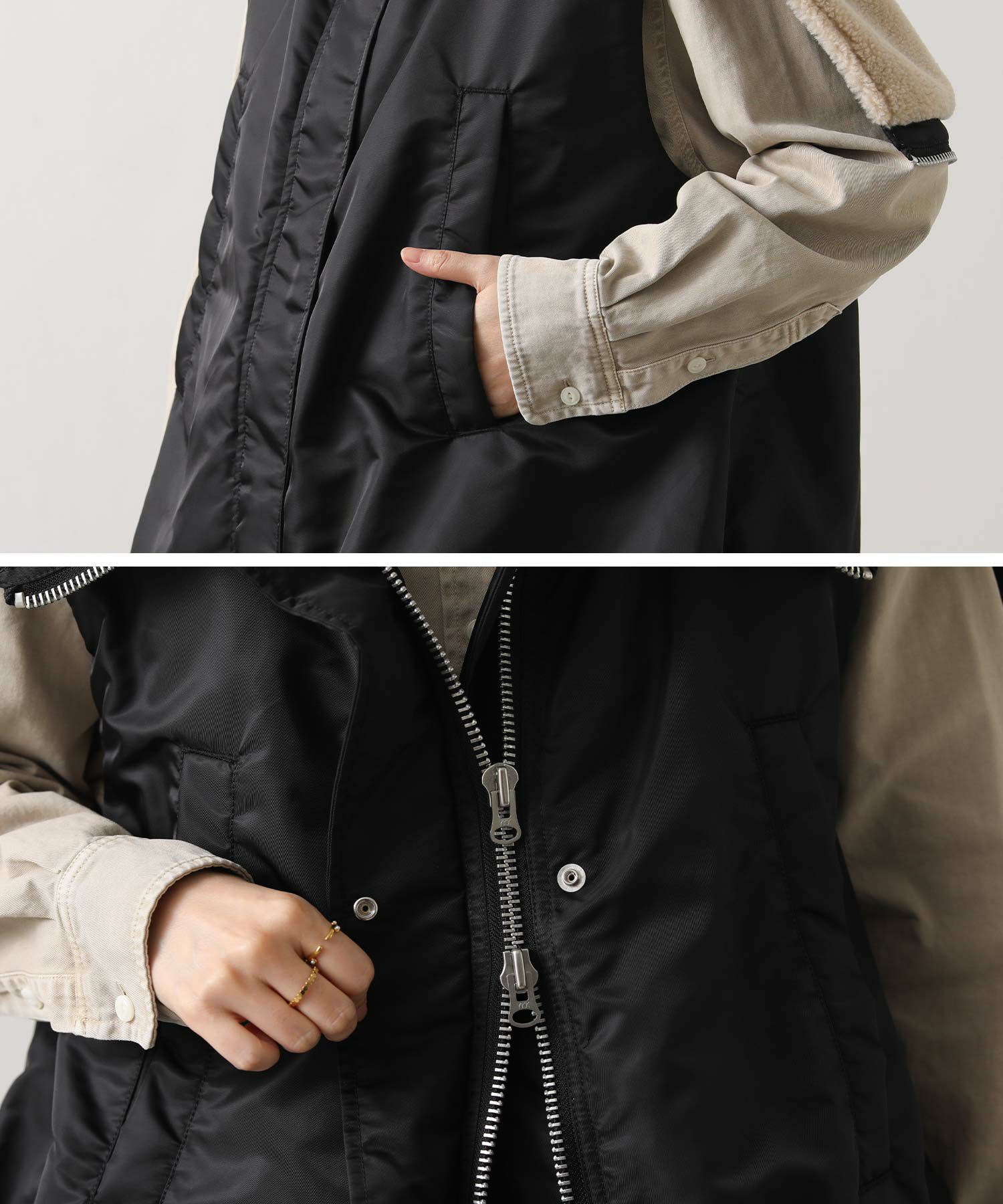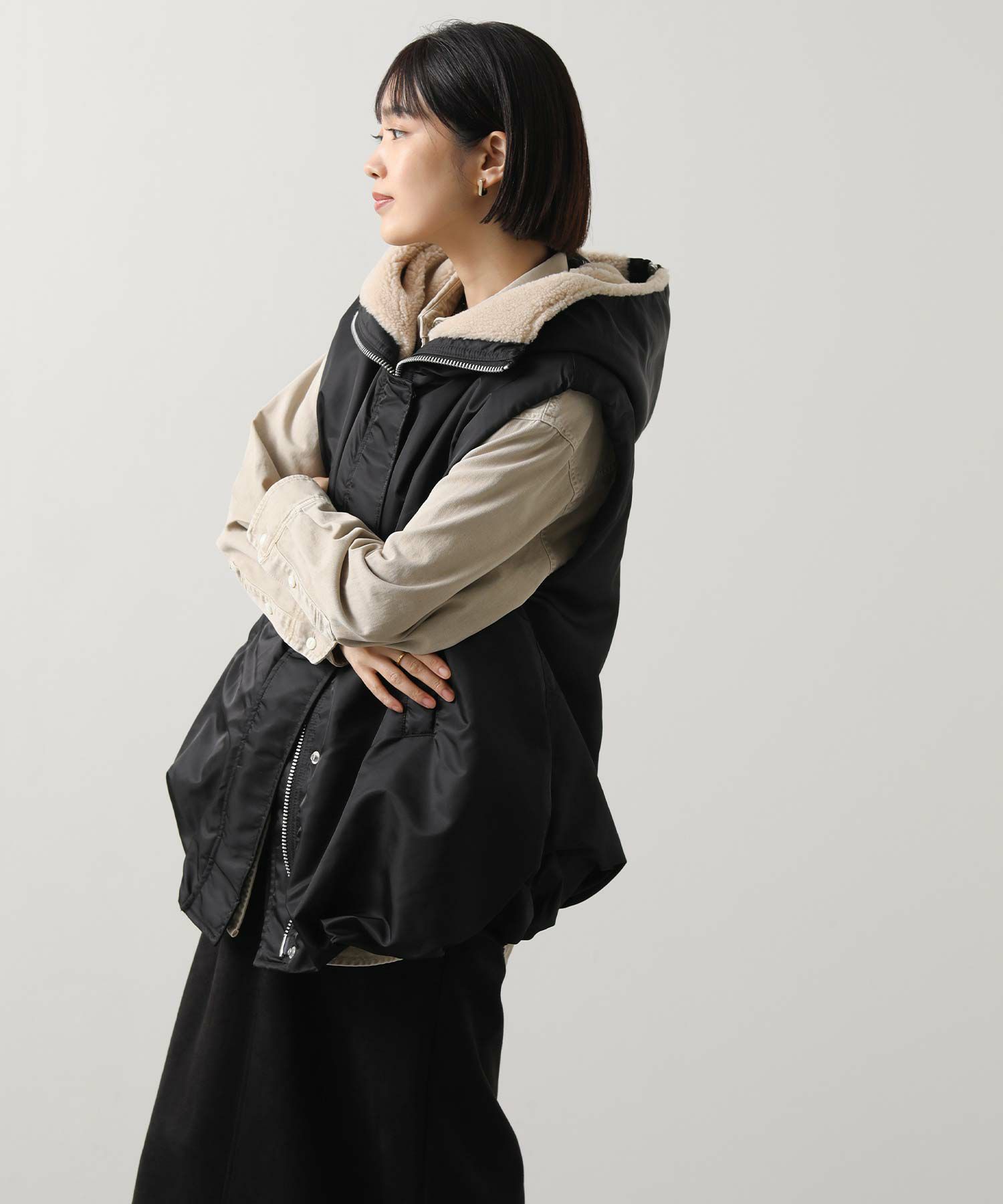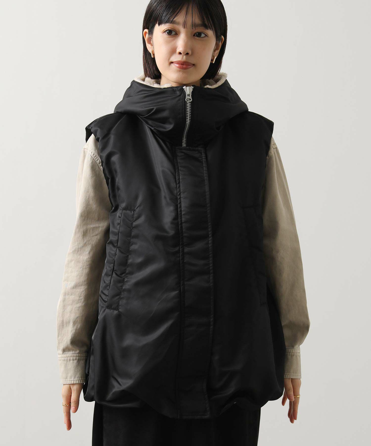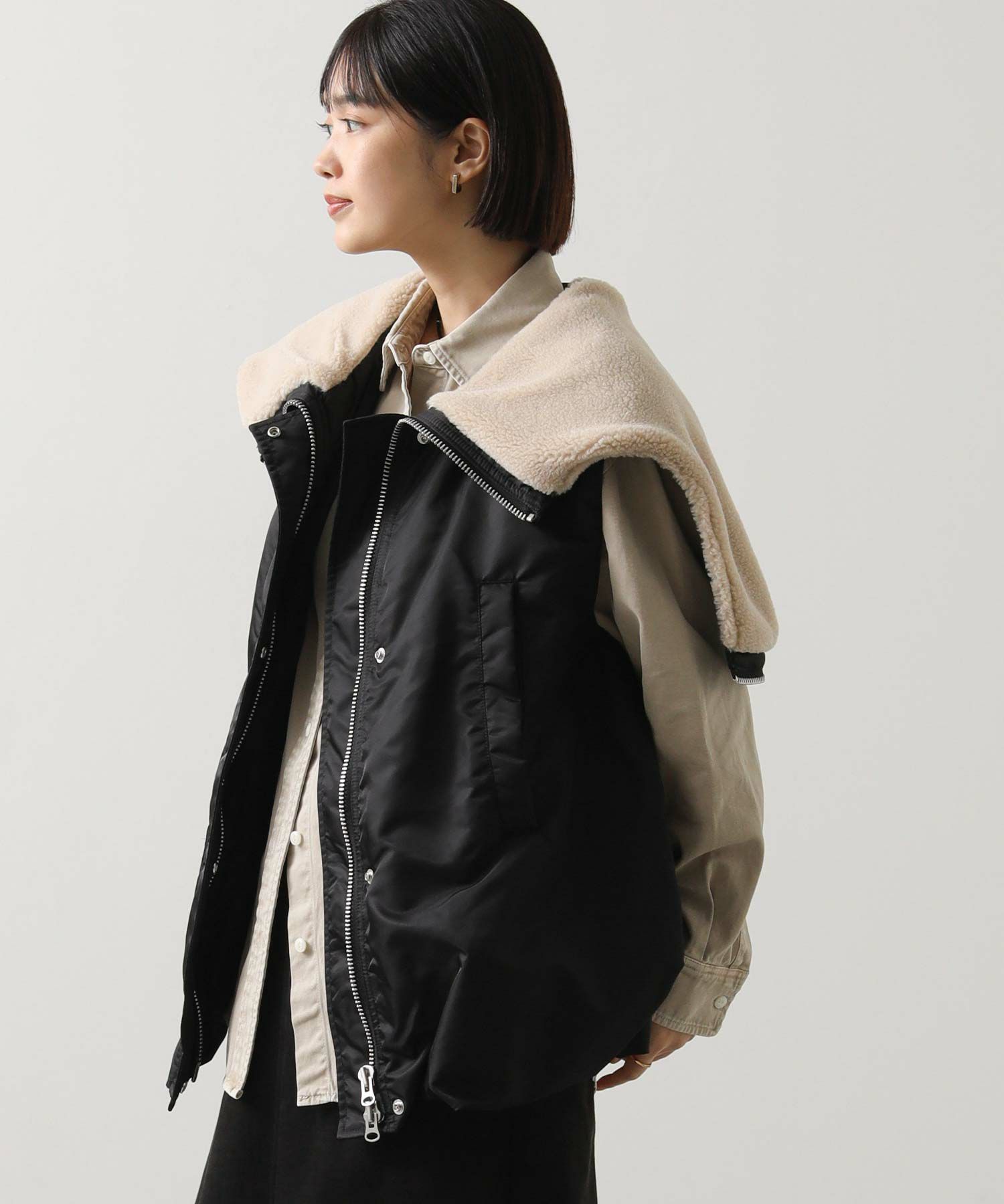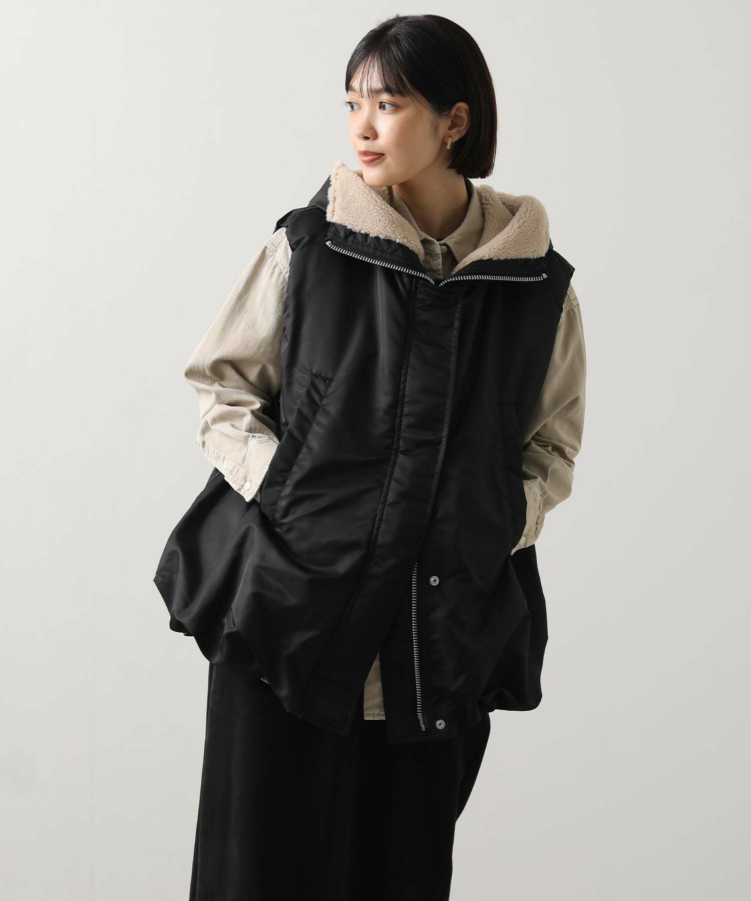 【Munich(ミューニック】から、ミリタリーなデザインを施したナイロン×ボア×中綿のコンビの、丸みあるフォルムで女性らしさを感じられるベストをセレクト。