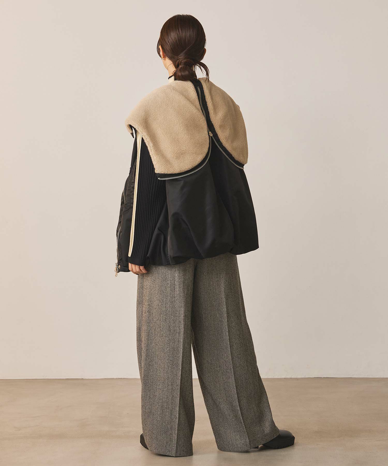 N2BやN3Bなどのフライトジャケットをデザインのベースにしたベストで、コールゴムギャザーとタックによるバルーンヘムでシルエットにアクセントを加えました。