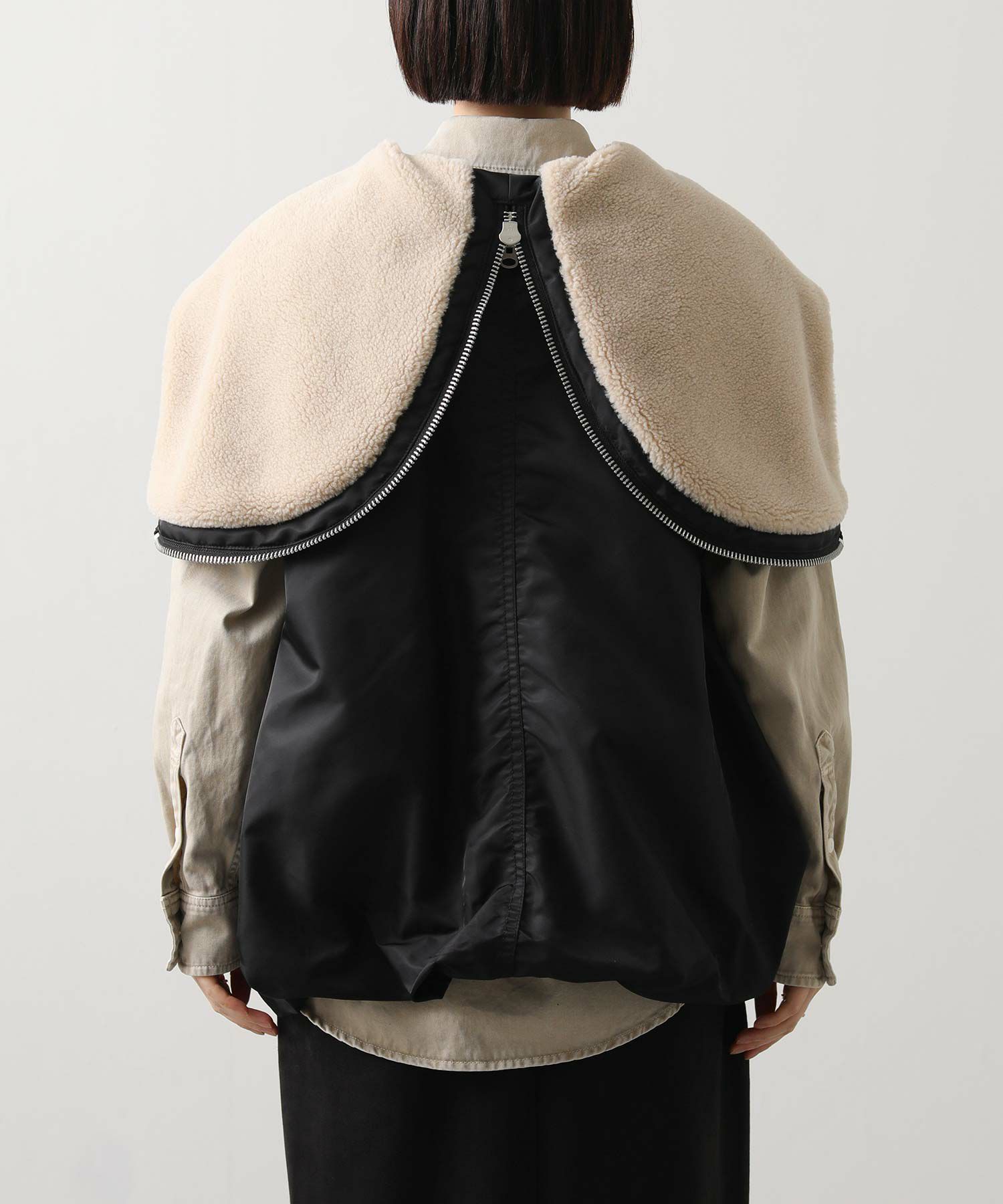 ファスナー付きのスタンドフードはファスナーを大きく開けることでセーラーカラーのように背中側で大きく垂らす着方ができたり、フロントは大型の逆開ファスナー使いなのでスタンドフードは高めに閉じてヘム側は開いたり、着方のアレンジが豊富なアイテムになってます。