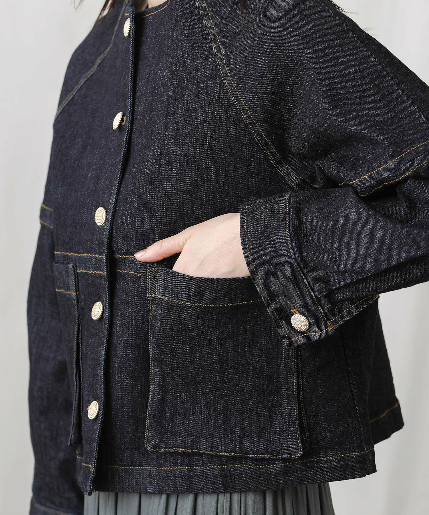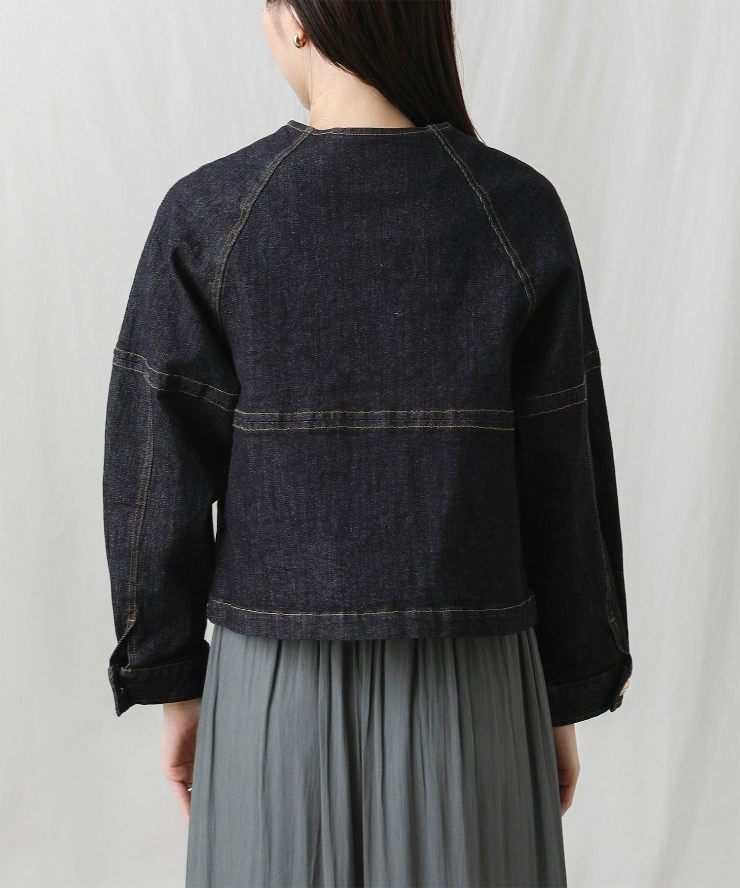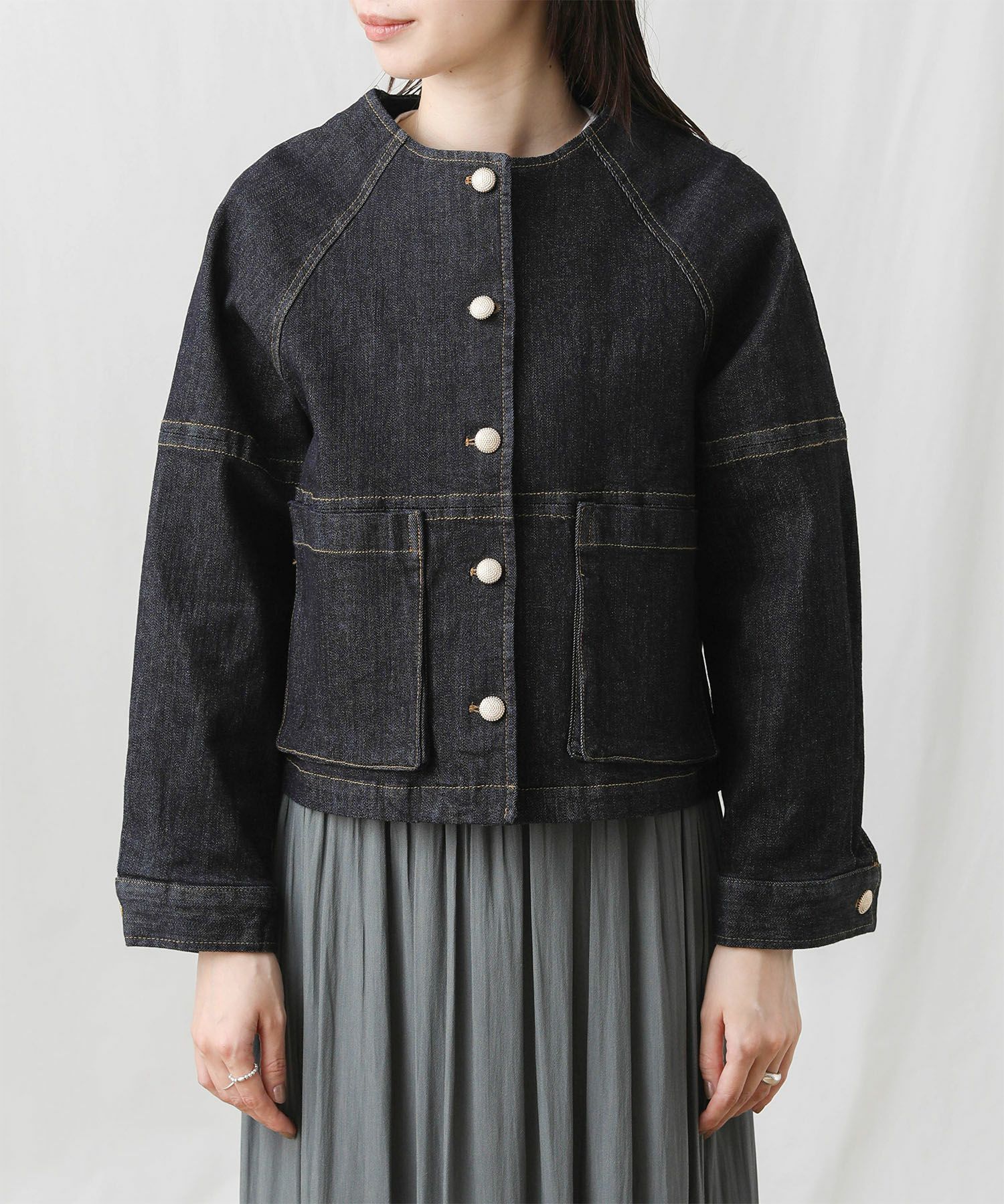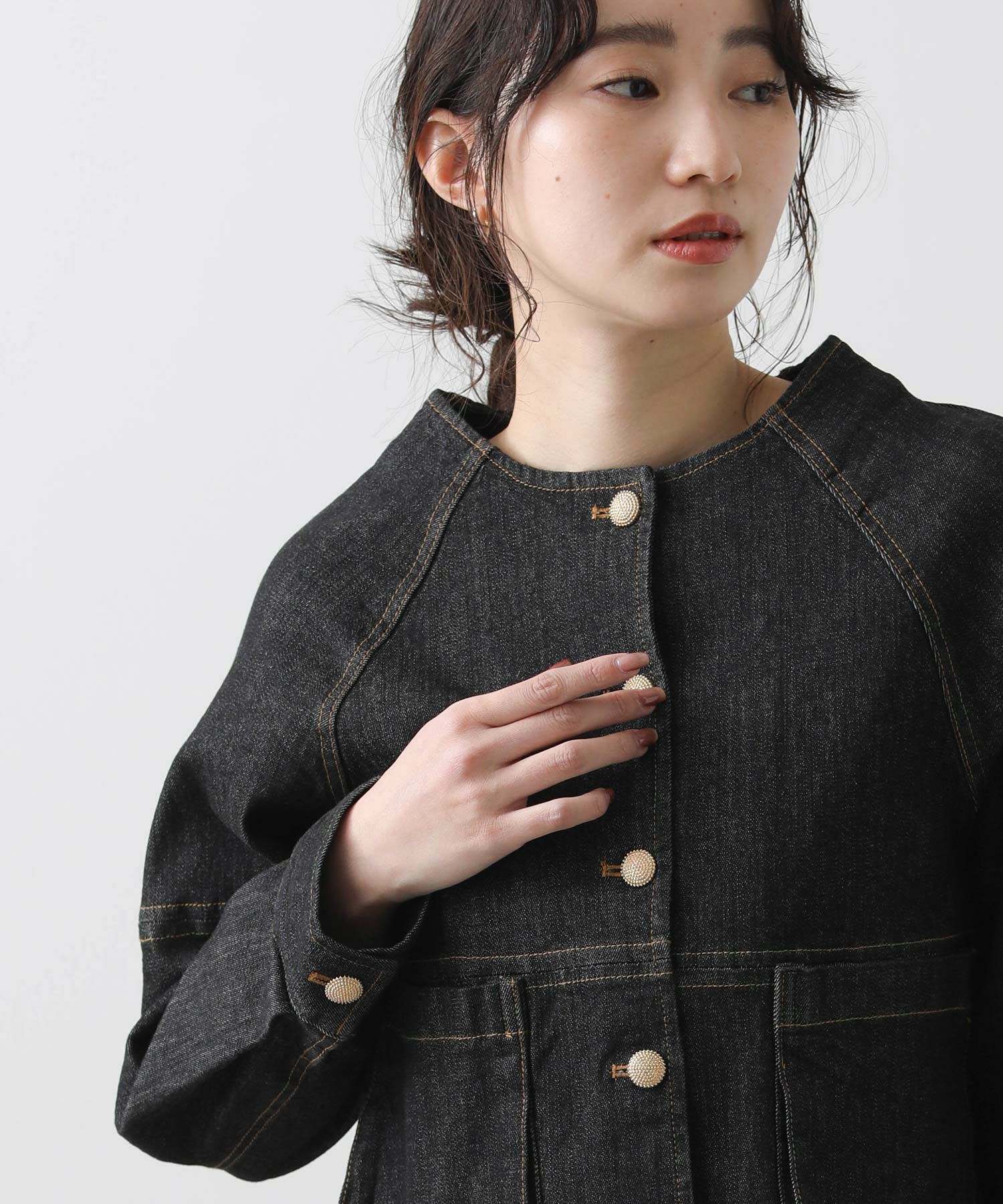 デニムのカジュアル感を楽しみつつ、女性らしい着こなしにもマッチするノーカラーデニムジャケット。