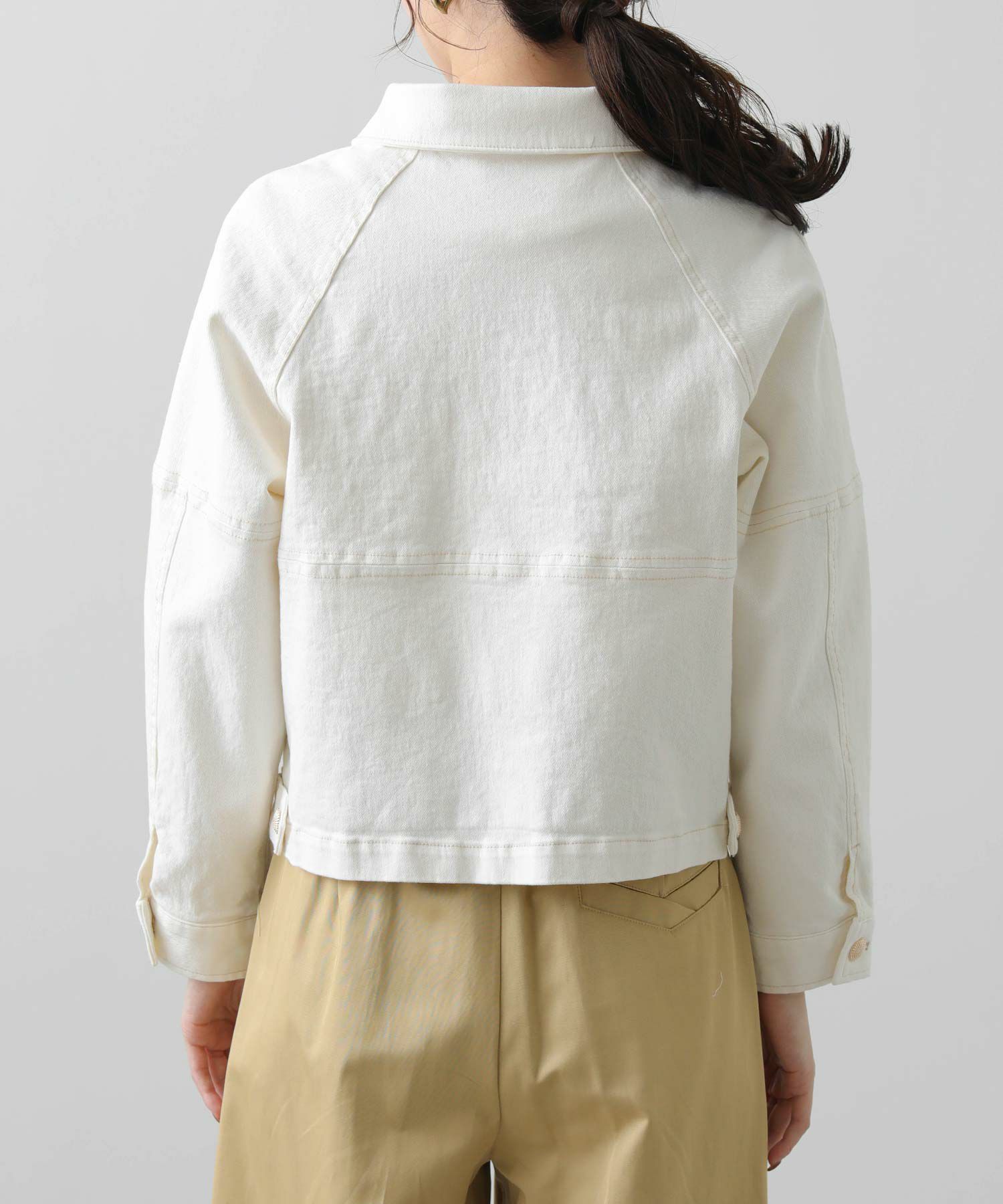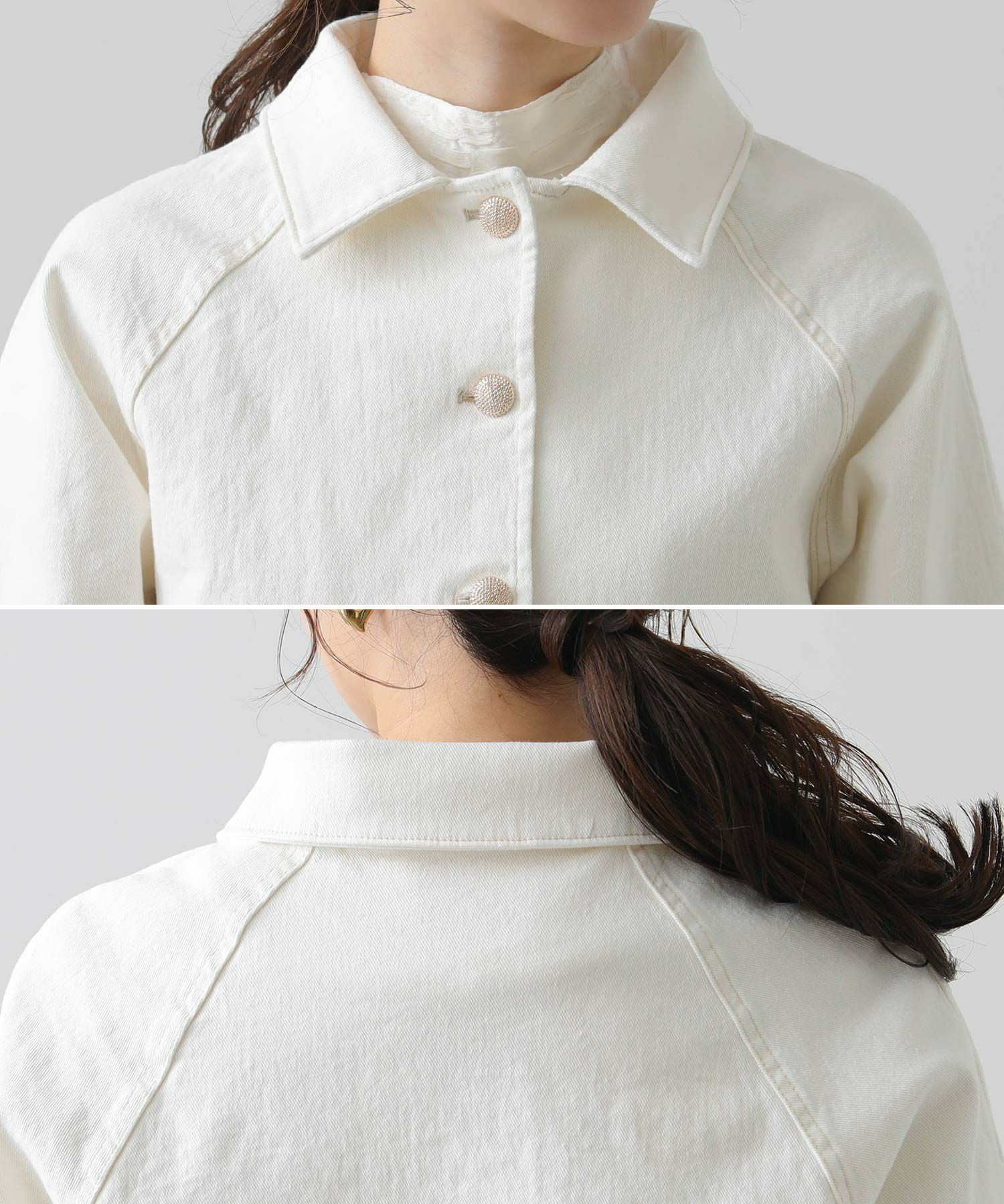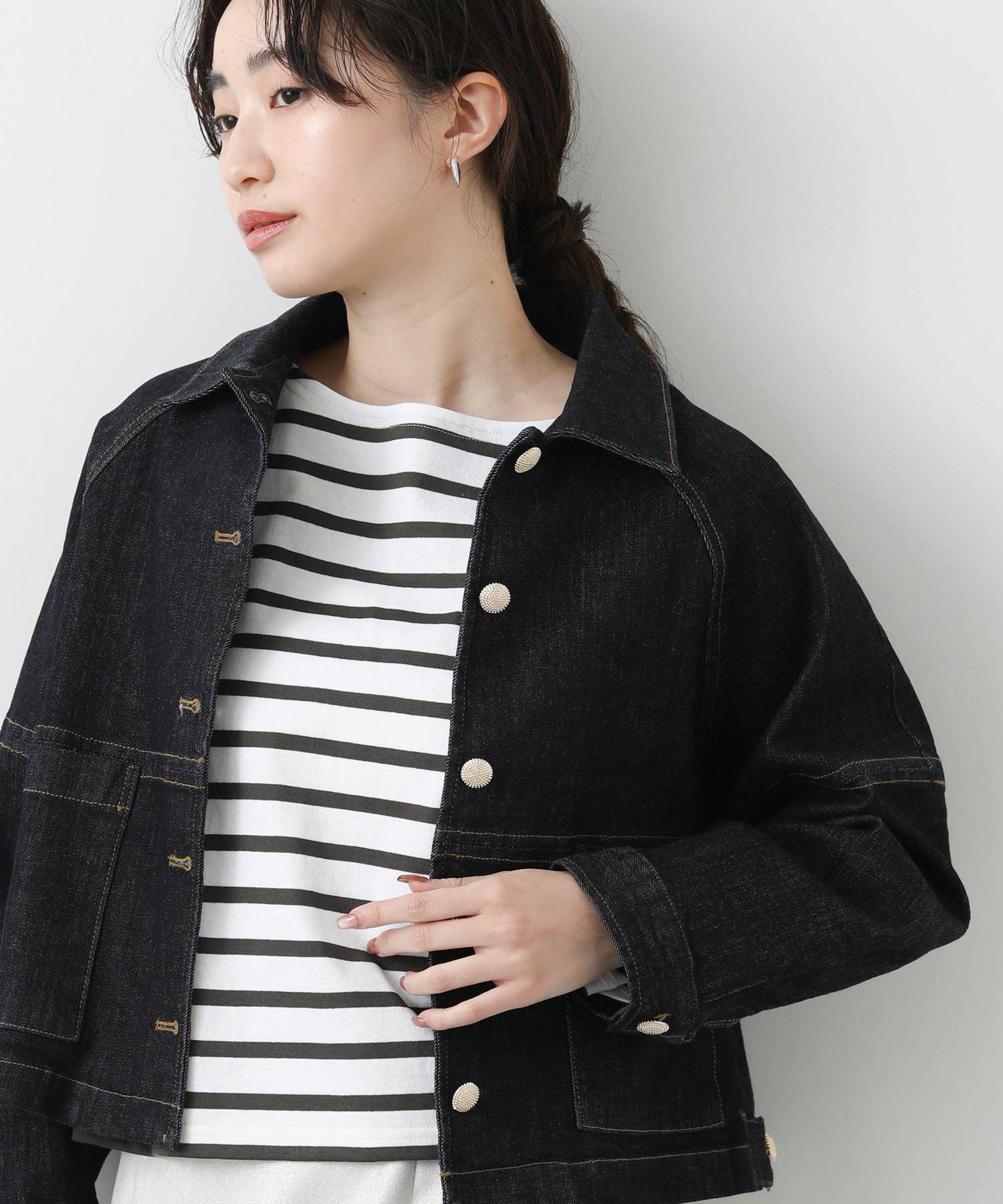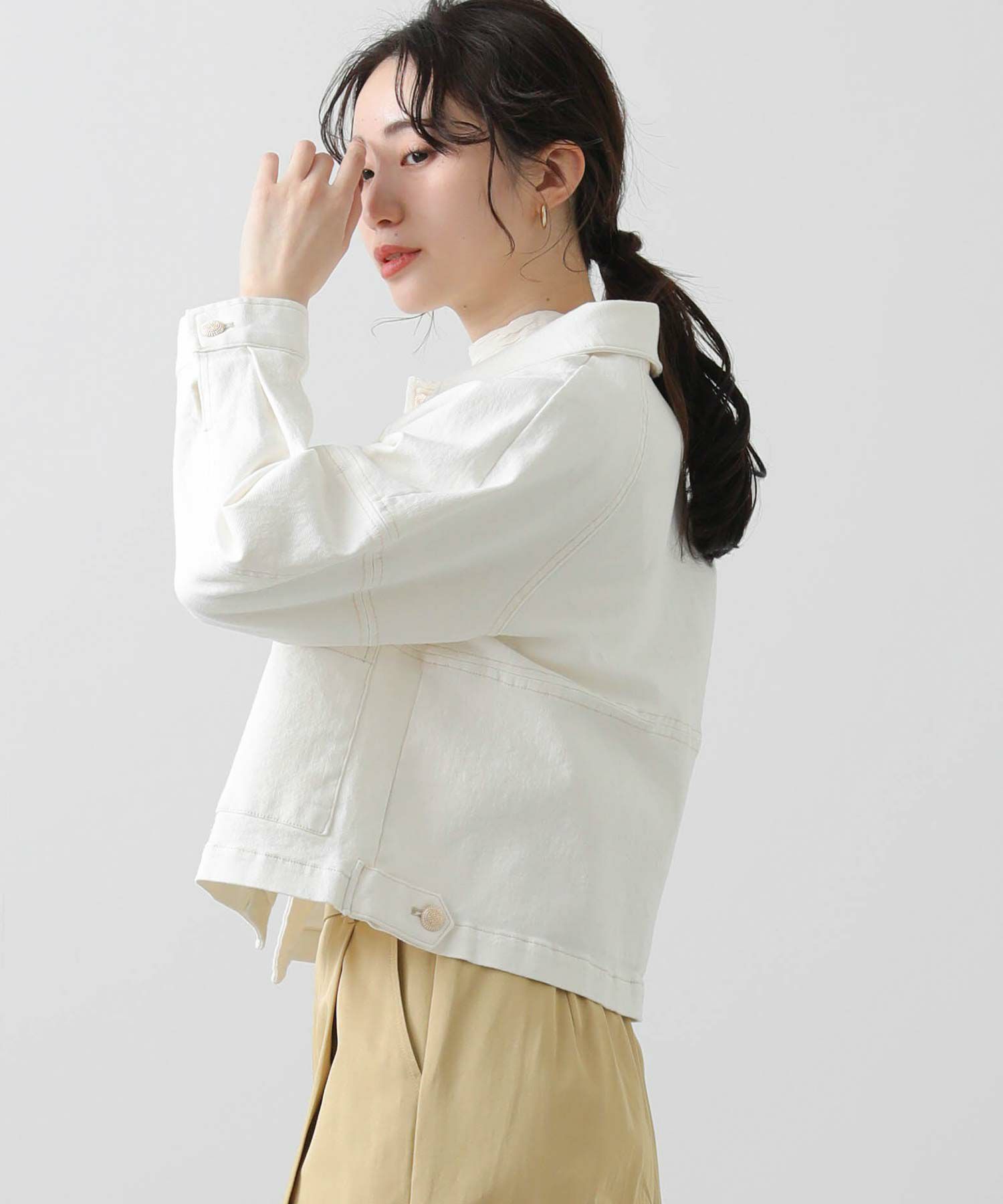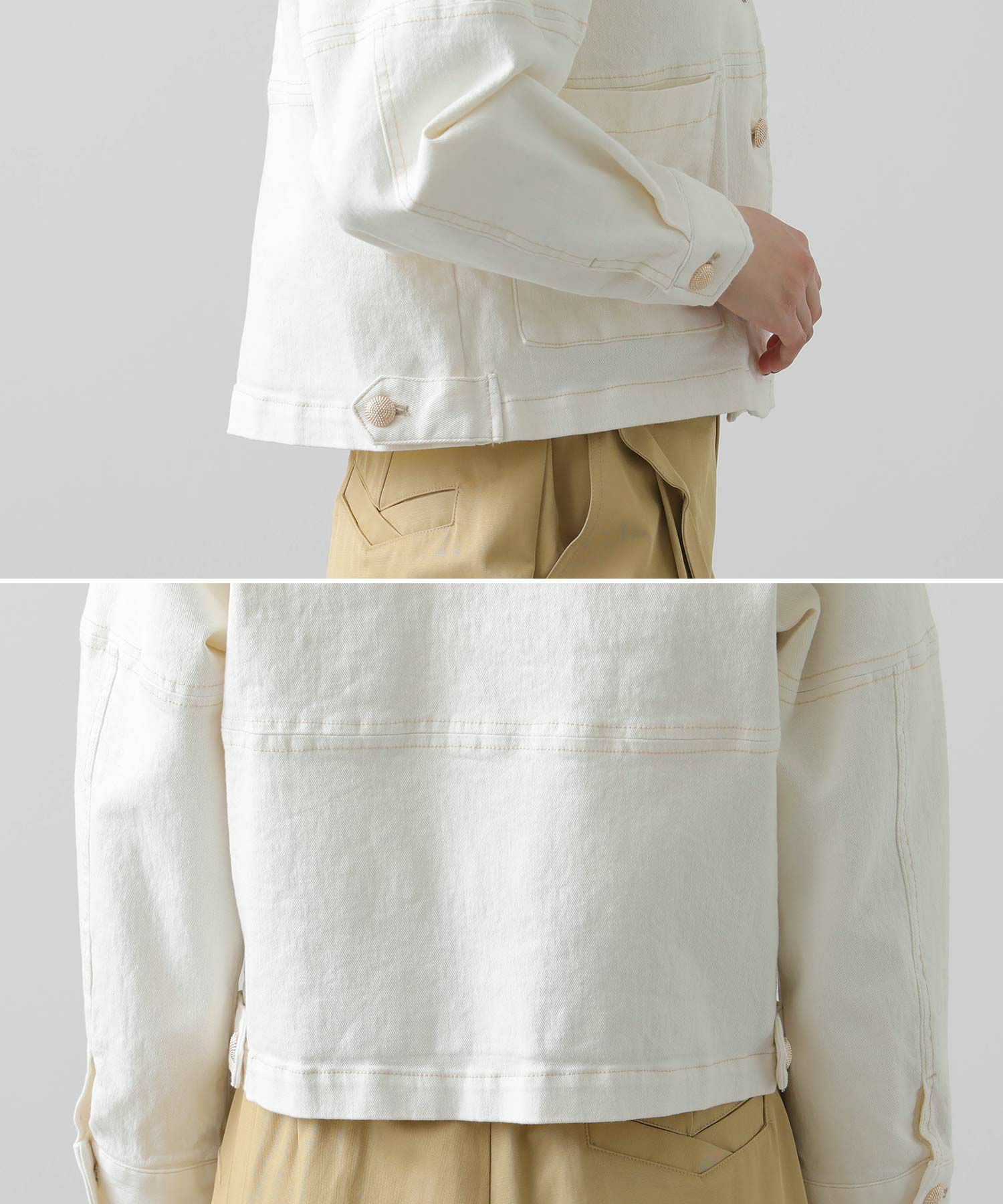 デニムのカジュアル感を楽しみつつ、女性らしい着こなしにもマッチするGジャン。襟付きだと、前を開けて着た時にサマになります。存在感のあるゴールド釦や配色ステッチがポイントでシンプルになり過ぎず、ストレッチが効いているので着心地が良いのも特徴です。