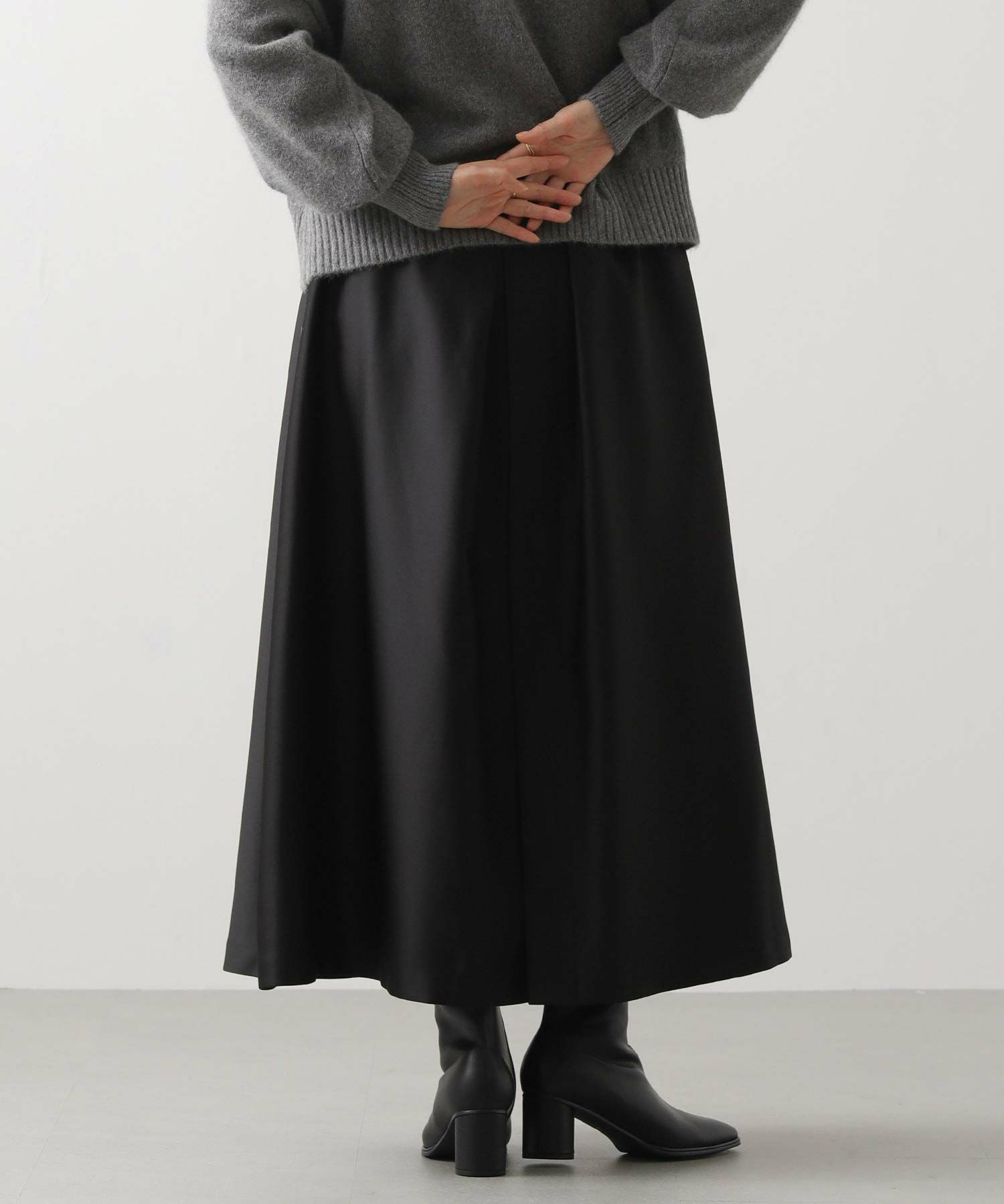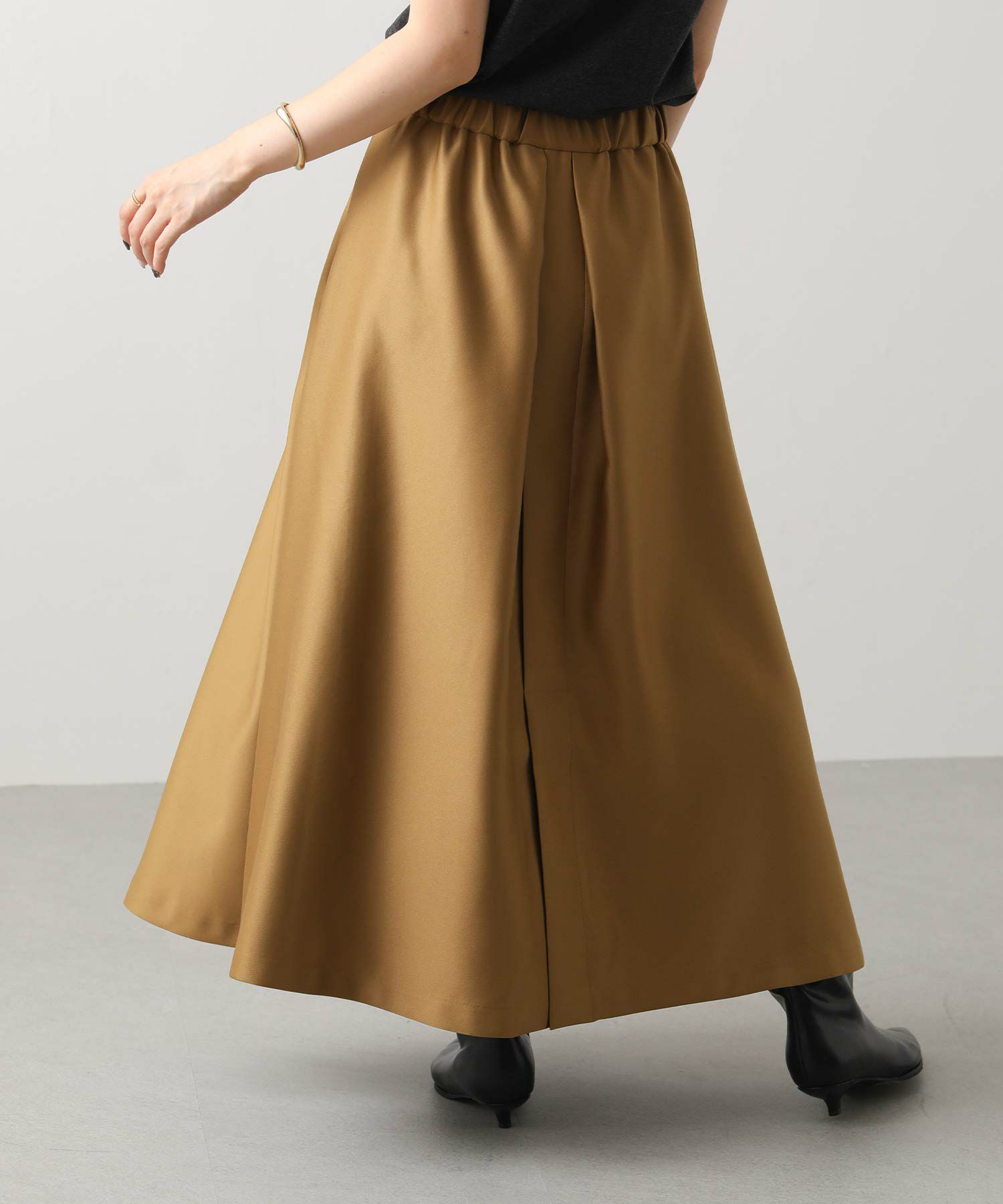大胆なタックデザインが印象的、後ろ側のフレア分量が多いので、歩いた時の動きが美しいシルエットに。