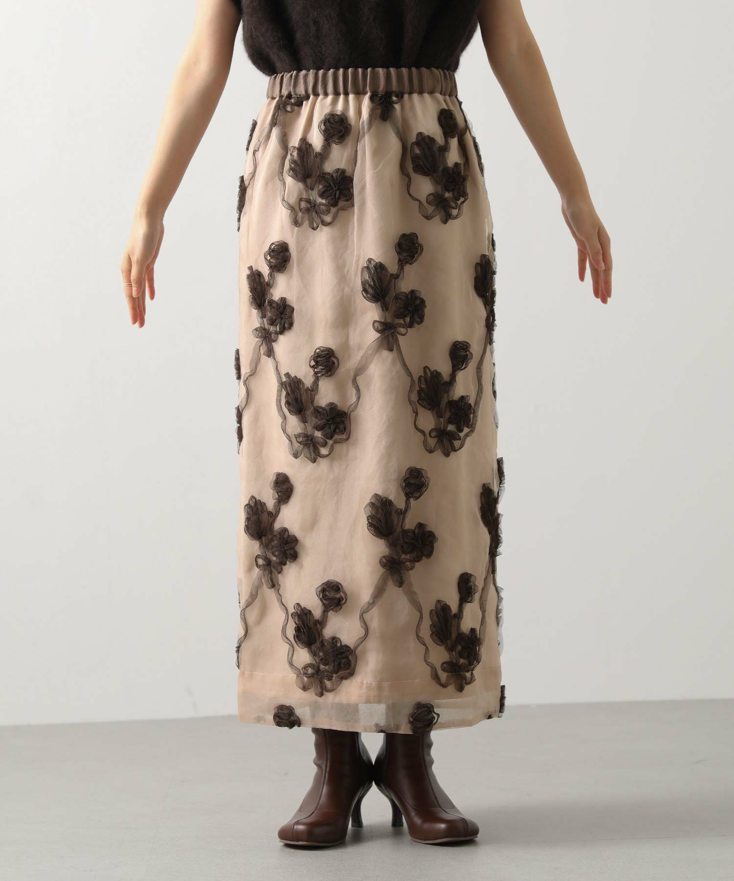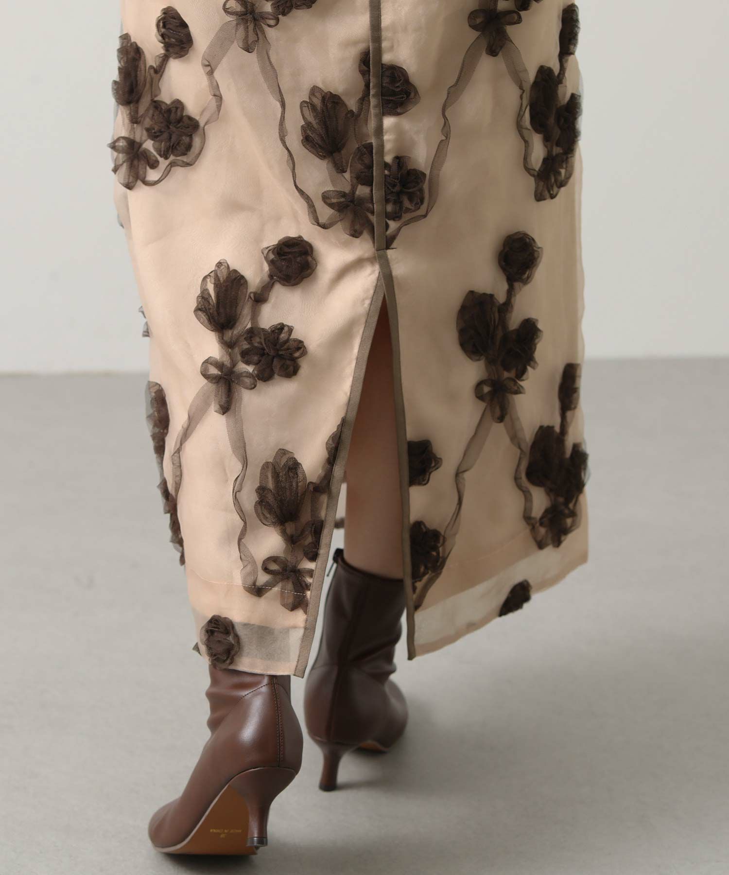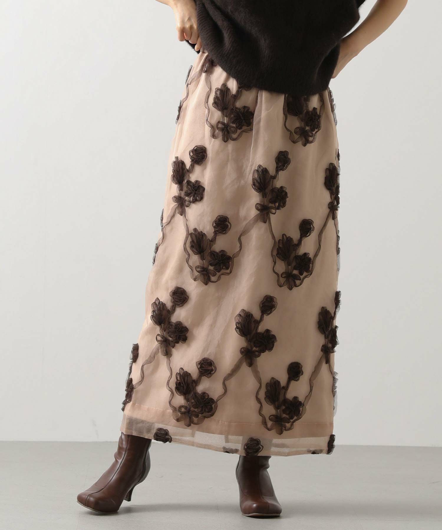 オーガンジーにチュールで刺繍を施した立体感のある素材が、スタイリングにアクセントをつけてくれます。ウエストはグログランテープを使用して、インスタイルも決まるデザインになっています。