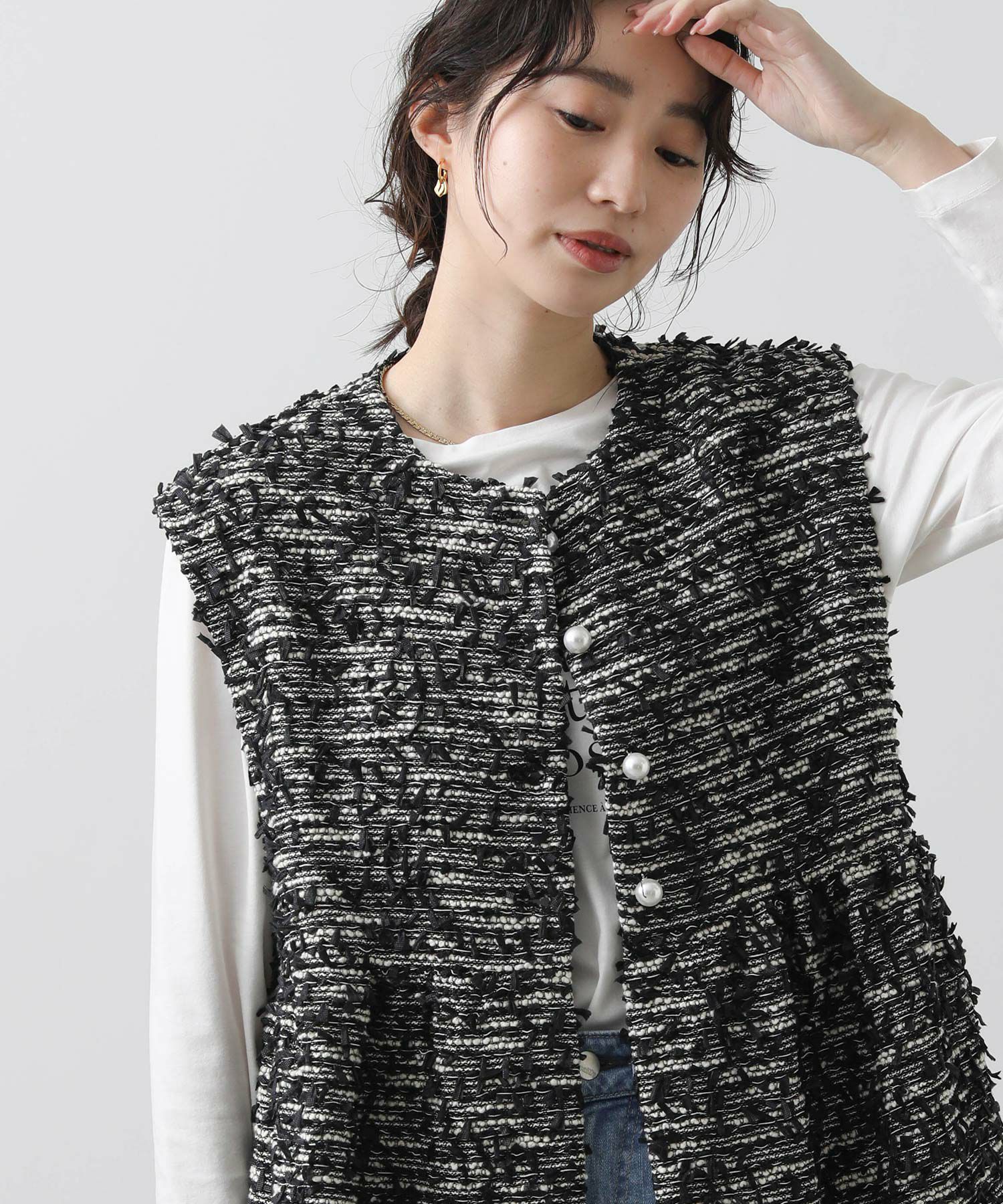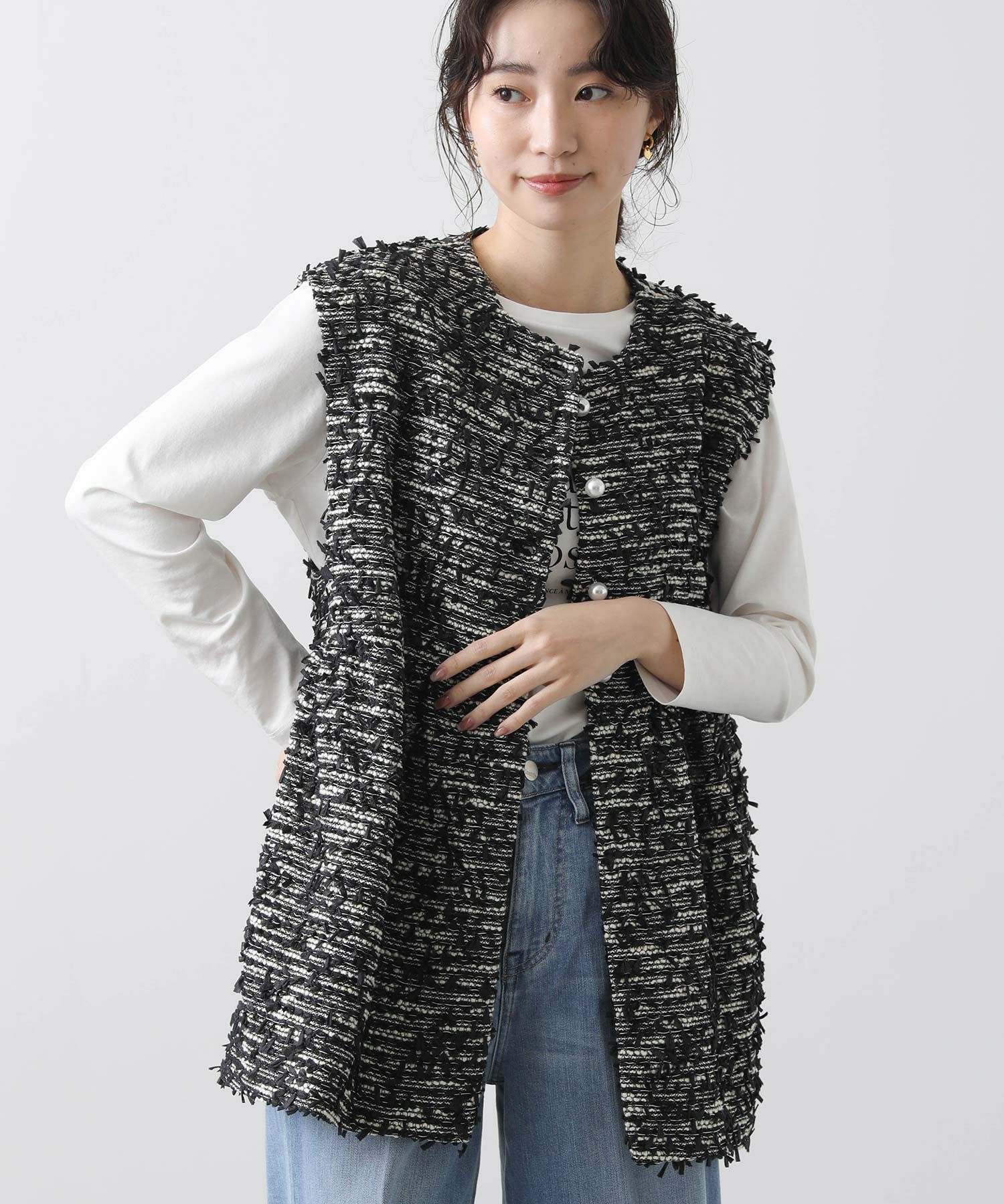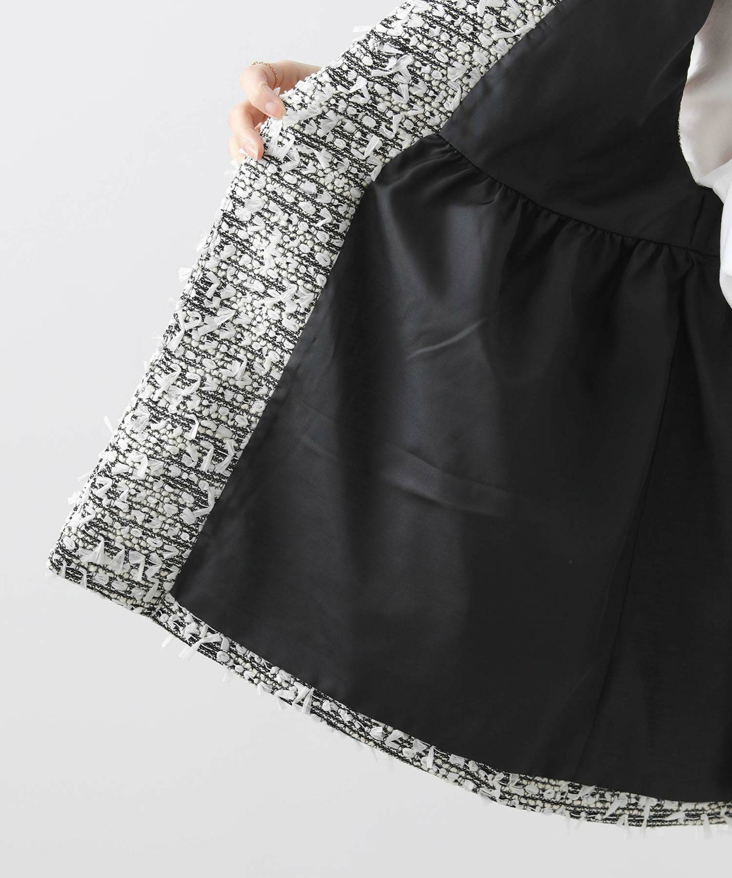 今季のLUSTEEK一押し!トレンドのリボンテープ使いがかわいいツイードベスト。オケージョンからカジュアルまで様々なシーンで着まわせて、1枚羽織るだけでパッと華やかな印象に仕上がります。