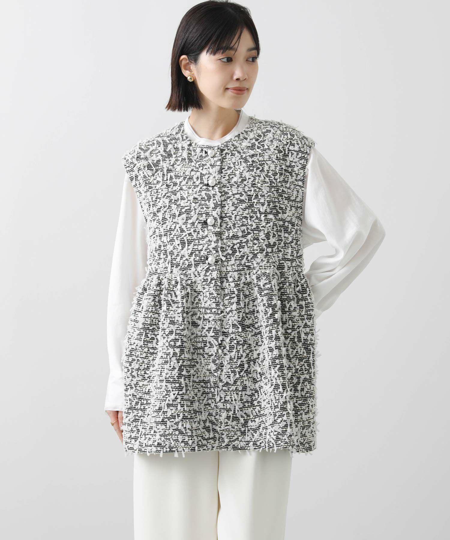 4つ並んだ大き目のパール釦が着こなしのアクセントに。腰回りがカバーできる着丈とスタイルアップ効果のあるペプラムシルエットがこだわりポイントです。