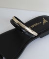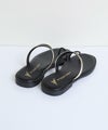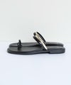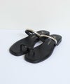 肌面積の多いヌーディーなルックスが、抜け感たっぷりのフラットサンダル。トングに乗せたメタルモチーフが、アクセサリーのような華やぎをプラスします。アッパーのベルトが2本あり、しっかり固定されるのも嬉しいポイントです。重く見えがちなロング丈のボトムに合わせるだけで、女性らしさが高まる逸品です。