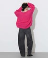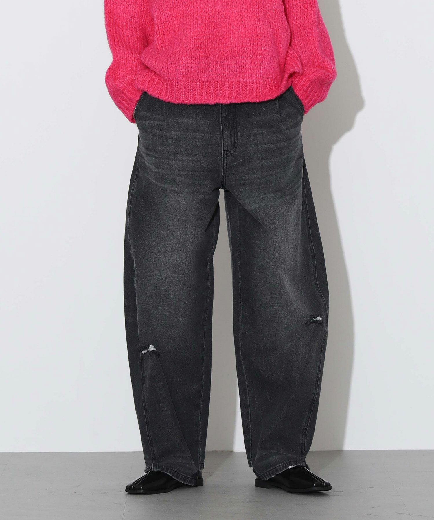 正面に向かってカーブを描くことで、膝辺りで膨らむ自然なコクーンシルエットになるように設計されたユニークなデニム