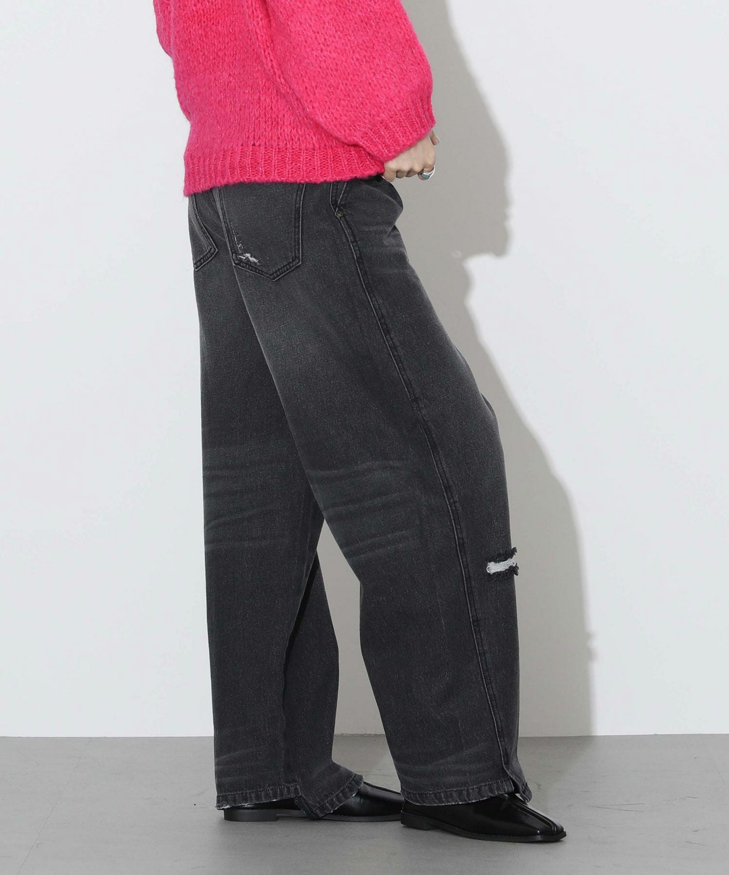 ゴワつかない程度の厚みに設定された11.5オンスデニムを使用。ヴィンテージのような色合いとダメージ加工によって、味のある佇まいに仕上げられています。バックポケットやフロントに施したさりげないダメージ加工がアクセントに。裾脇に入ったスリットは足の甲に乗って開くようにデザインされているため、ボリュームのある靴を合わせても綺麗なシルエットが損なわれません。 また、パンツの裾を引きずらないように前は長く、後ろは少し短めに設定されています。1年を通して着用しやすい程よい厚みなので、様々なアイテムとのコーディネートをオールシーズンお楽しみいただけます。