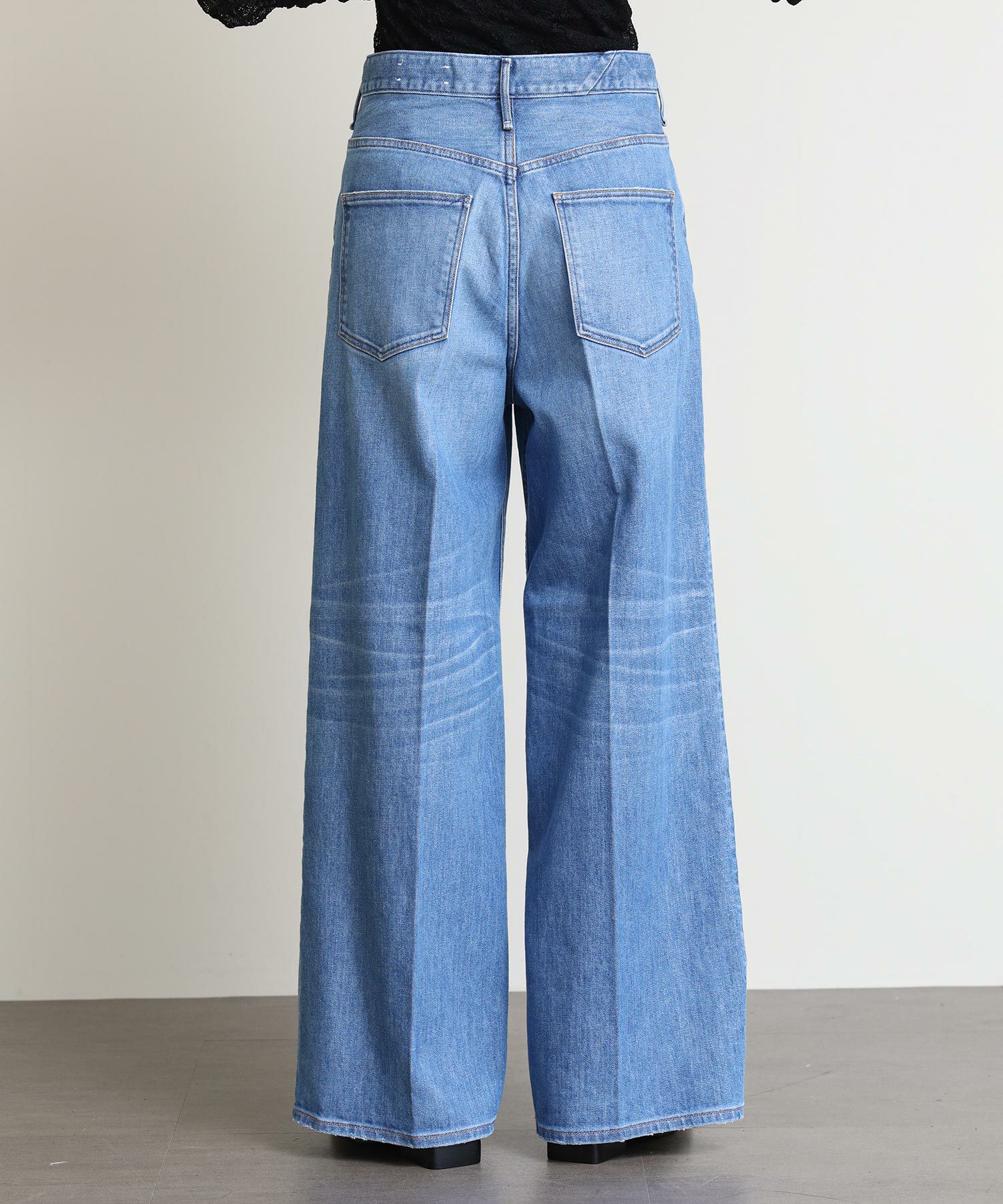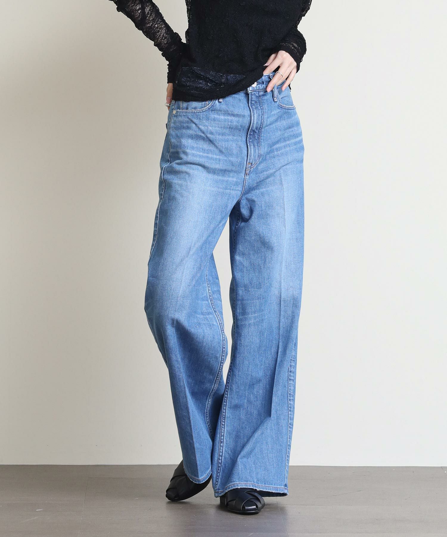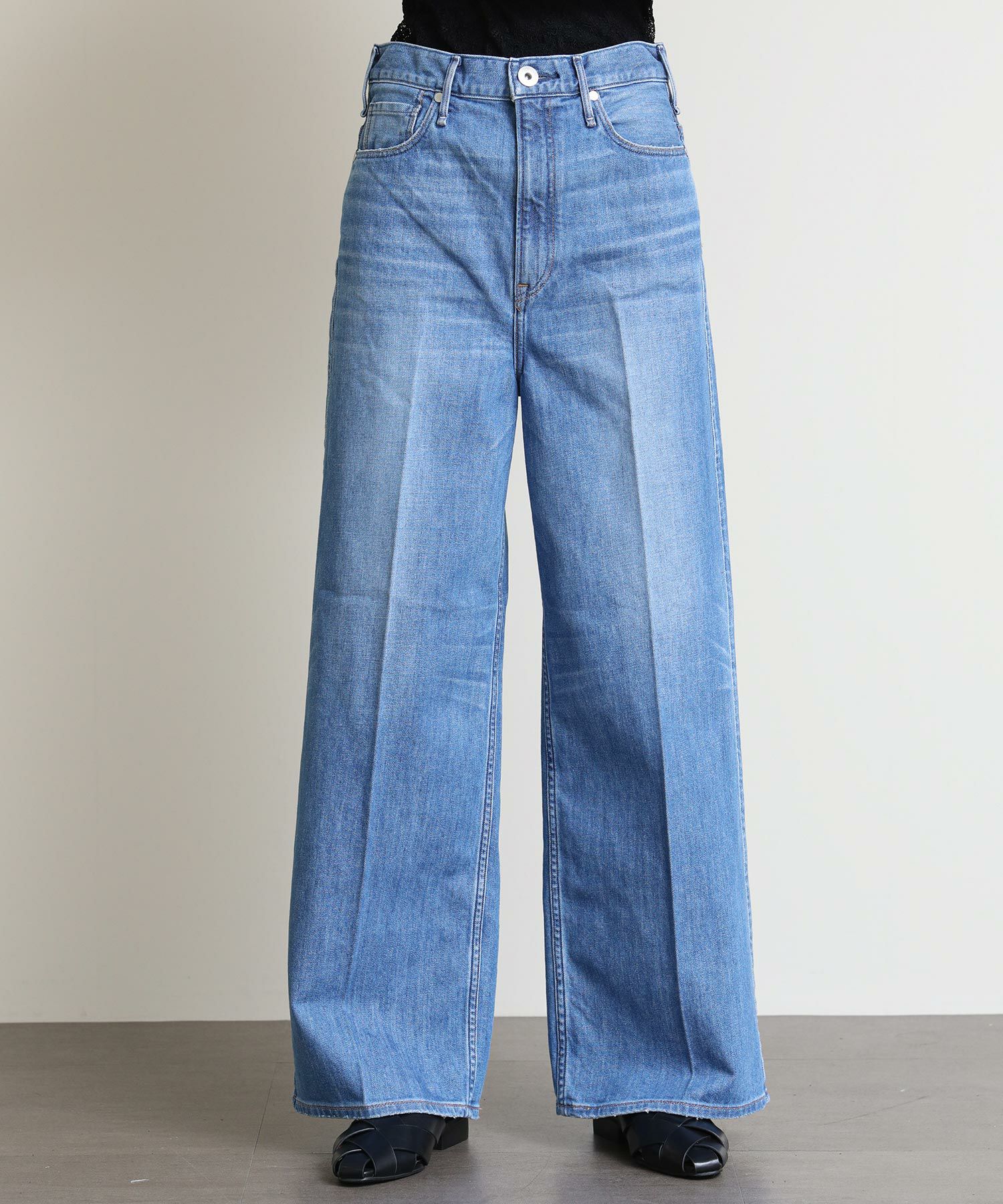 ウエスト周りはすっきりとさせたハイライズ、膝や裾は大きく取ったupper hightsの中で最もワイドなストレートデニム。センタープレスを入れたことによりトレンドのワイドシルエットをきれいめにご着用いただけます。デニムらしいオーセンティックな表情のノンストレッチデニム地採用。茶綿を使用していないのでくすみのないきれいなインディゴブルーが特徴。
